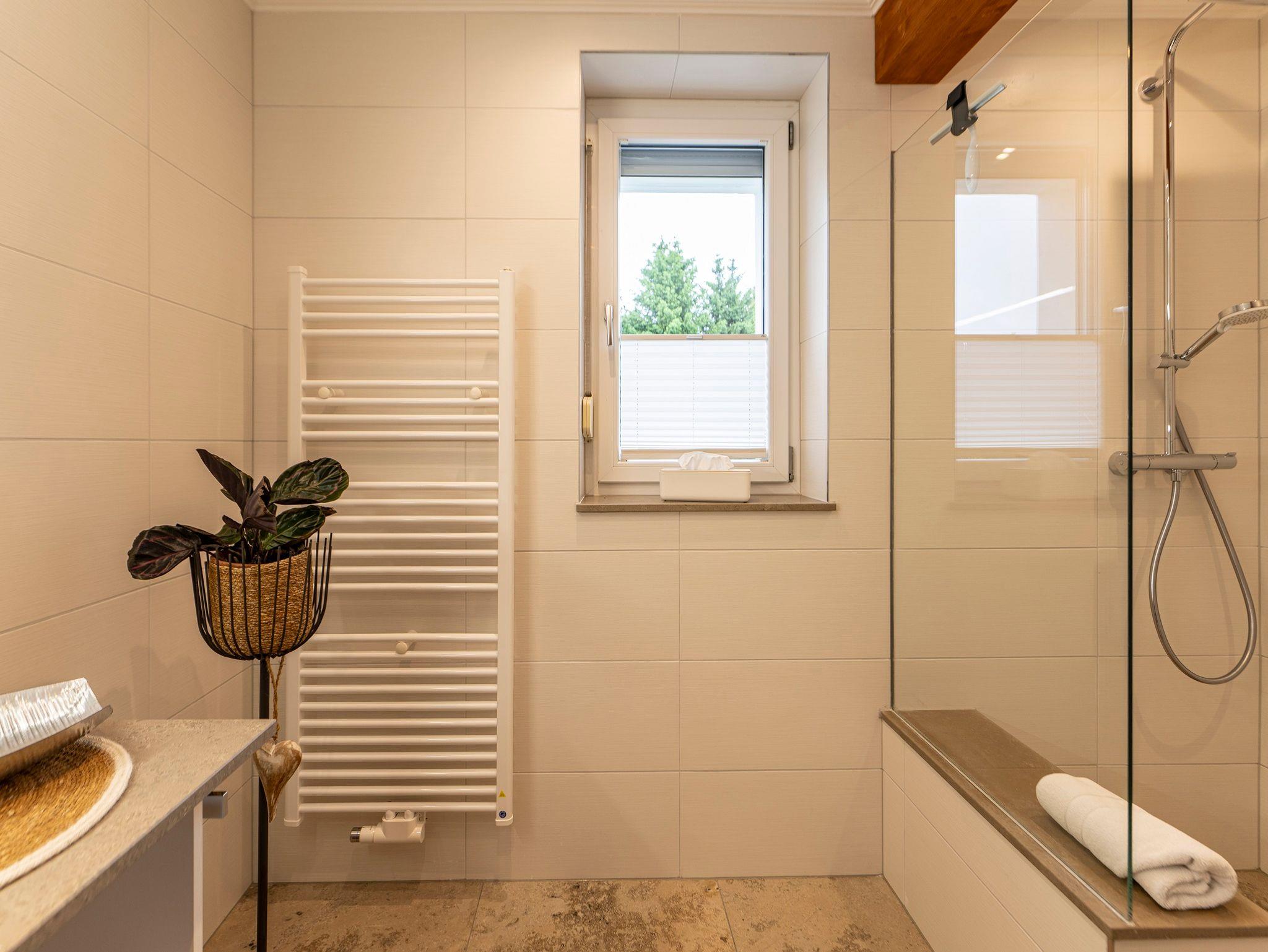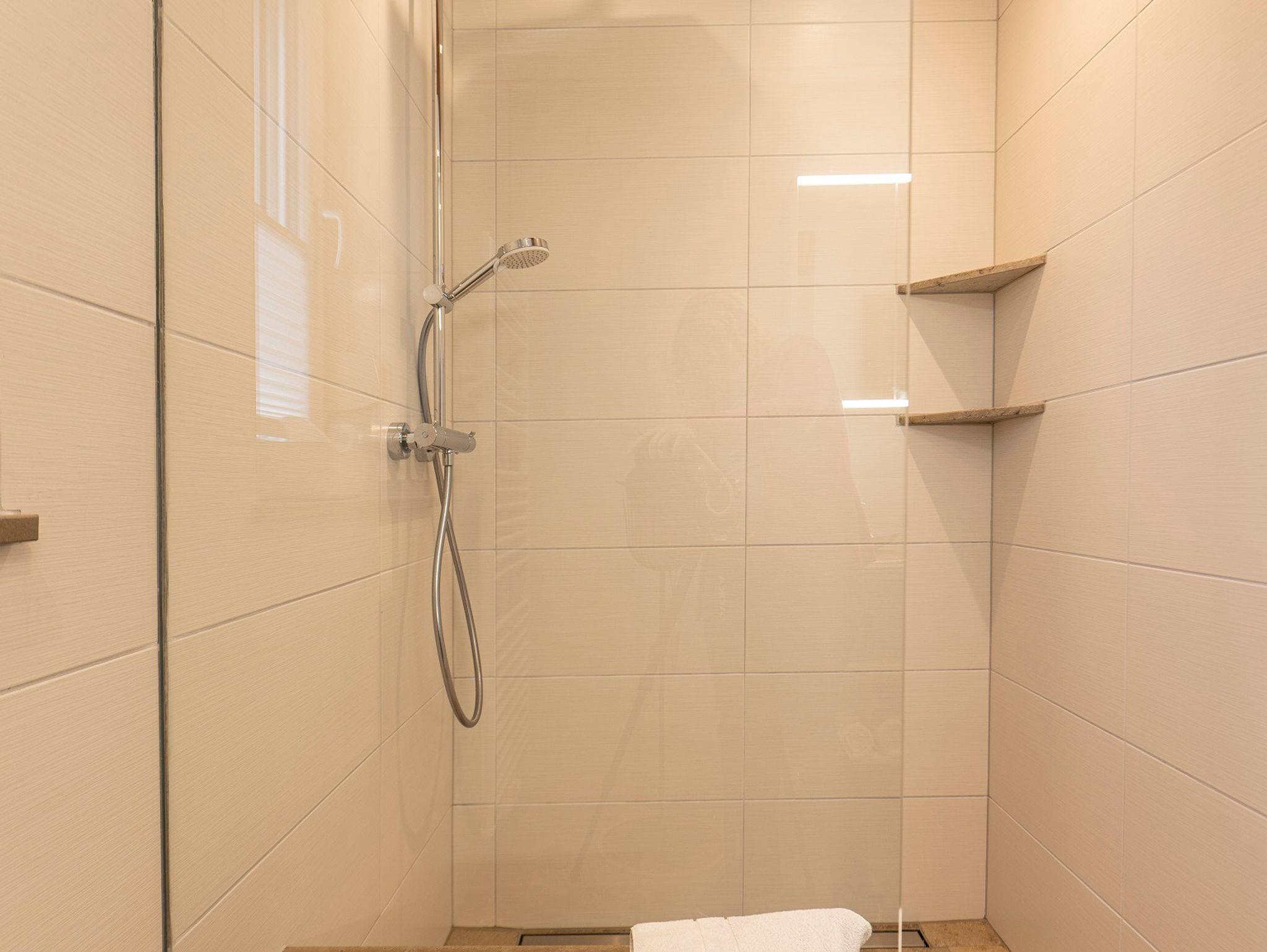 Das moderne Bad bietet eine ebenerdige Dusche mit Regenwaldfunktion, Waschtisch mit Spiegelschrank sowie Pflegeprodukte. Ein separates WC mit Waschbecken ergänzt den Sanitärbereich.