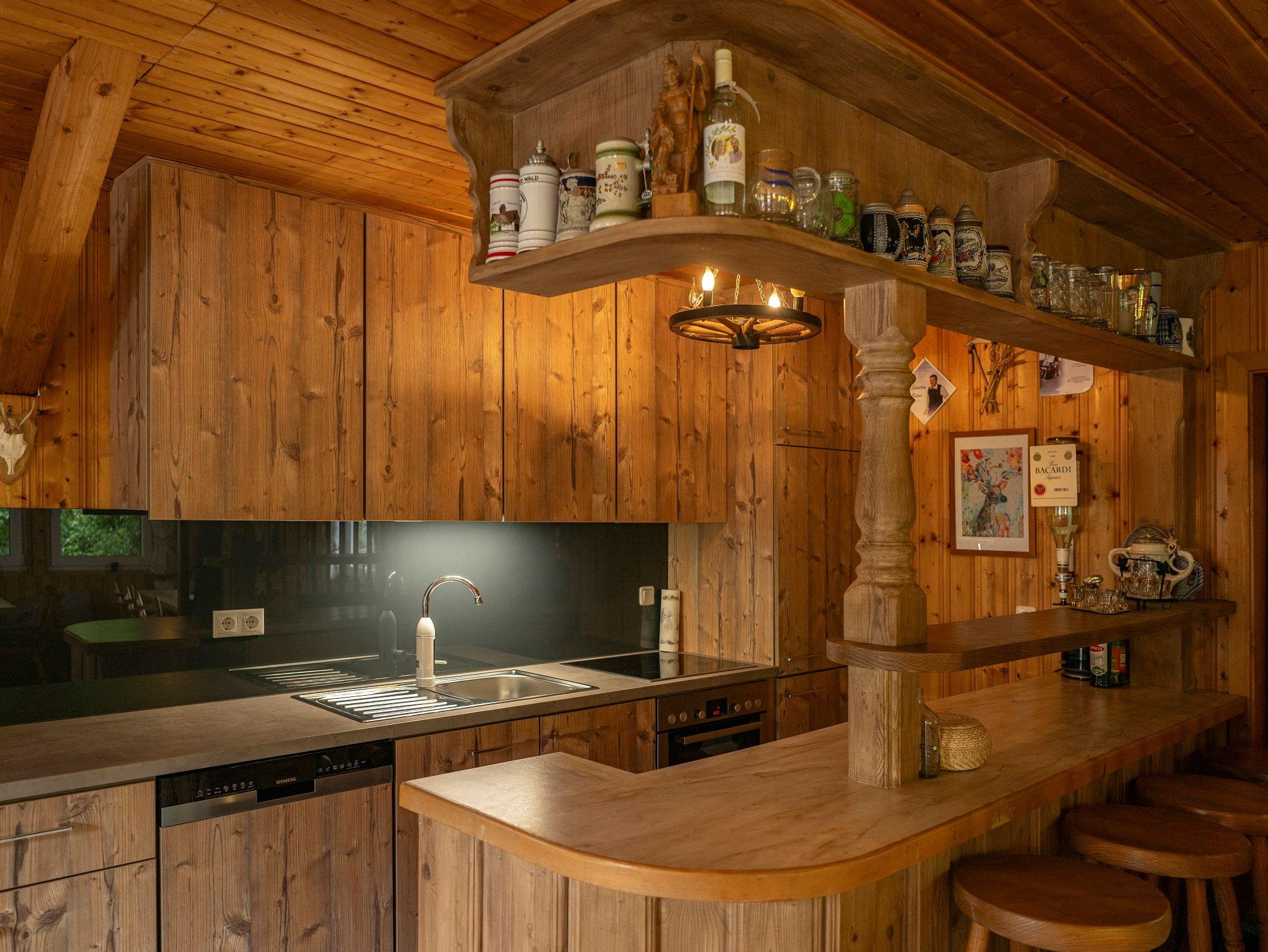 Die großzügige Küche bietet alles, was Sie für einen komfortablen Aufenthalt brauchen: eine gemütliche Sitzgruppe, zahlreiche Elektrogeräte wie Kaffeemaschine, Mikrowelle, Backofen, Cerankochfeld, Eierkocher, Milchaufschäumer, Geschirrspüler, Kühlschrank mit Gefrierfach sowie umfangreiches Geschirr und Küchenzubehör. Für Unterhaltung sorgen ein DAB-Radio und Amazon Alexa.