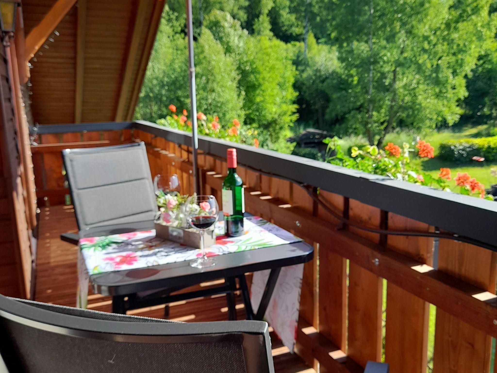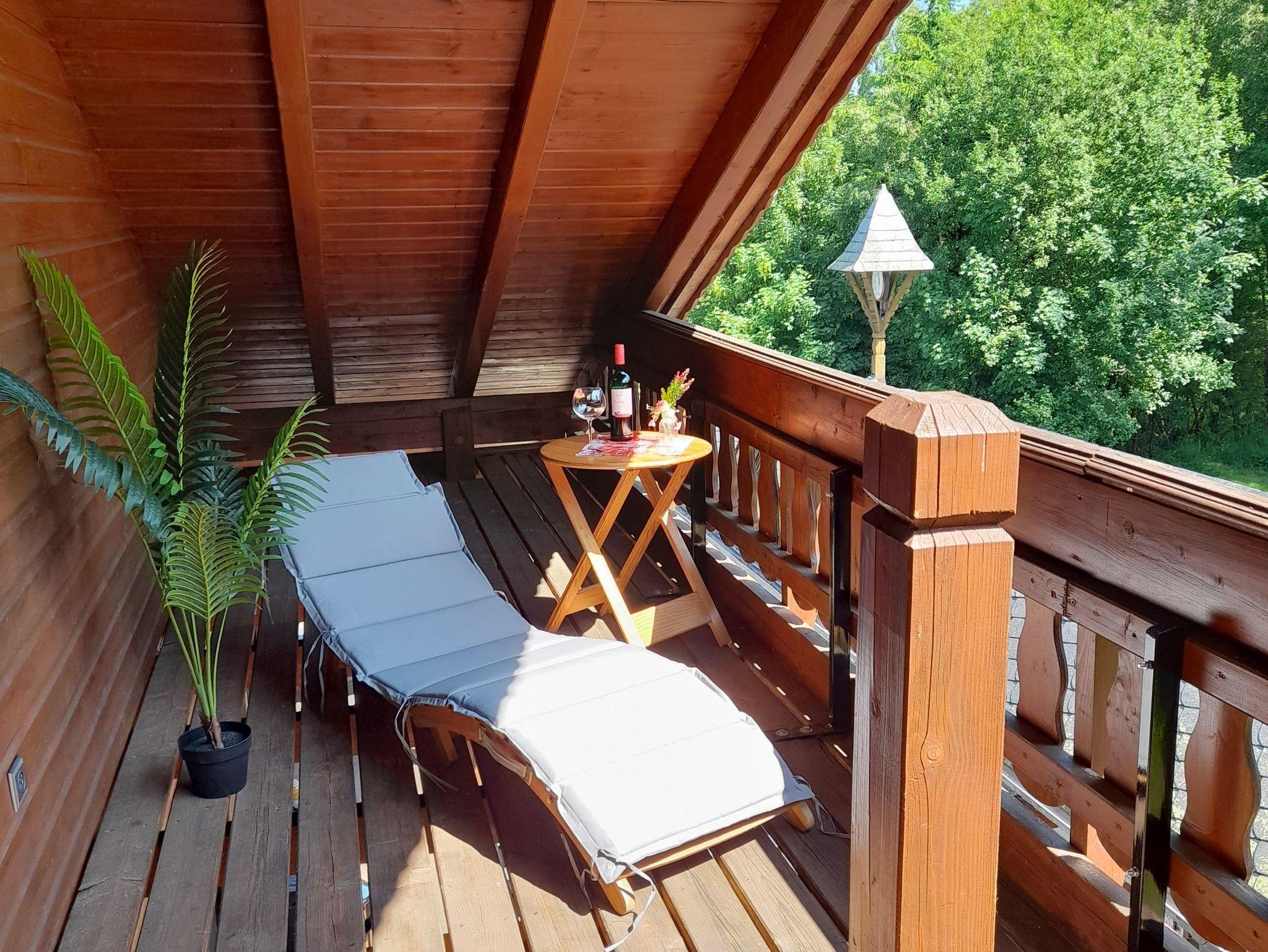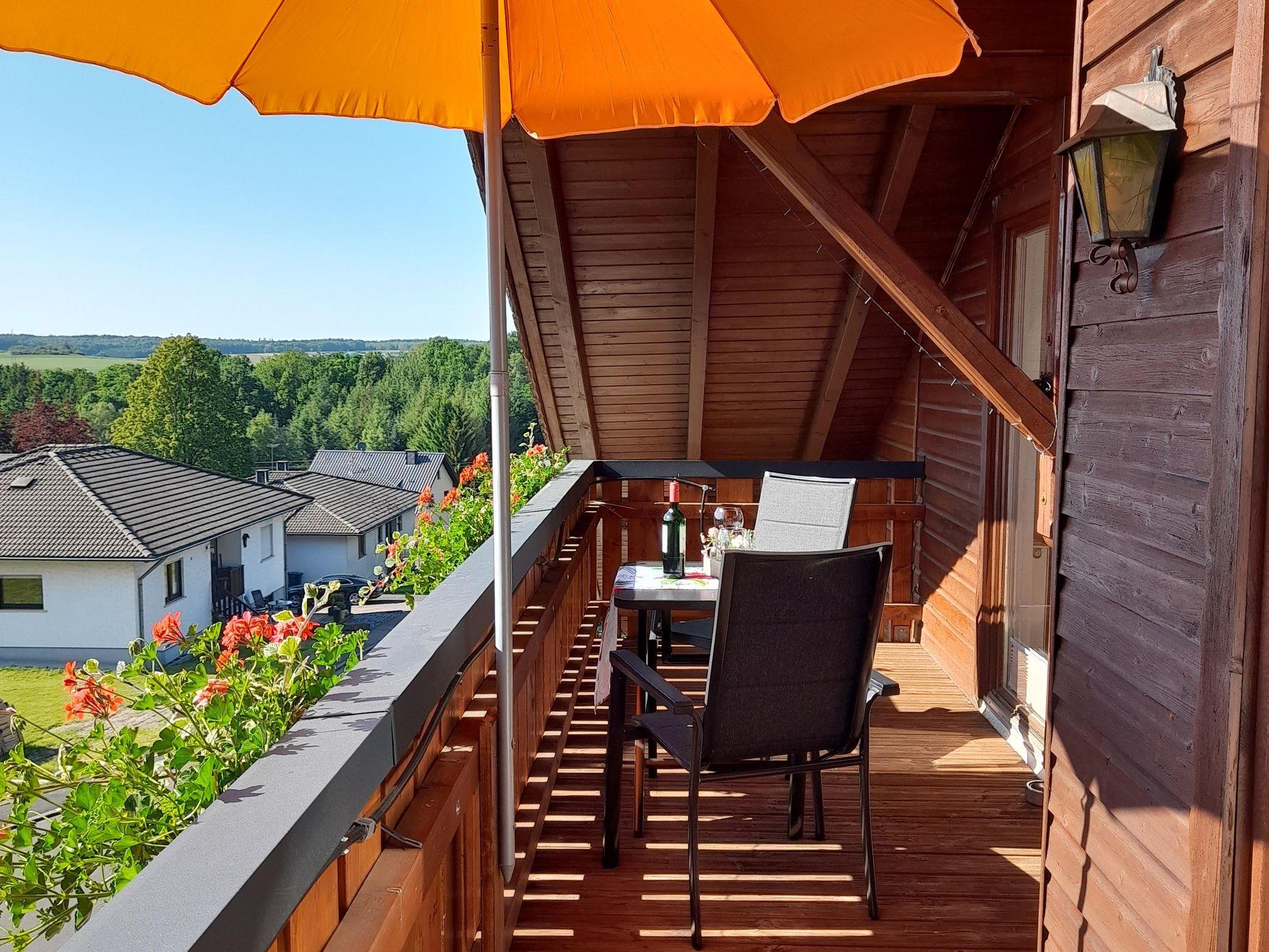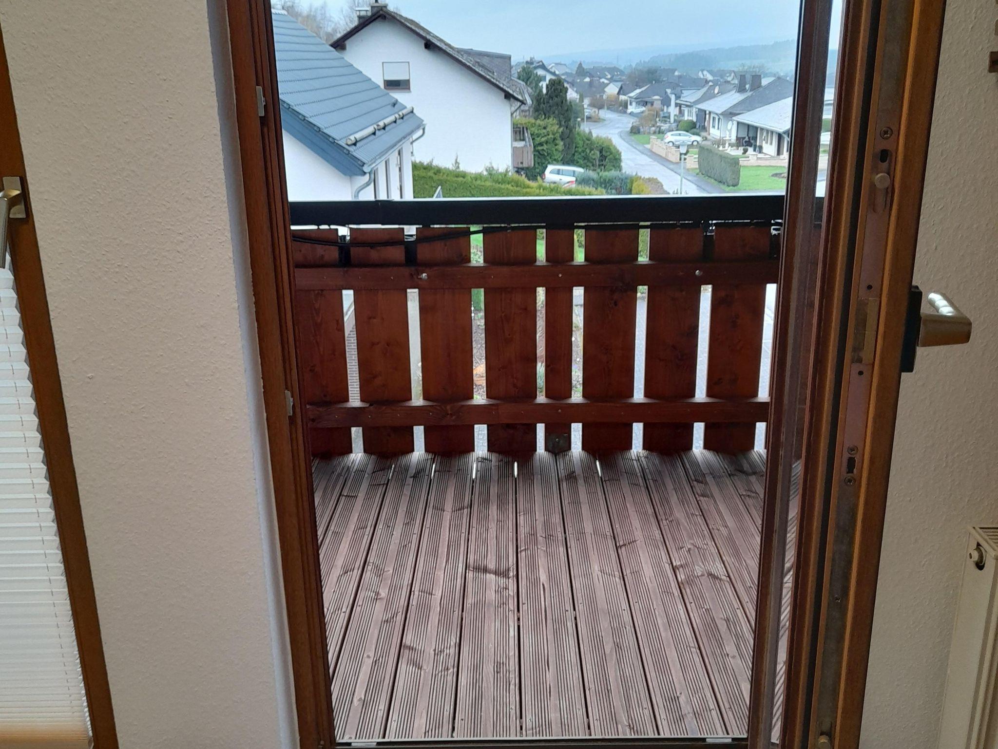 Vom Wohnbereich gelangen Sie auf den geräumigen Balkon, der Ihnen eine wunderschöne Fernsicht über die hügelige Mittelgebirgslandschaft verschafft.