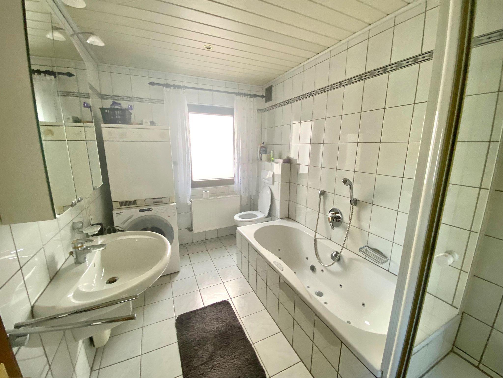 Küche und Bäder: Die geräumige Küche ist bestens ausgestattet, u.a. mit Spülmaschine. Es gibt zwei moderne Bäder, jeweils mit WC und Dusche - eines im Erdgeschoss (mit Whirlpool-Wanne), eines im ersten Stock. Waschmaschine und Gefriertruhe sind vorhanden.