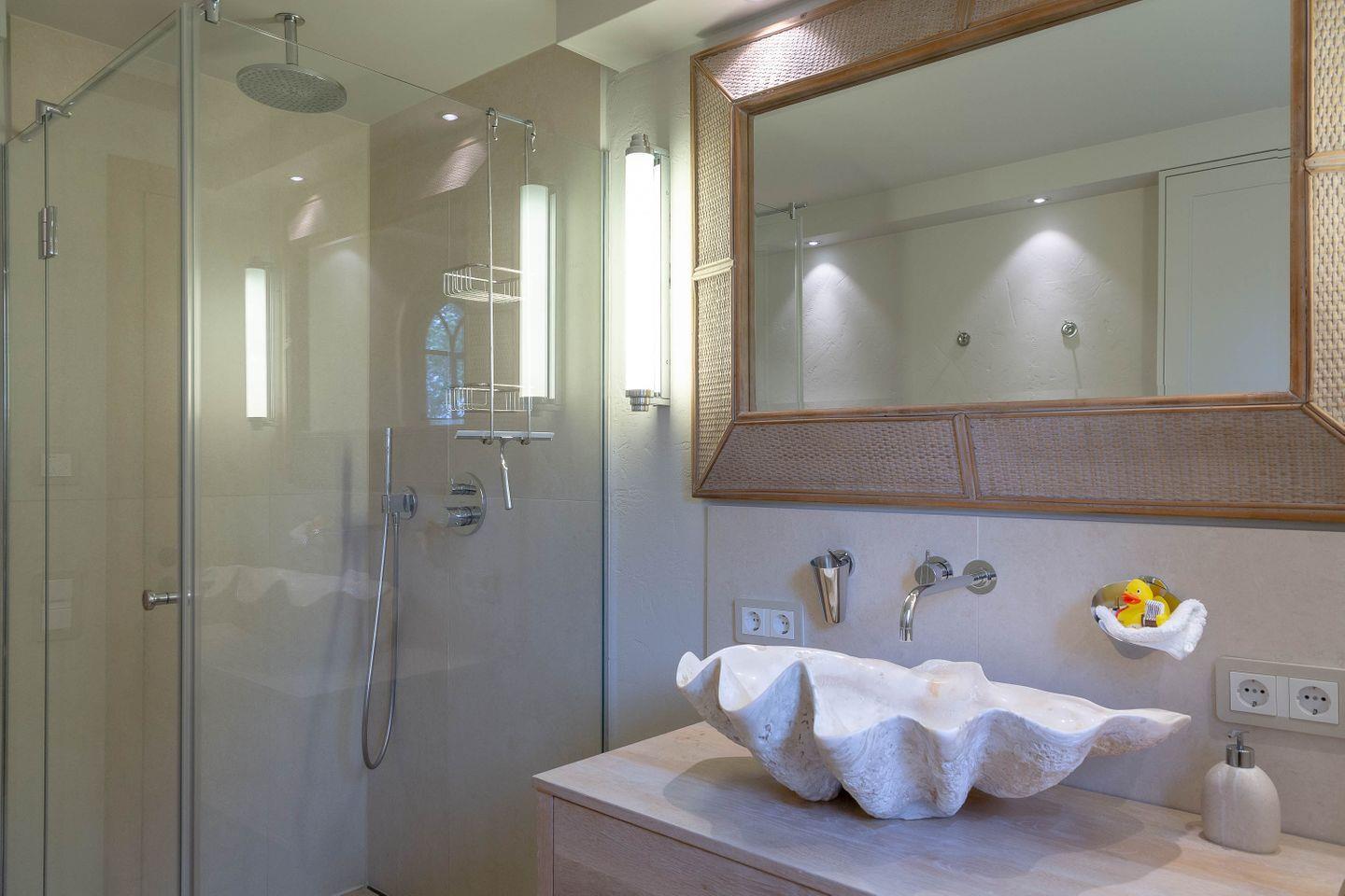 Nach dem Öffnen der Wohnungstüre erwartet Sie ein moderner Landhausstil mit antikem Flair. Zahlreiche Holzarbeiten und auch die Türen wurden aus 800 Jahre altem Eichenholz angefertigt. Der durchgängig verlegte Old Camargue Limestone Naturstein aus Spanien versprüht ein besonders antikes Flair, das durch seinen rohen und ungeschliffenen Zustand noch verstärkt wird. Im ersten Badezimmer empfängt Sie eine über 1.600 Jahre alte große Muschel als Waschbecken, wodurch der exklusive Charakter dieser Wohnung noch verstärkt wird.