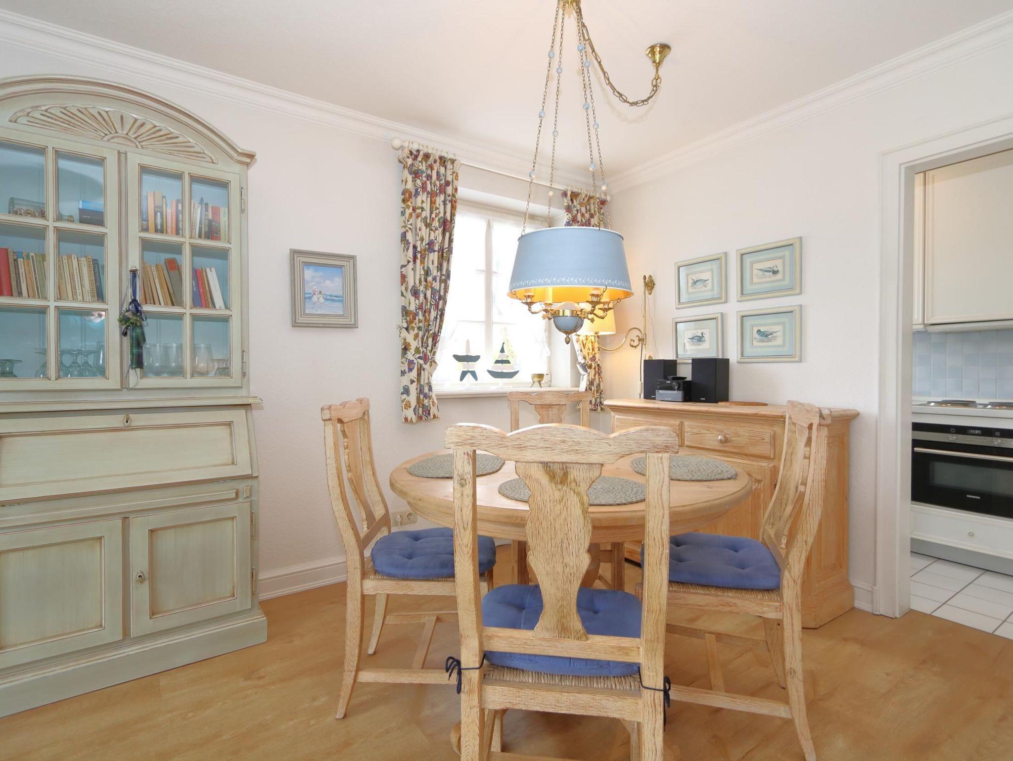 Ein helles Wohnzimmer mit großer Fensterfront zum möblierten Terrasse mit Sitzecke und Strandkorb. Eßecke und Couchgarnitur, TV SAT/Kabel, Radio, CD-Player, WLAN, DVD-Player, Bücher
