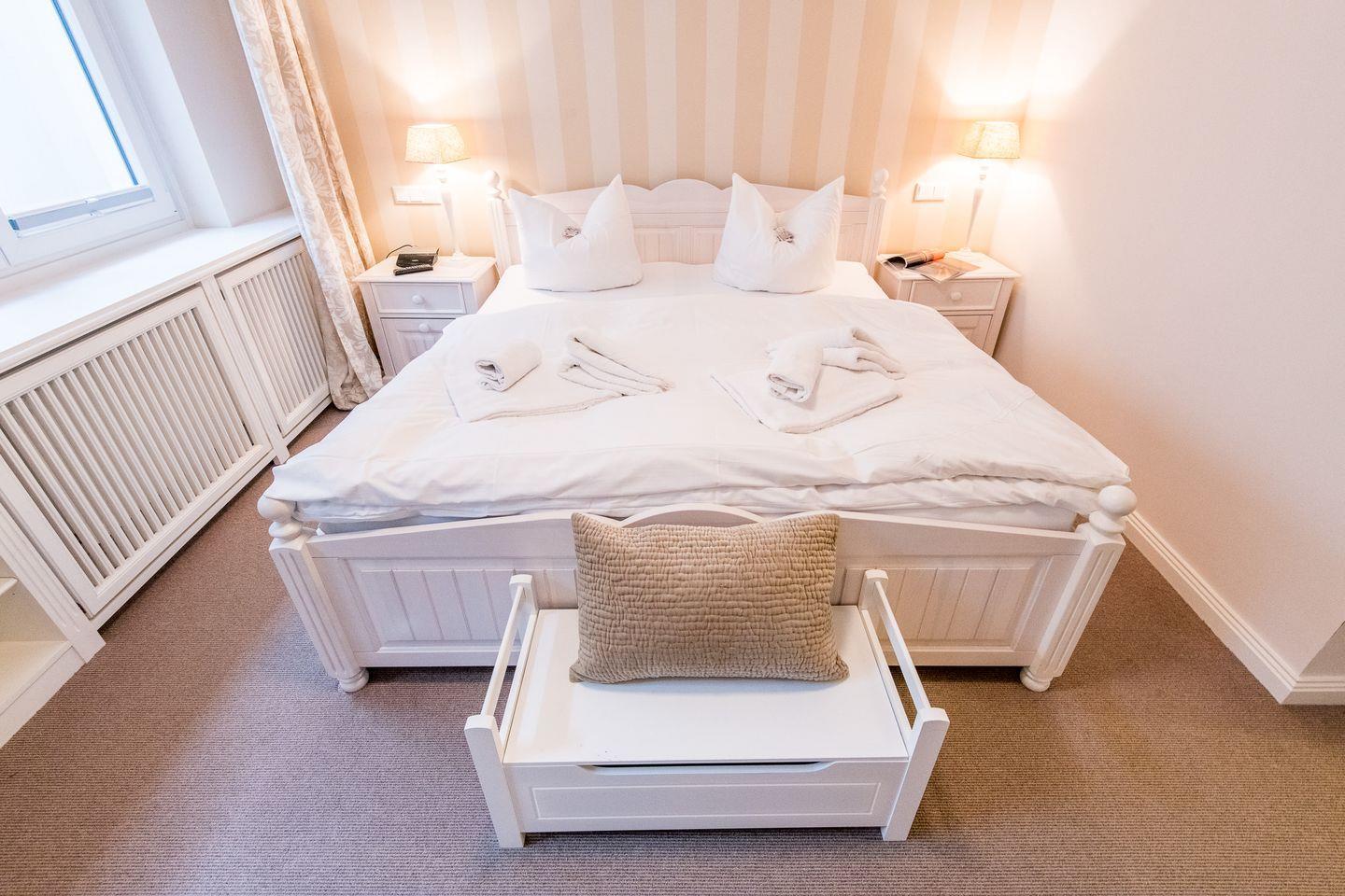 Die beiden Schlafzimmer der Wohnung bieten ausreichend Platz und Komfort für eine erholsame Nacht. Das Hauptschlafzimmer ist mit einem Doppelbett (2x 90x200 cm) und einem TV ausgestattet, während das zweite Schlafzimmer über zwei Einzelbetten (je 90x200 cm) verfügt und sich perfekt für Kinder oder zusätzliche Gäste eignet.