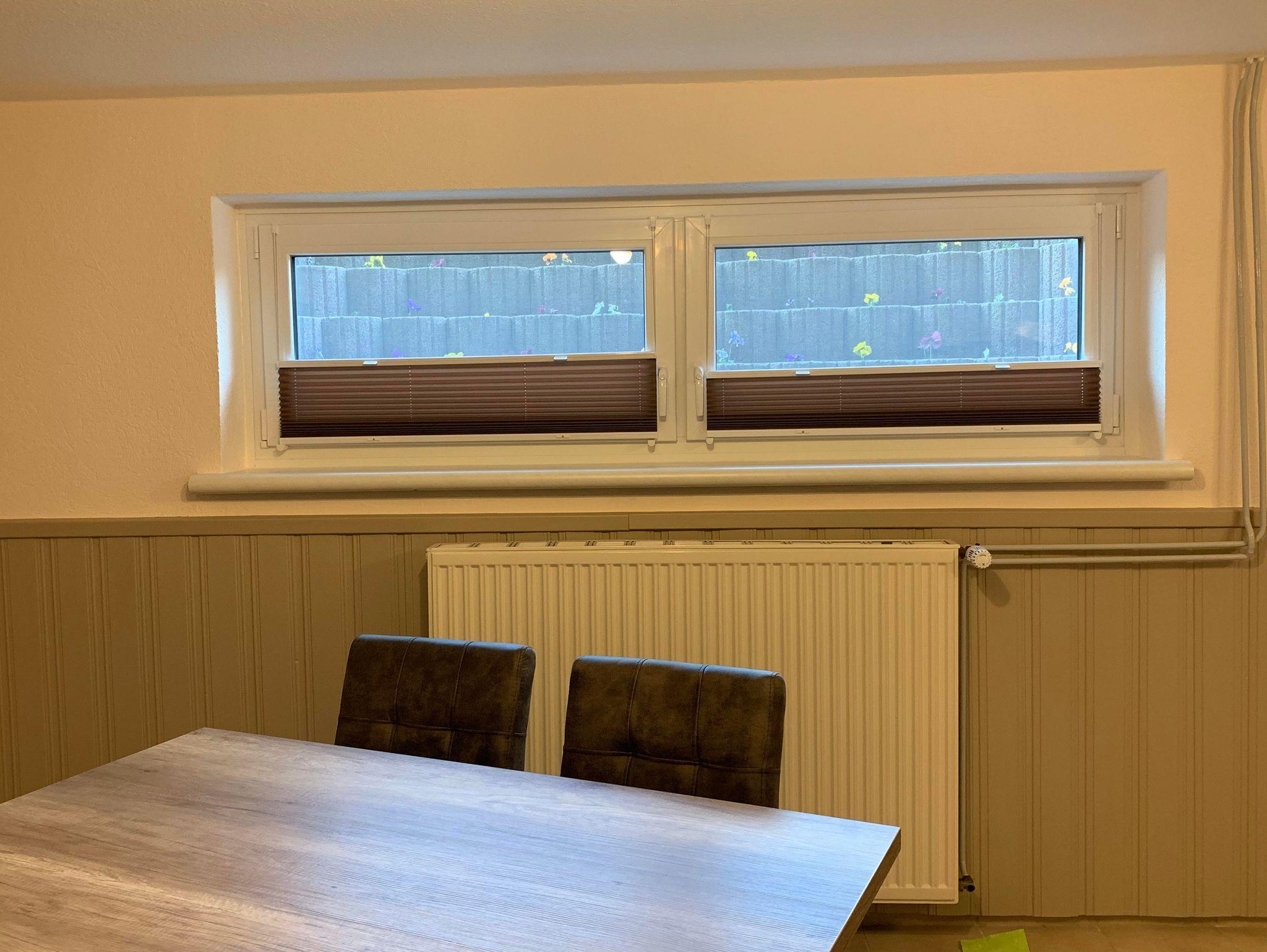 Der Aufenthaltsraum mit Esstisch, 4 Stühlen, TV, Kühlschrank, Kaffeemaschine, Wasserkocher, Mikrowelle u. Toaster befindet sich nebenan.