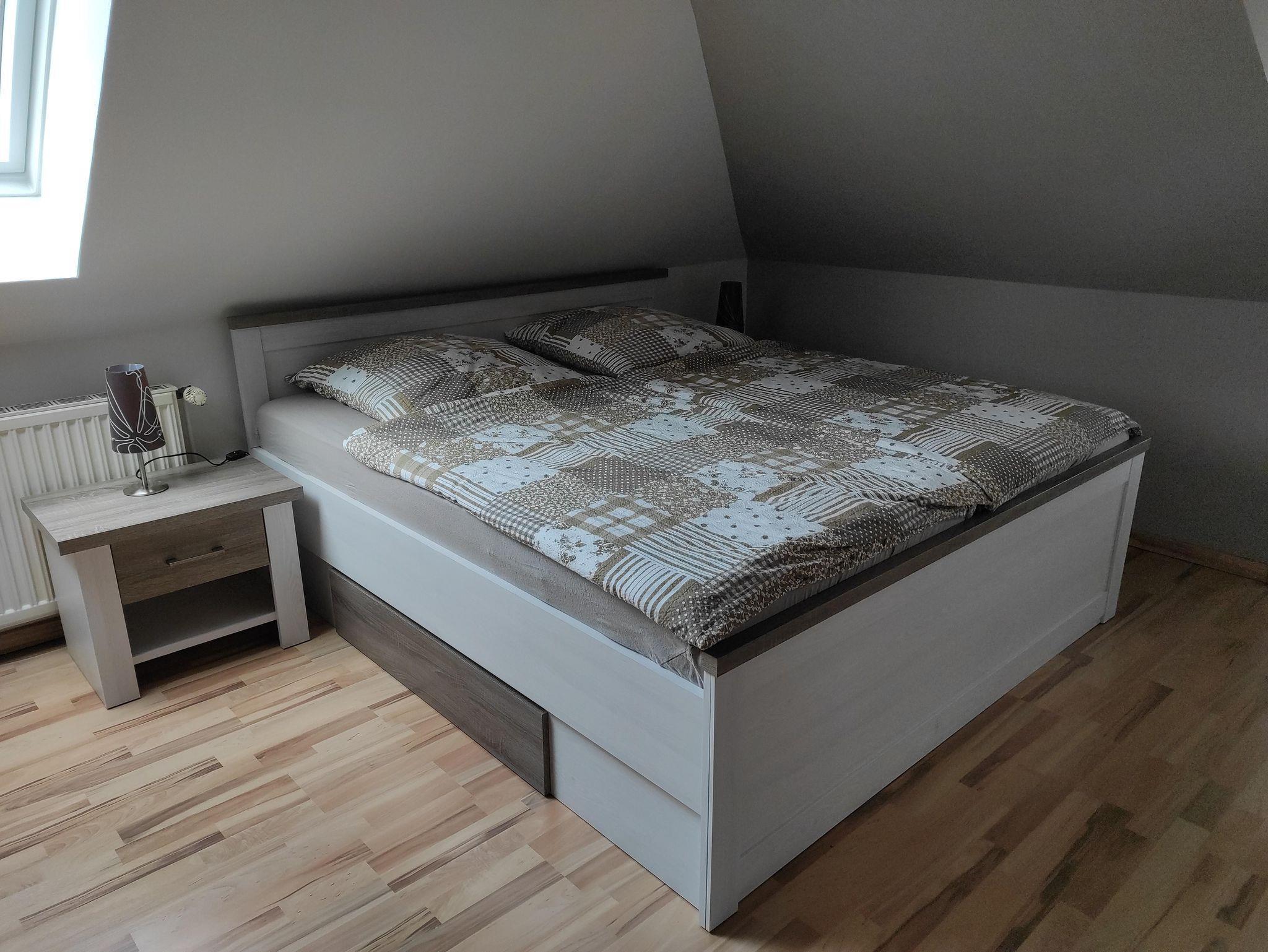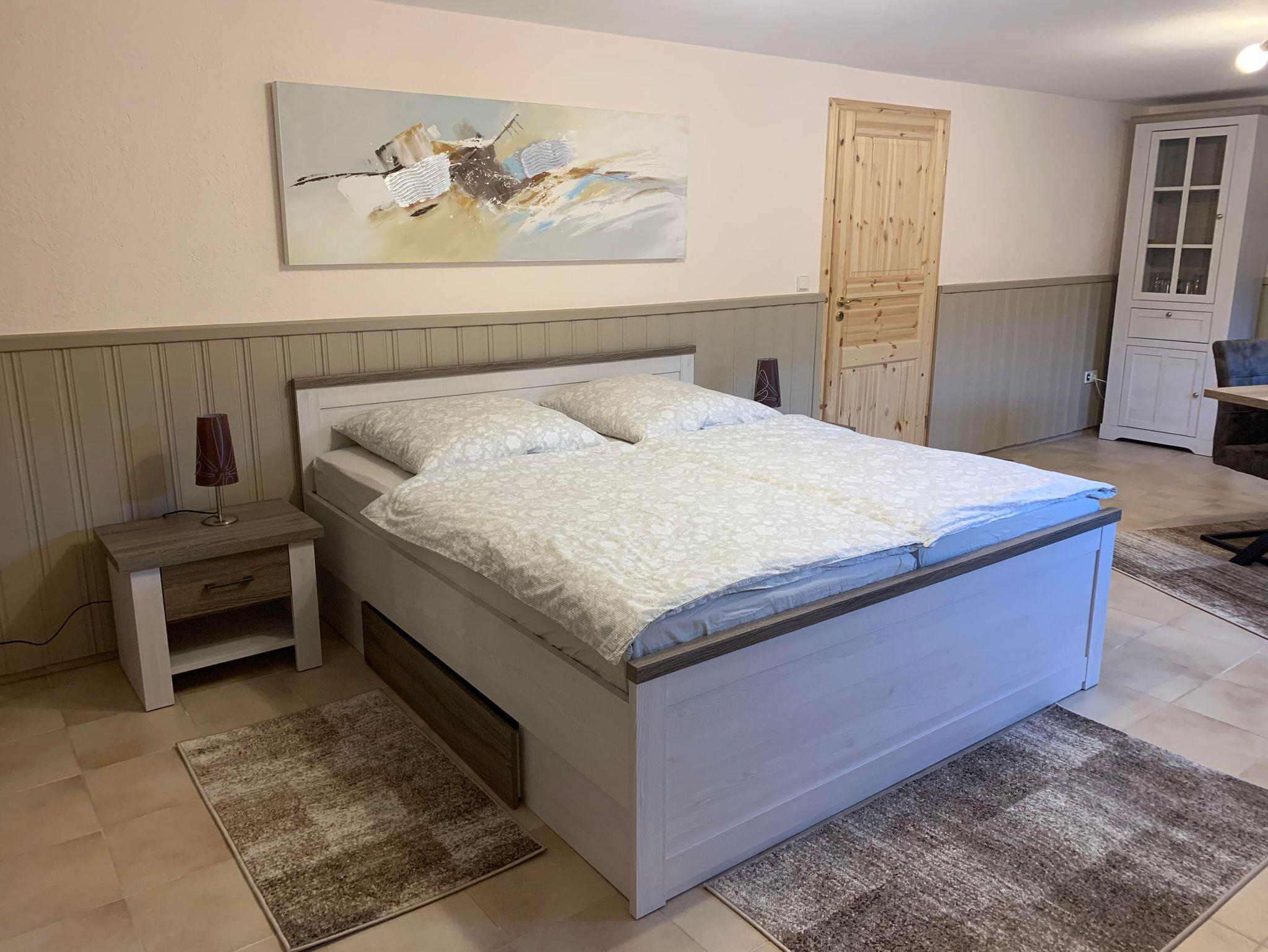 Das Hauptzimmer ist mit Kleiderschrank, Doppelbett, 2 Nachtschränken, TV u. Couch mit Tisch ausgestattet.