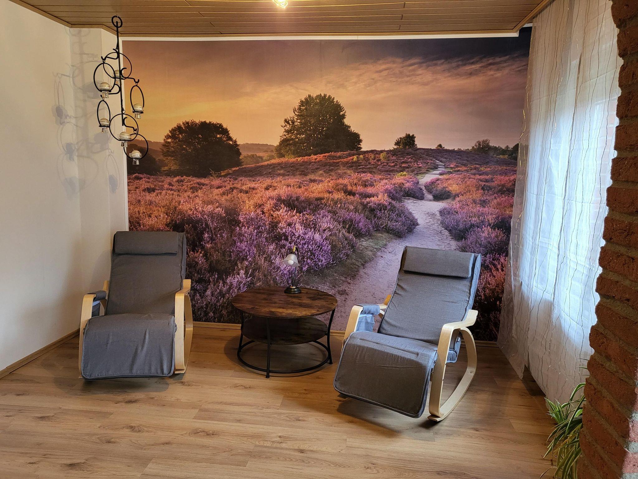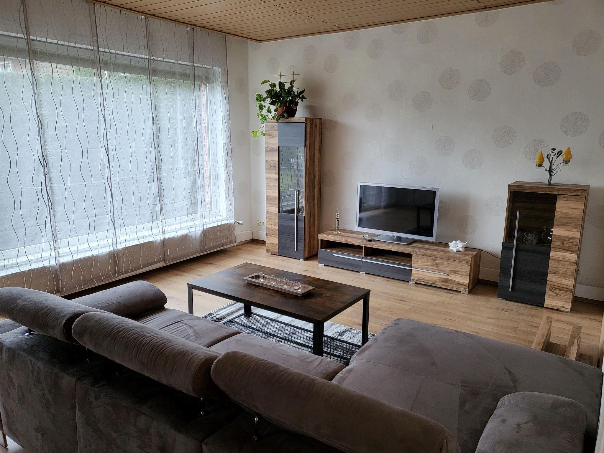 Wohnzimmer: großes Ecksofa und 2 Entspannungsliegen, Fernseher, Gesellschaftsspiele