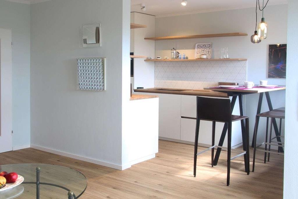 Moderne lejlighed på 55 kvm på 3. sal med sydvendt altan. Den lyse og velindrettede stue er perfekt møbleret med sofa, lænestol, bord og tv, så du kan få et behageligt ophold. Køkkenet er af høj kvalitet og meget veludstyret. Soveværelset har en specialbygget dobbeltseng i massivt egetræ og et rummeligt indbygget klædeskab. Badeværelset har italienske fliser, et stort brusebad og inventar af høj kvalitet. Murnau centrum ligger 5 minutters gang derfra.