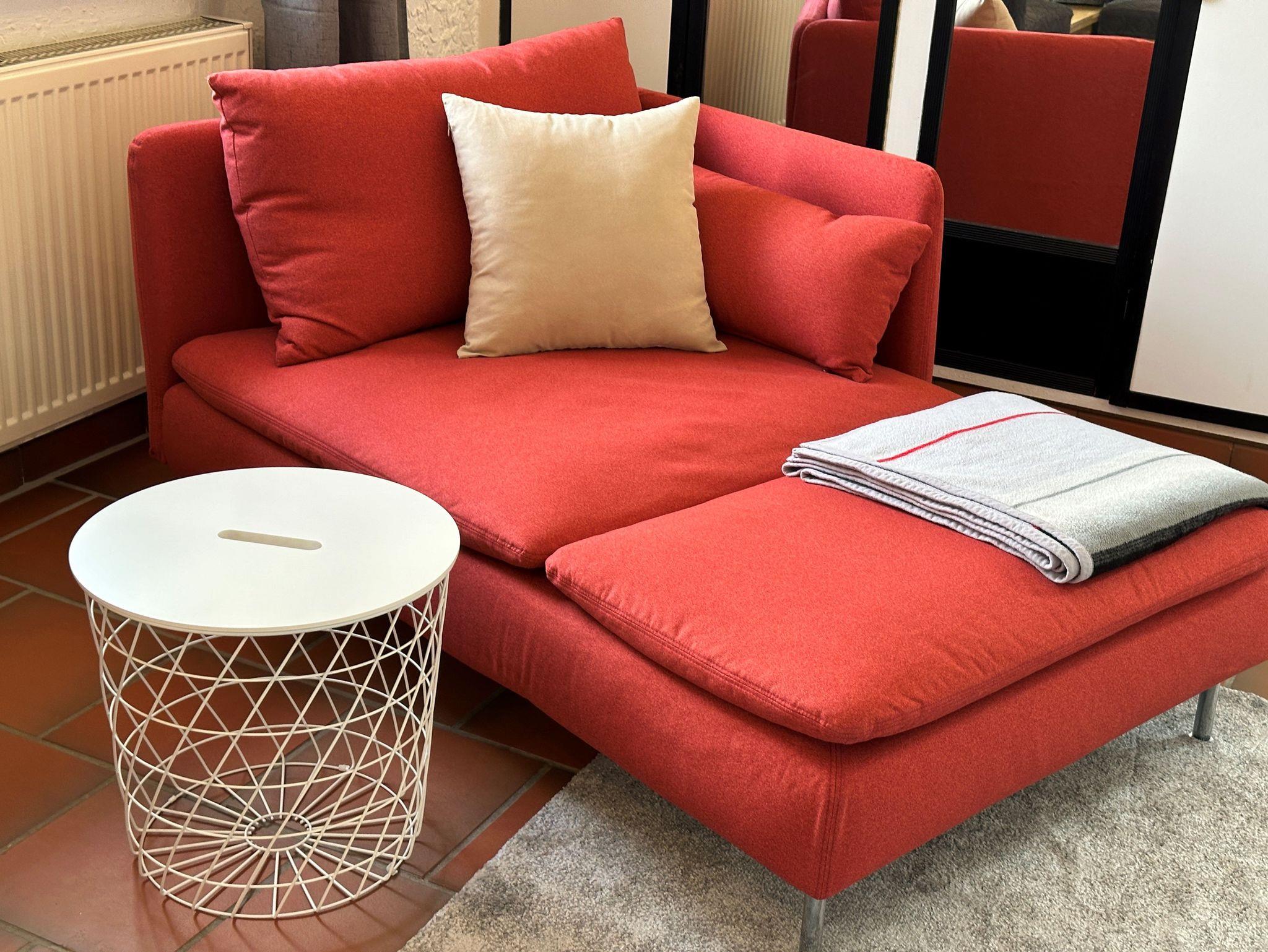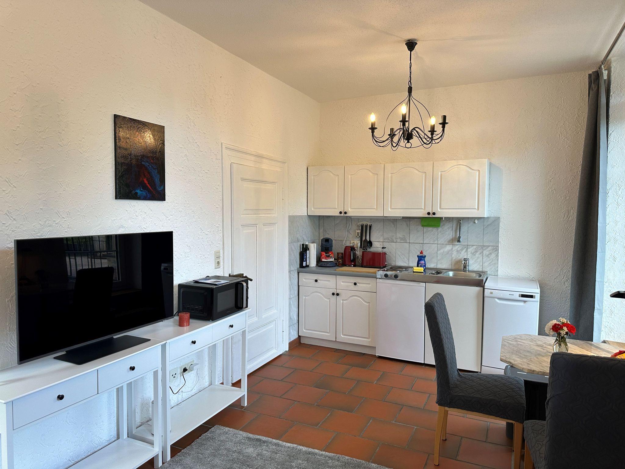 Unsere gemütliche Ferienwohnung im ländlich-modernen Stil mit 38 m² Wohnfläche befindet sich im 1.Stock und bietet Platz für 1-2 Personen. Die komplett ausgestattete Wohnküche mit Geschirrspüler, Kühlschrank, 2 Herdplatten, Mikrowelle, Wasserkocher, Toaster und Kaffeemaschine lässt keine Wünsche offen. Die Ferienwohnung verfügt über eine Schlafnische mit einem Doppelbett (160 x 200), im vorgelagerten Wohnraum laden eine Recamiere, ein 50 Zoll Fernseher und eine kleine Essgruppe mit 2 Sitzplätzen zum Verweilen ein. Vor allem im Sommer können Sie entspannte Abende auf der großen nach Südwest ausgerichteten Dachterrasse ausklingen lassen. Das Badezimmer verfügt über eine Dusche und ein WC. Im Waschmaschinenraum im Keller können Sie eine Waschmaschine, die nur für die Ferienwohnungen vorbehalten ist, mitbenutzen. Bettwäsche, Handtücher, kostenfreie WLAN-Nutzung, Parkplatz, Endreinigung und Nebenkosten sind im Preis enthalten.