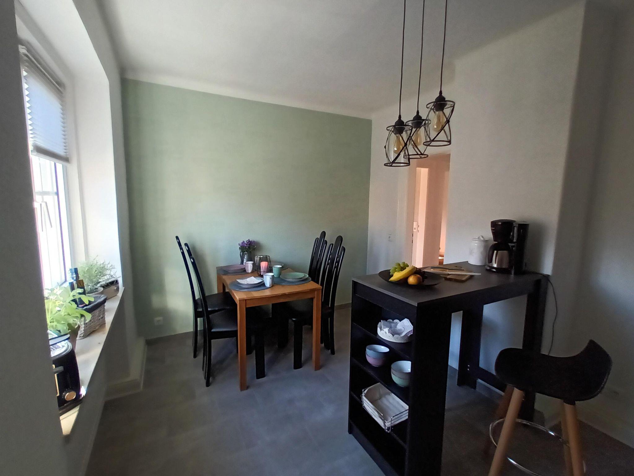 Wir bieten eine gemütliche Ferienwohnung (54 m²) für 4 Personen im 1. OG. Die Küche ist eingerichtet mit Geschirrspüler, Cerankochfeld, Backofen, Kühlschrank, Gefrierfach, Mikrowelle, Toaster, Wasserkocher, Kaffeemaschine, SodaStream, Geschirr und Esstisch. Das Wohnzimmer ist ausgestattet mit Schlafsofa, TV mit Alexa Funktion und kostenlosem Netflix Zugang. Im Schlafzimmer befindet sich ein Doppelbett (180x200). Das Badezimmer ist ausgestattet mit Badewanne mit Duschwand, Fön & Handtuchheizung.