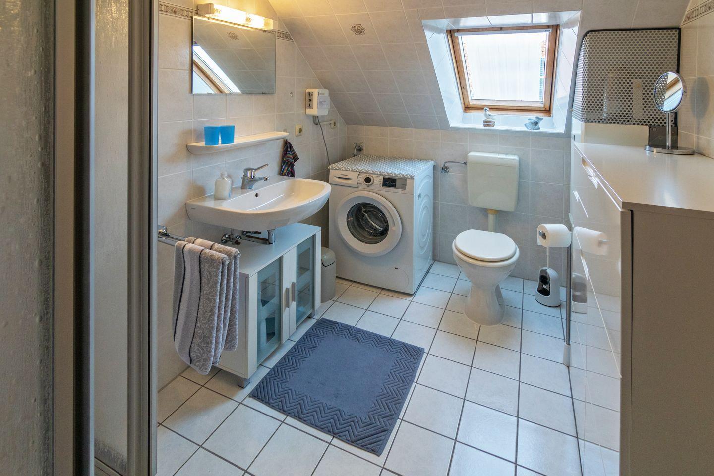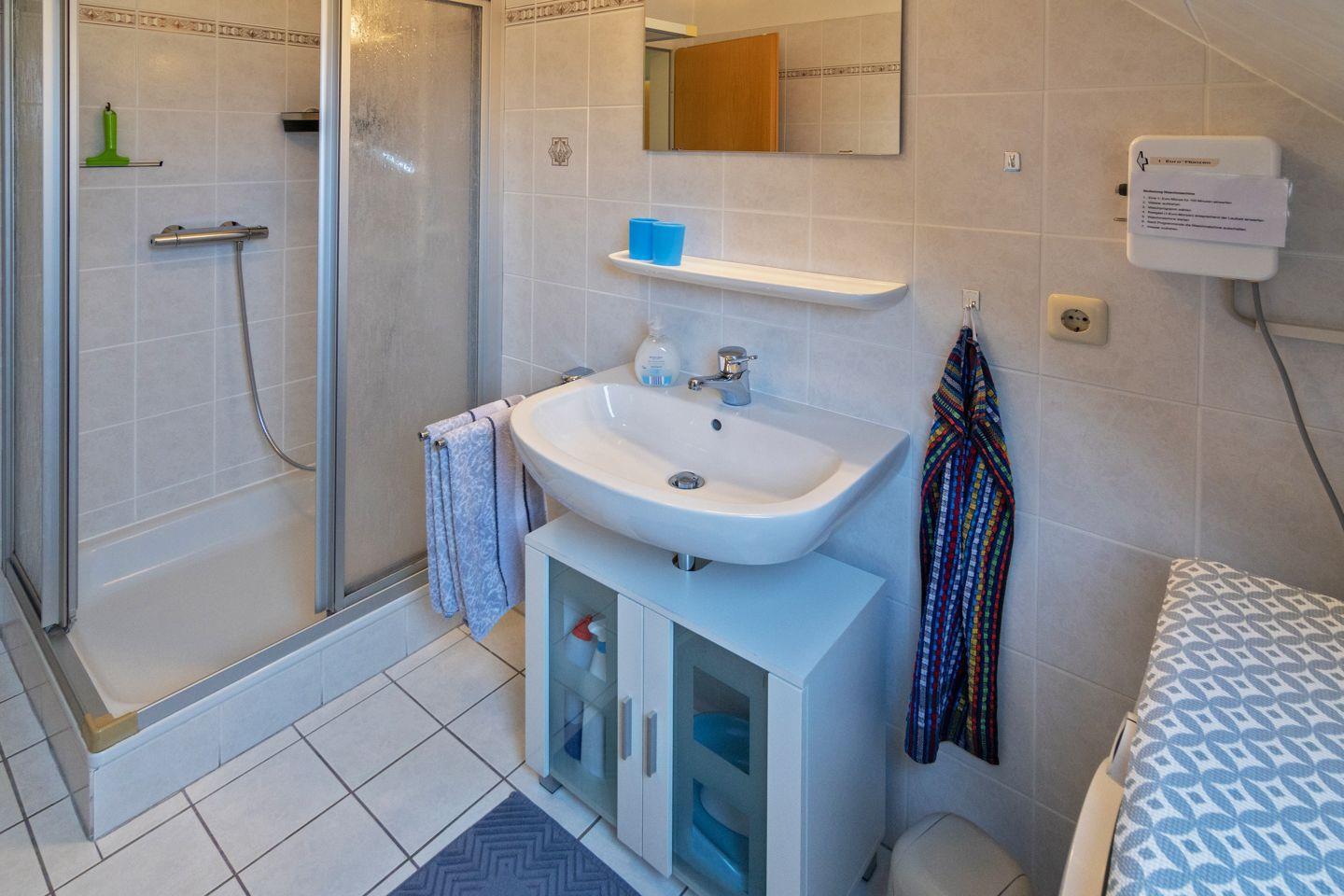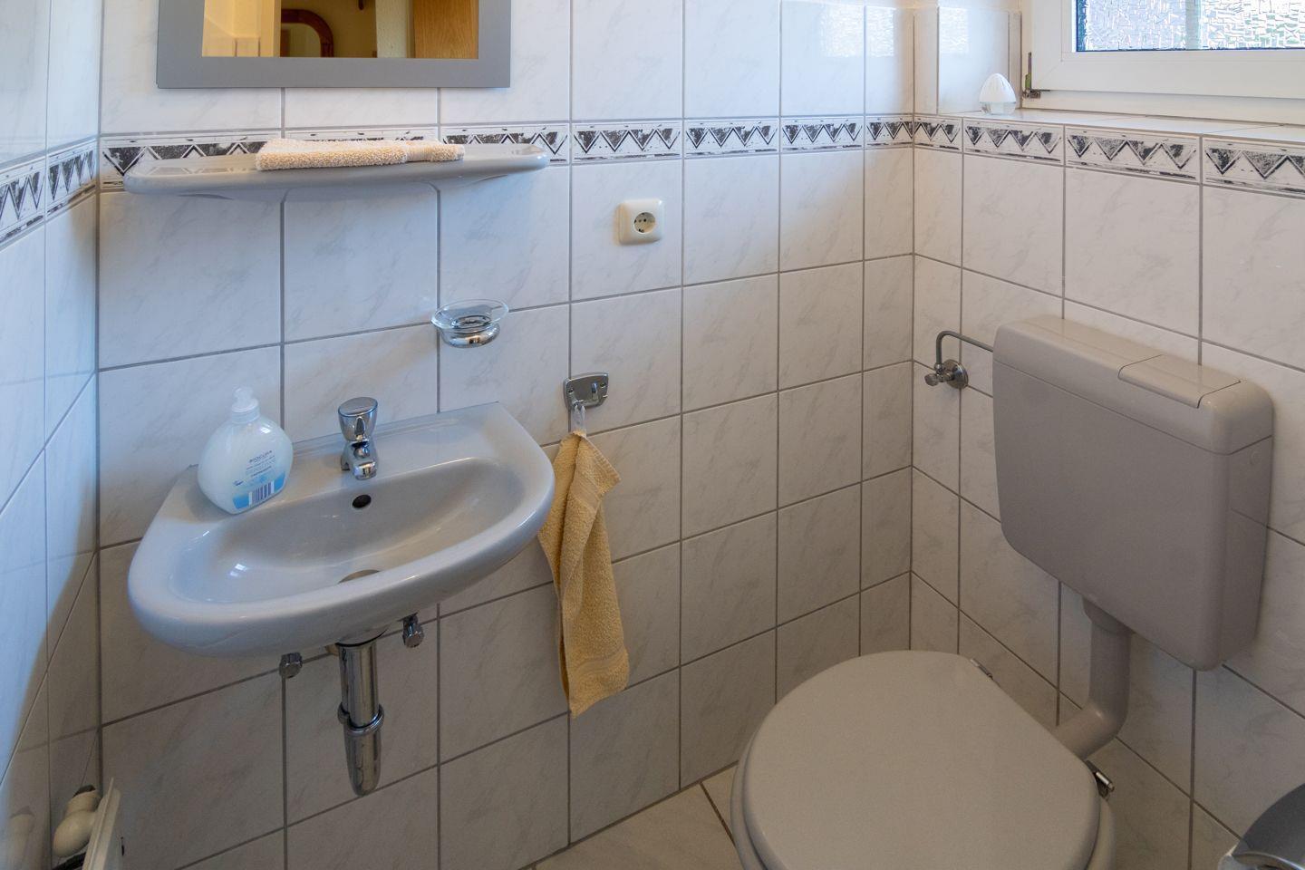 Im Obergeschoss befinden sich zwei Schlafzimmer und ein Duschbad mit WC sowie eine Waschmaschine mit Münzautomat für 1-Euro-Münzen.
