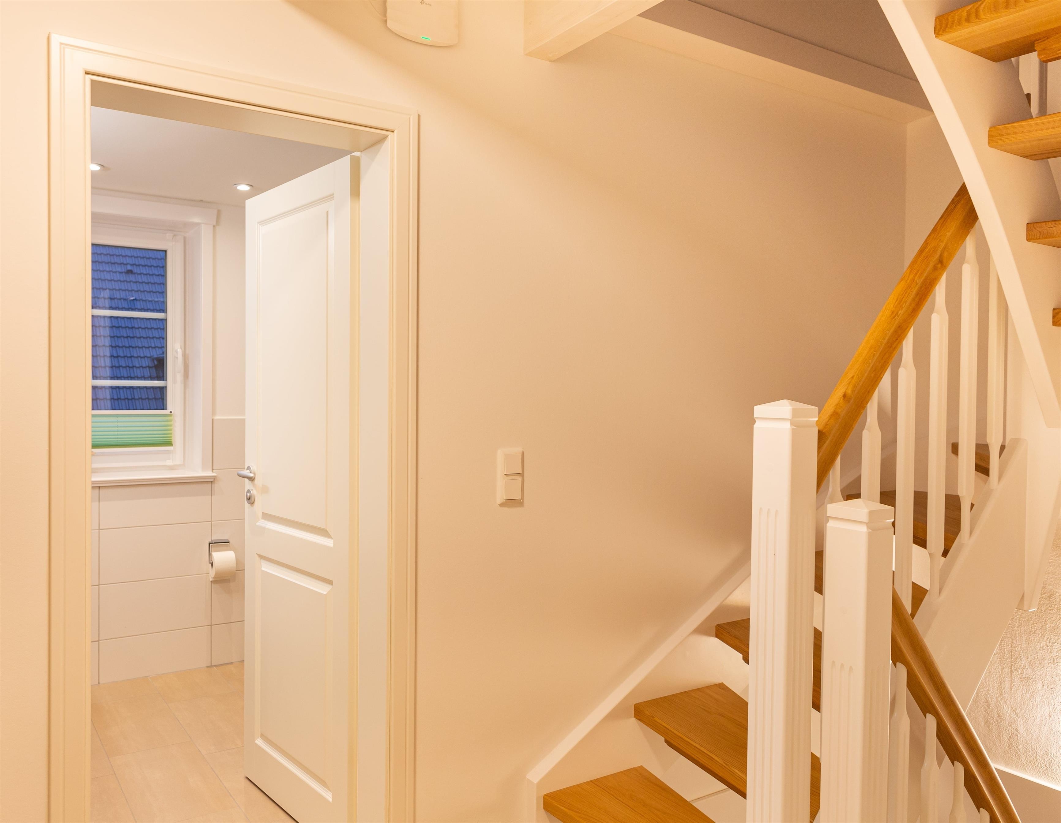 Die Zimmer sind wie folgt aufgeteilt: Ein Schlafzimmer mit Doppelbett und Bad, sowie ein Einzelschlafzimmer und separates Bad im 1. Stock. Ein zum Treppenhaus offenes SChlafzimmer im Dachgeschoss, sowie ein Schlafzimmer mit zwei Betten und eigenem Bad im Keller. Eine perfekt ausgestattete Küche, vereint mit einem offen gestaltetem Wohn/Essbereich und Gäste-WC im Erdgeschoss.