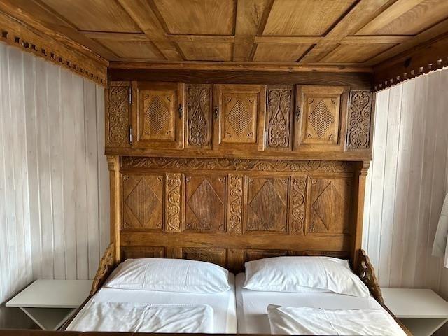 Die lichtdurchfluteten Räume zeichnen sich durch weiße Holzvertäfelungen aus. Sie bietet zwei getrennte Schlafzimmer: eines mit einem Doppelbett, Schrank, Spiegel und Kommode, das andere mit einem Himmelbett.