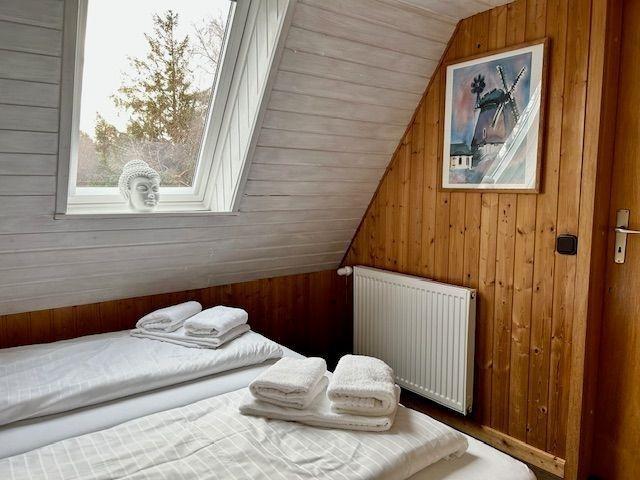 Das Haus Dünenrose in Nebel - Westerheide bietet eine charmante Maisonettwohnung für bis zu 4 Personen im Obergeschoss. Die helle und frische Atmosphäre wird durch die weißen Holzvertäfelungen und die schöne Einrichtung mit Eichenmöbeln im Bauernstil unterstrichen. Die gemütliche Essecke mit Friesenporzellan lädt zum Verweilen ein. Zur Ausstattung gehören ein Badezimmer mit Dusche (Einstieg 23 cm) und WC sowie eine Kochnische mit einem 2-Platten-Herd und einem kleinen Kühlschrank. Eine steile Raumspartreppe führt zu zwei Schlafzimmern: das erste mit zwei Einzelbetten und das zweite mit einem Doppelbett. Den Gästen steht ein großer Gemeinschaftsgarten mit Gartenmöbeln zur Verfügung, sowie überdachte Radständer und kostenfreie Parkmöglichkeiten am Haus. Eine Waschmaschine und ein Trockner sind ebenfalls vorhanden. Hunde sind gegen einen Aufpreis willkommen.