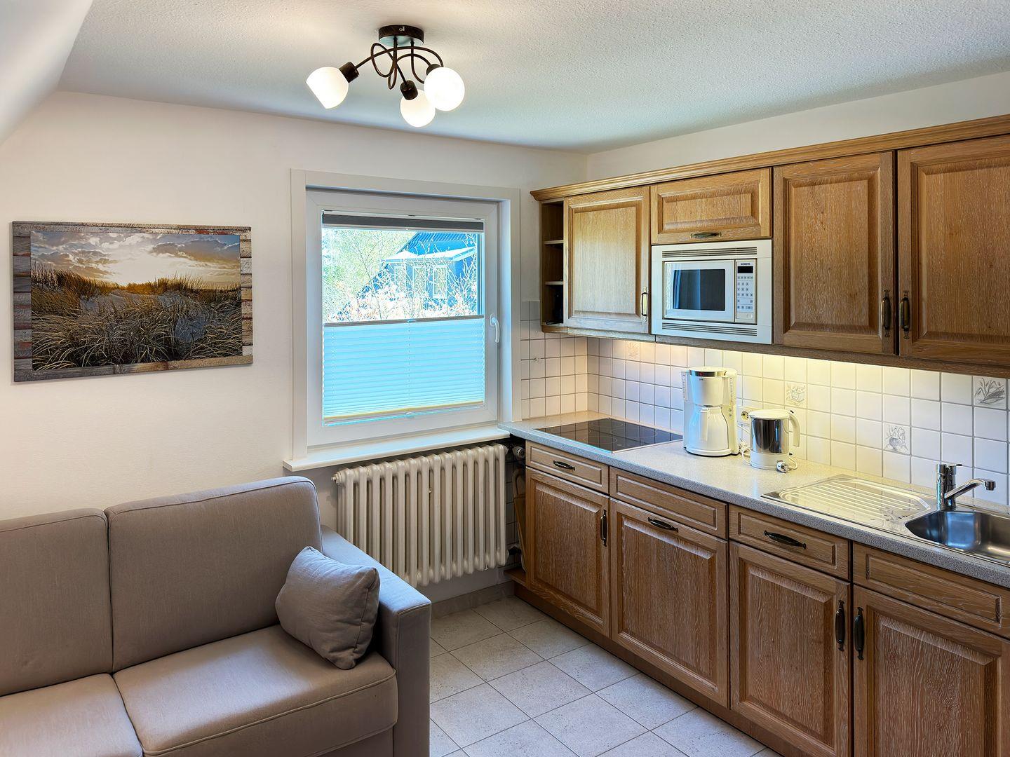 Die Wohnung verfügt über 1 Wohnraum mit WLAN, Sat-TV und offener Küche, 1 Schlafzimmer, 1 Badezimmer mit Dusche und WC; Garten zur Gemeinschaftsnutzung mit Gartenmöbeln (April bis Oktober), PKW-Stellplatz.