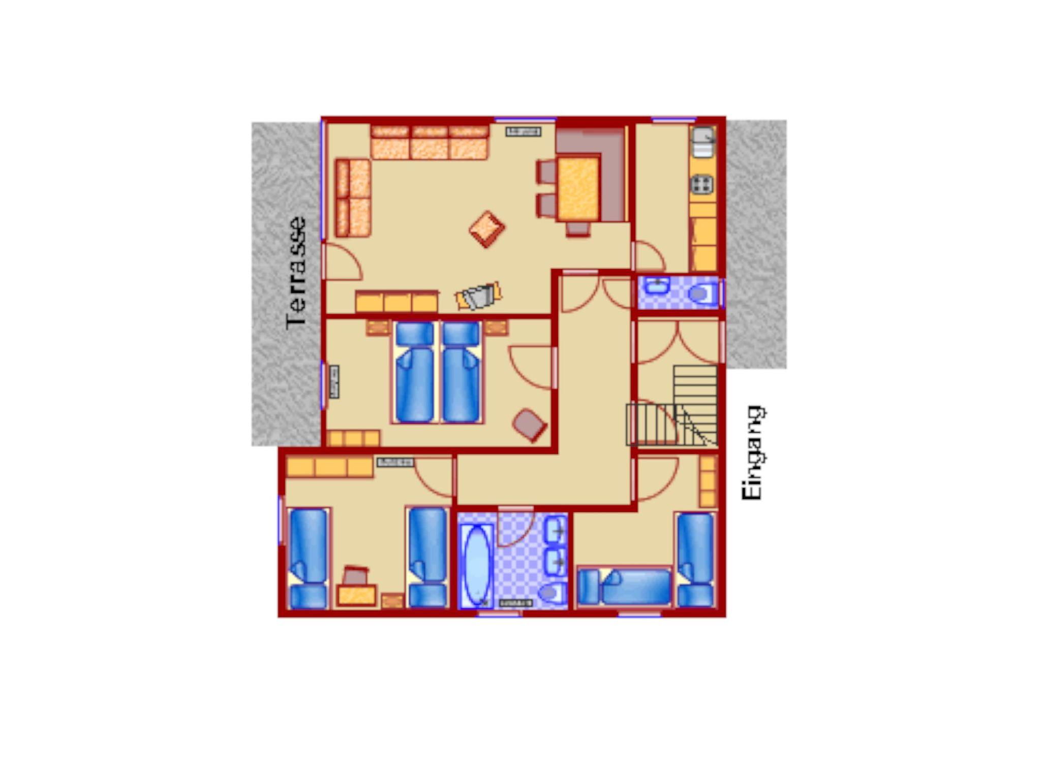 Das Erdgeschoss umfasst eine großzügige Diele, die zu allen Räumen führt. Neben einem großen Wohnzimmer mit separatem Essbereich befinden sich dort eine Küche, drei Schlafzimmer mit jeweils zwei Betten, ein Badezimmer mit Dusche sowie ein zusätzliches WC. Vom Wohnzimmer aus öffnet sich der Zugang zur Terrasse mit Bergblick, ergänzt durch einen windgeschützten Freisitz mit Holztisch und Bänken für Mahlzeiten im Freien.