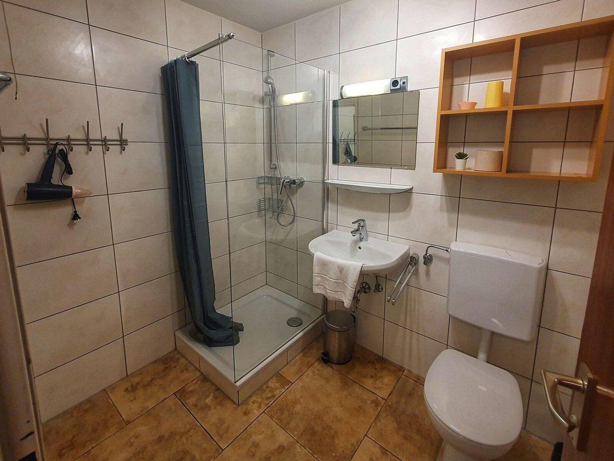 Das Badezimmer ist mit einer Dusche, einem Waschbecken, einem WC und einem Fön ausgestattet. Zusätzlich verfügt das Haus über ein separates WC mit einem Waschbecken.