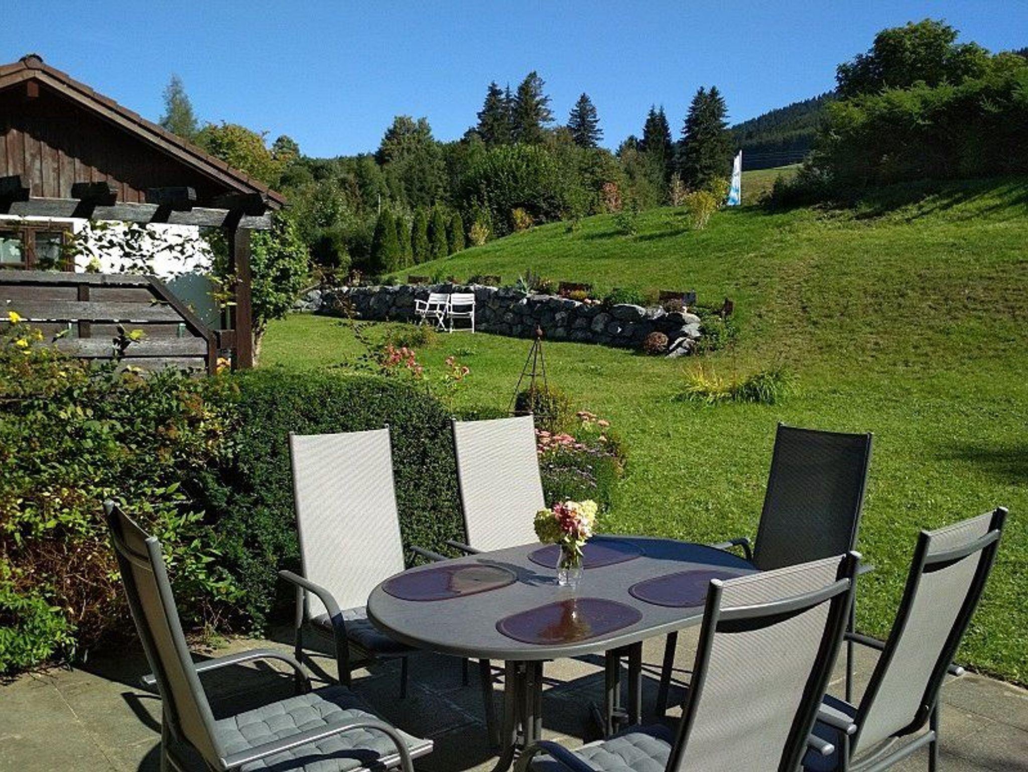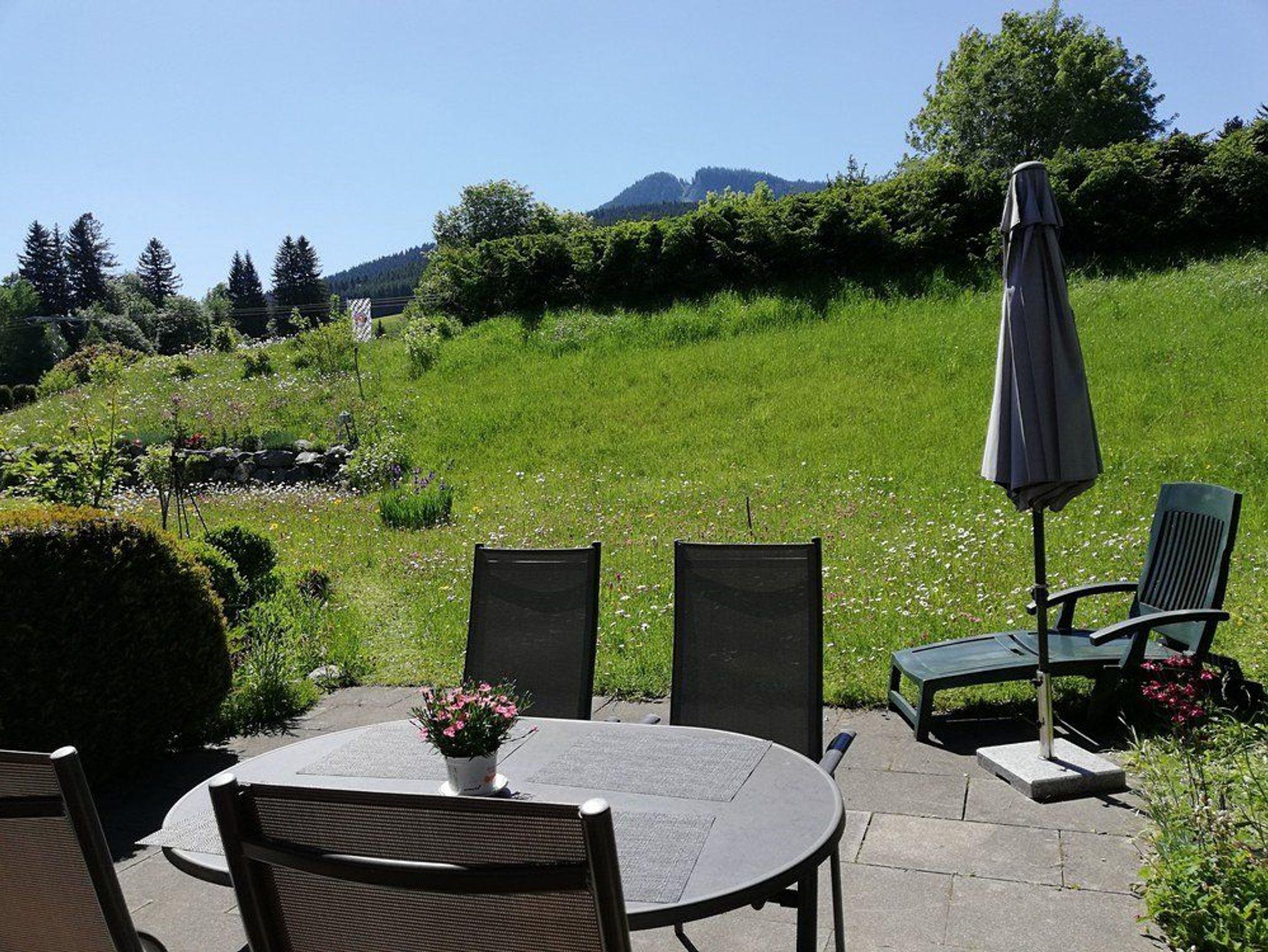 Die Terrasse ist möbliert und bietet mit durch die Südlage einen freien Blick auf den Nesselwanger Hausberg - die Alpspitze. Zum Ferienhaus gehören außerdem ein Stellplatz sowie eine Garage.