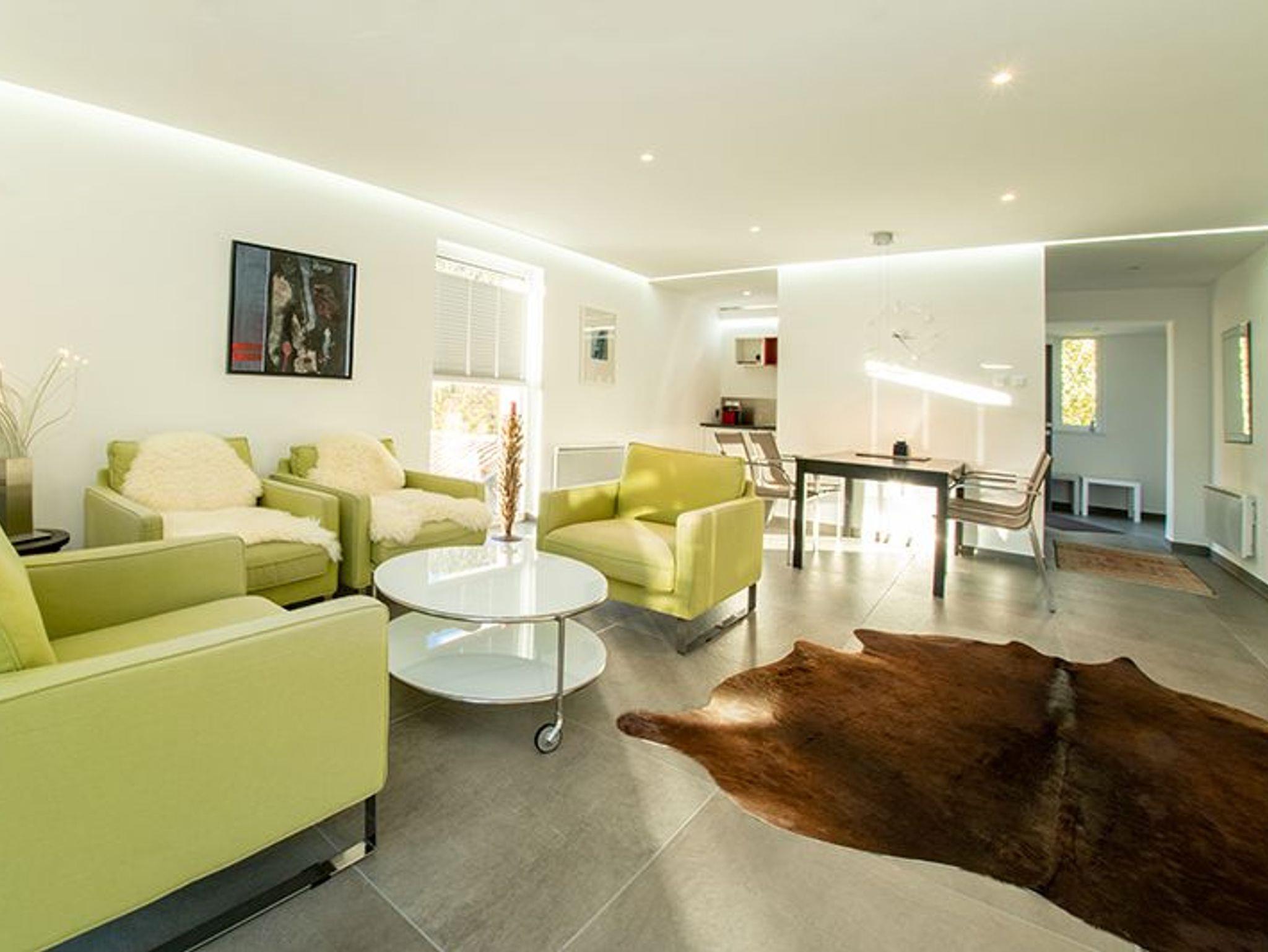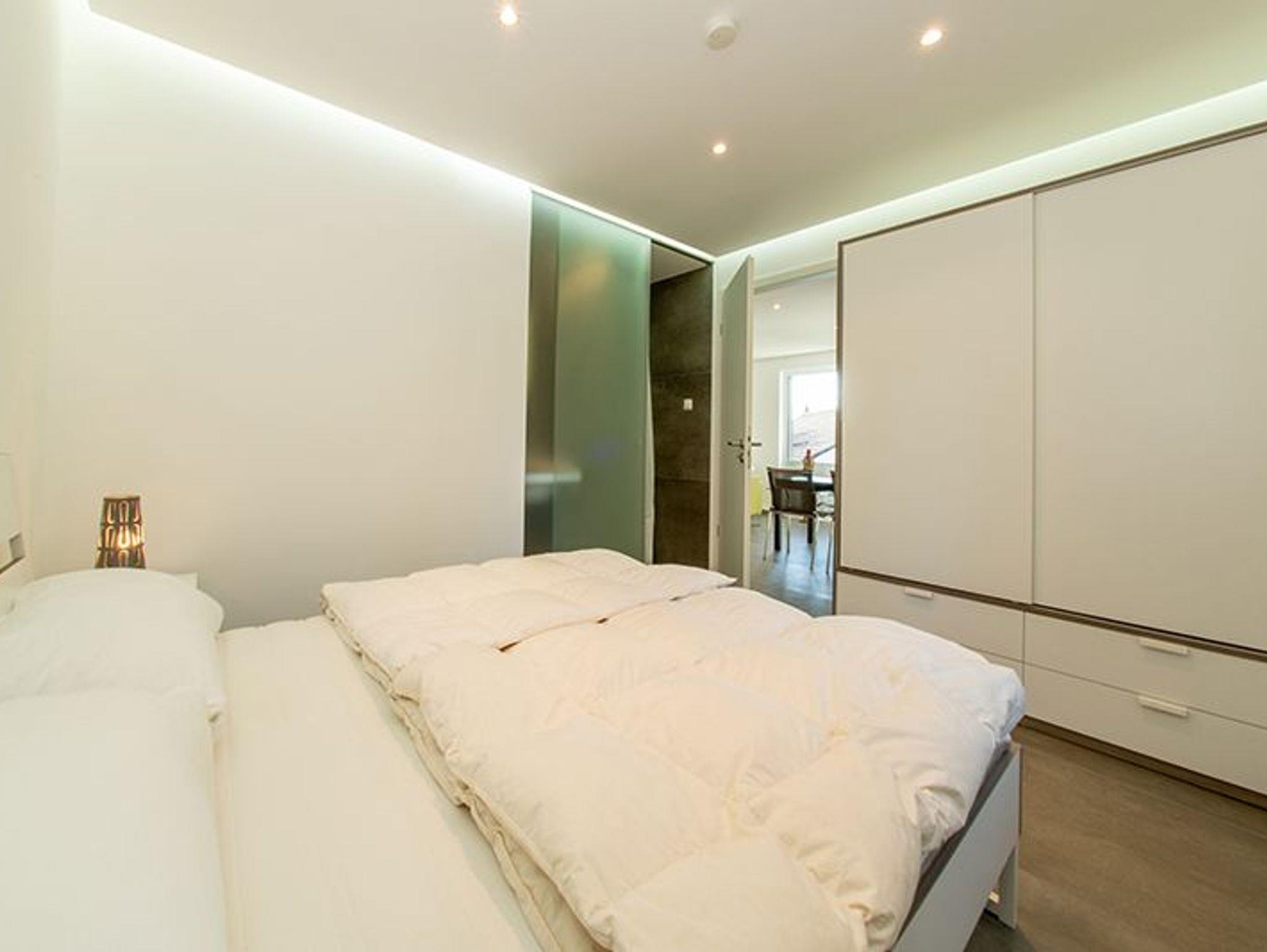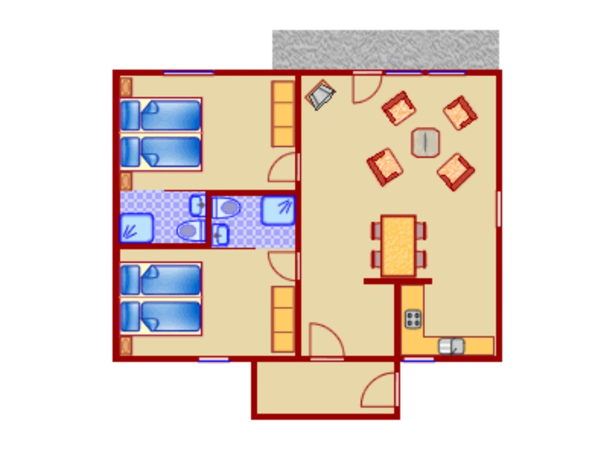 Der große Wohnraum mit Küche, zwei Schlafzimmern mit integrierten Bädern, Vorraum mit Abstellkammer, eine großer Wintergarten sowie 2 PKW-Stellplätze bieten 4 Personen bequem Platz.