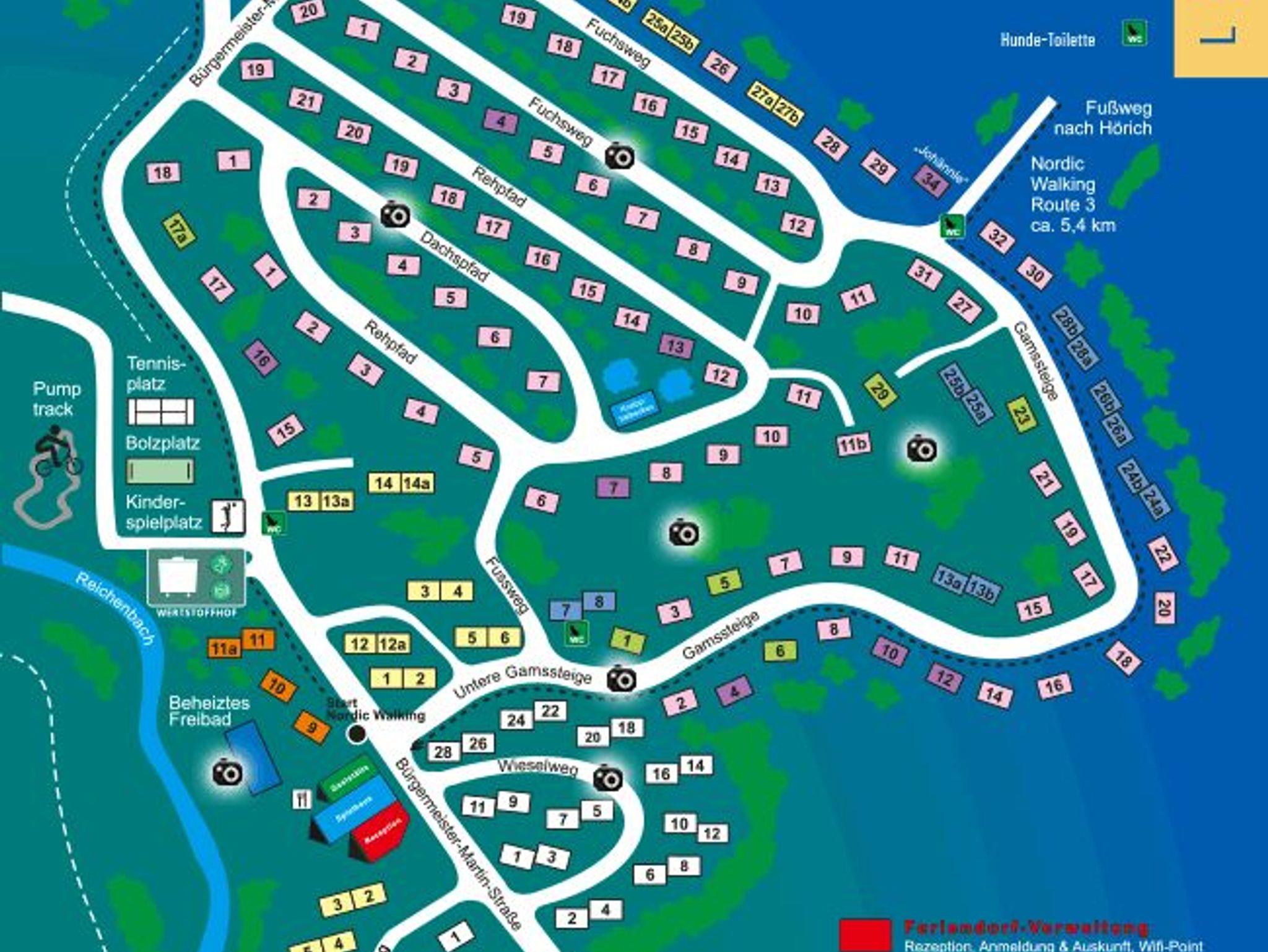 Das Haus Fuchsweg 17 liegt am ruhigen oberen Rand des Feriendorfes und bietet Platz für bis zu sechs Personen. Es verfügt über drei Schlafzimmer, davon zwei mit Doppelbetten und eines mit einem Hochbett sowie einem zusätzlichen Bett für ein Kleinkind. Die Ausstattung macht es besonders geeignet für Familien.