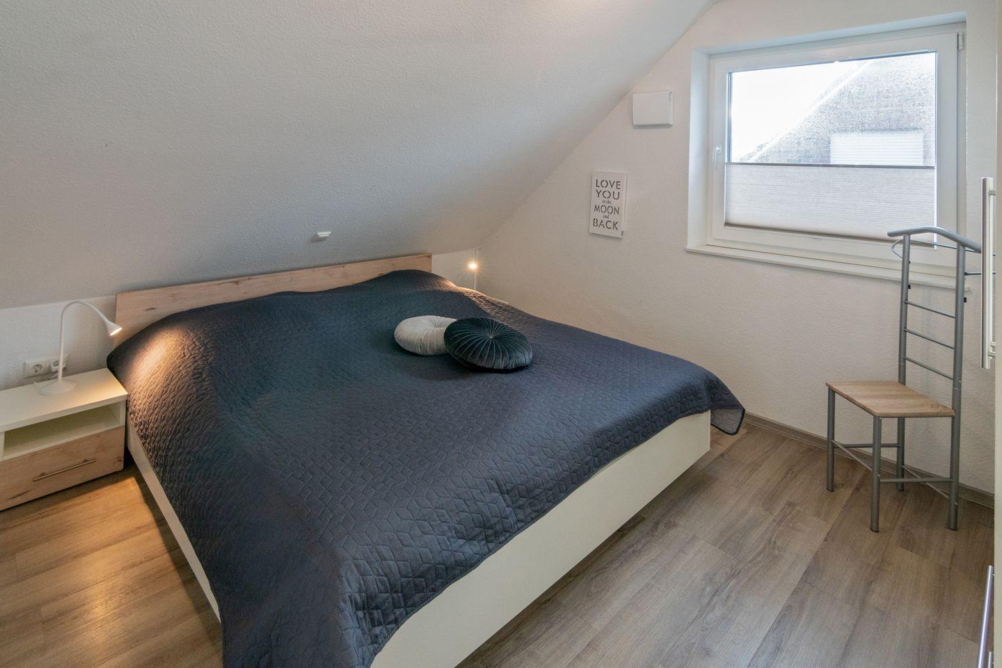 Die Wohnung verfügt über einen Wohn- und Essbereich mit voll ausgestatteter Küche, ein Schlafzimmer mit Ehebett und ein Duschbad mit WC. Über eine gut begehbare Treppe gelangen Sie zum zweiten Schlafzimmer mit zwei Einzelbetten (mit Bettschublade für eine weitere Person). Auf dem Süd-Balkon mit Gartenmöbeln können Sie sich entspannen. Waschmaschine und Trockner stehen Ihnen kostenlos zur Verfügung. In allen Wohn- und Schlafräumen sind Fernseher vorhanden. Babybett nicht stellbar in den Schlafräumen. Trotz Haustierverbots ist die Wohnung nicht für Allergiker geeignet. Der Wohnbereich ist mit elektrischen Rollo´s ausgestattet.