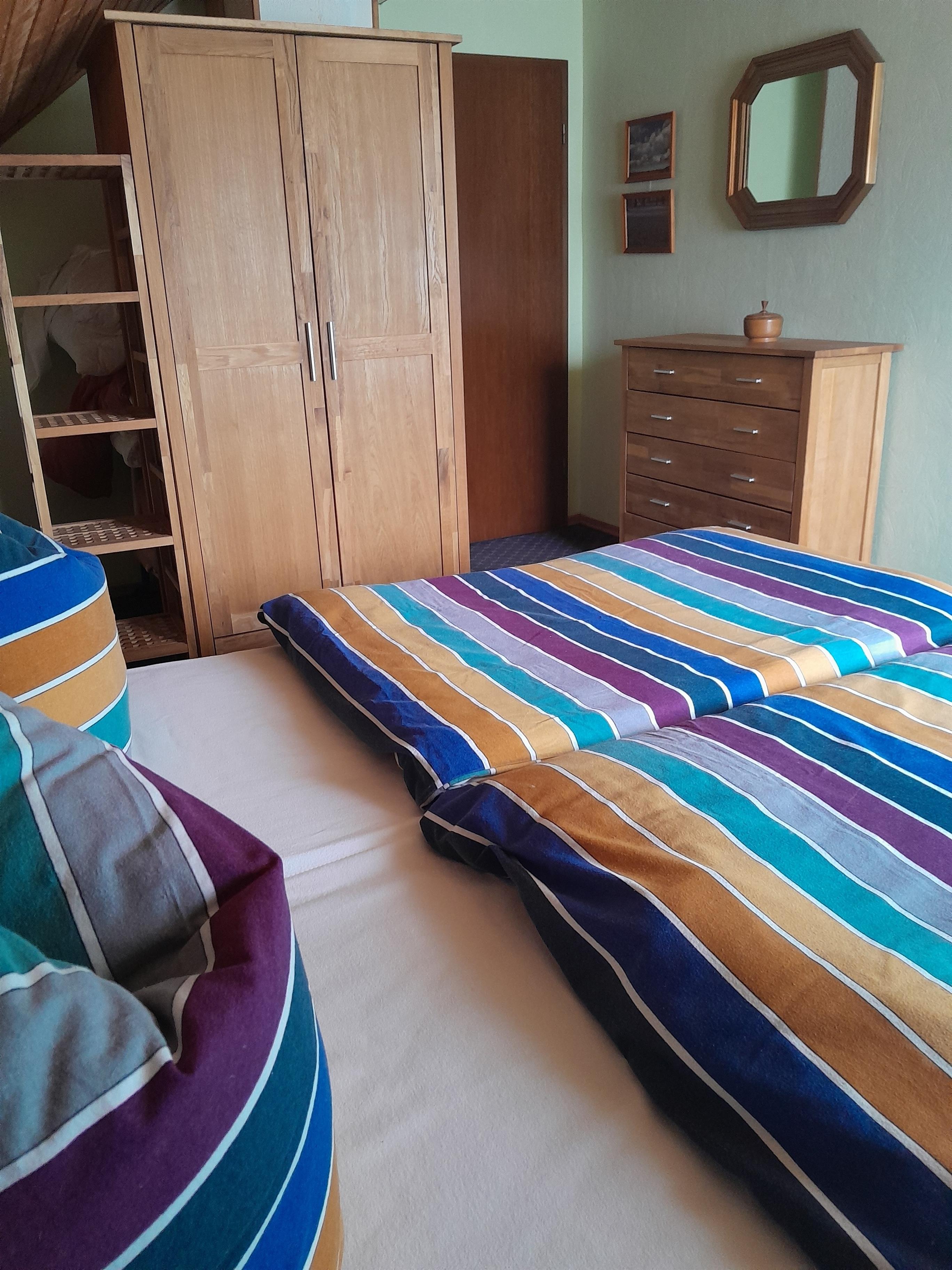 Schlafzimmer (Ostseite, Doppelbett), Duschbad/WC (Föhn sowie gr. Dachflächenfenster).