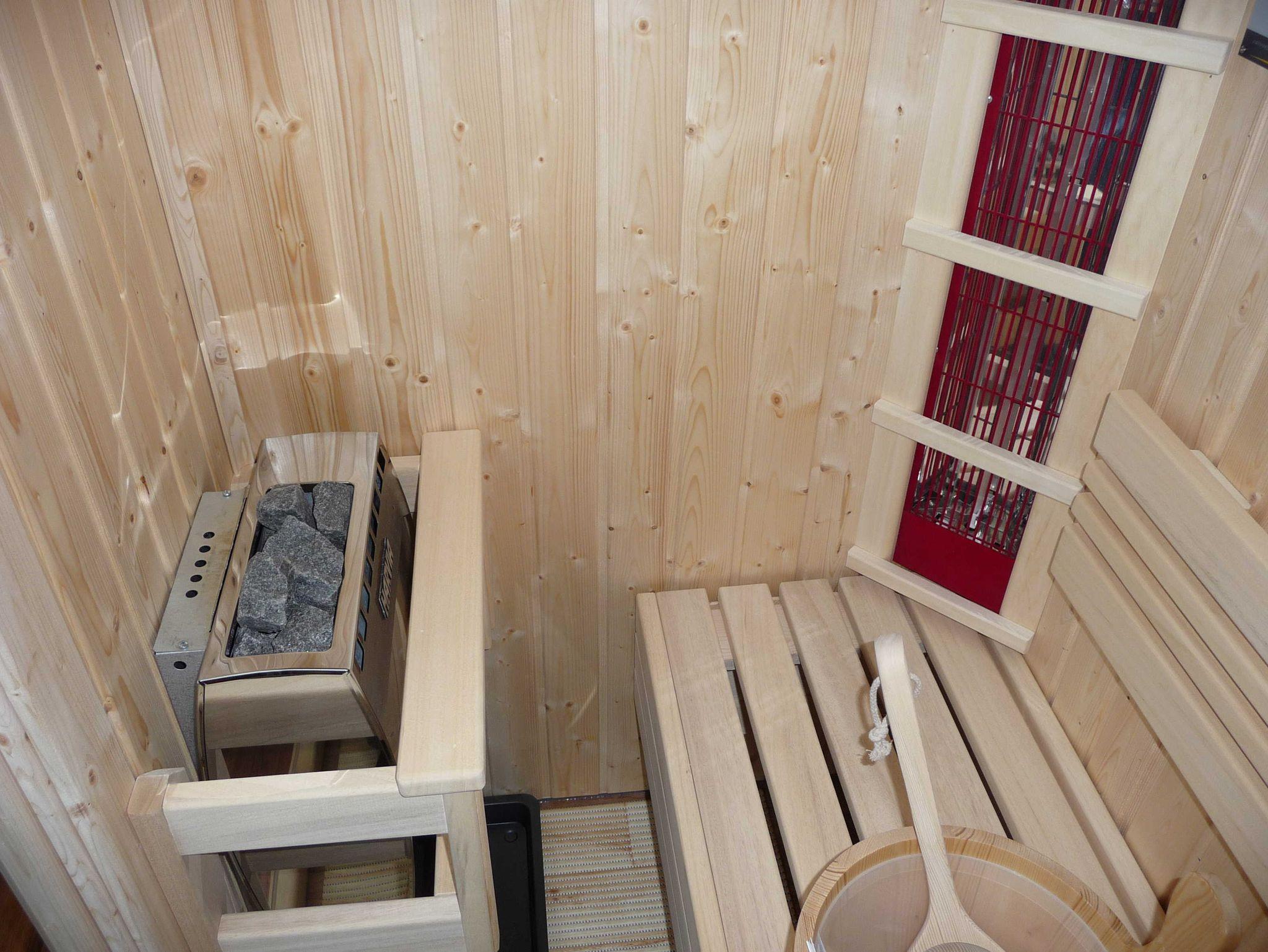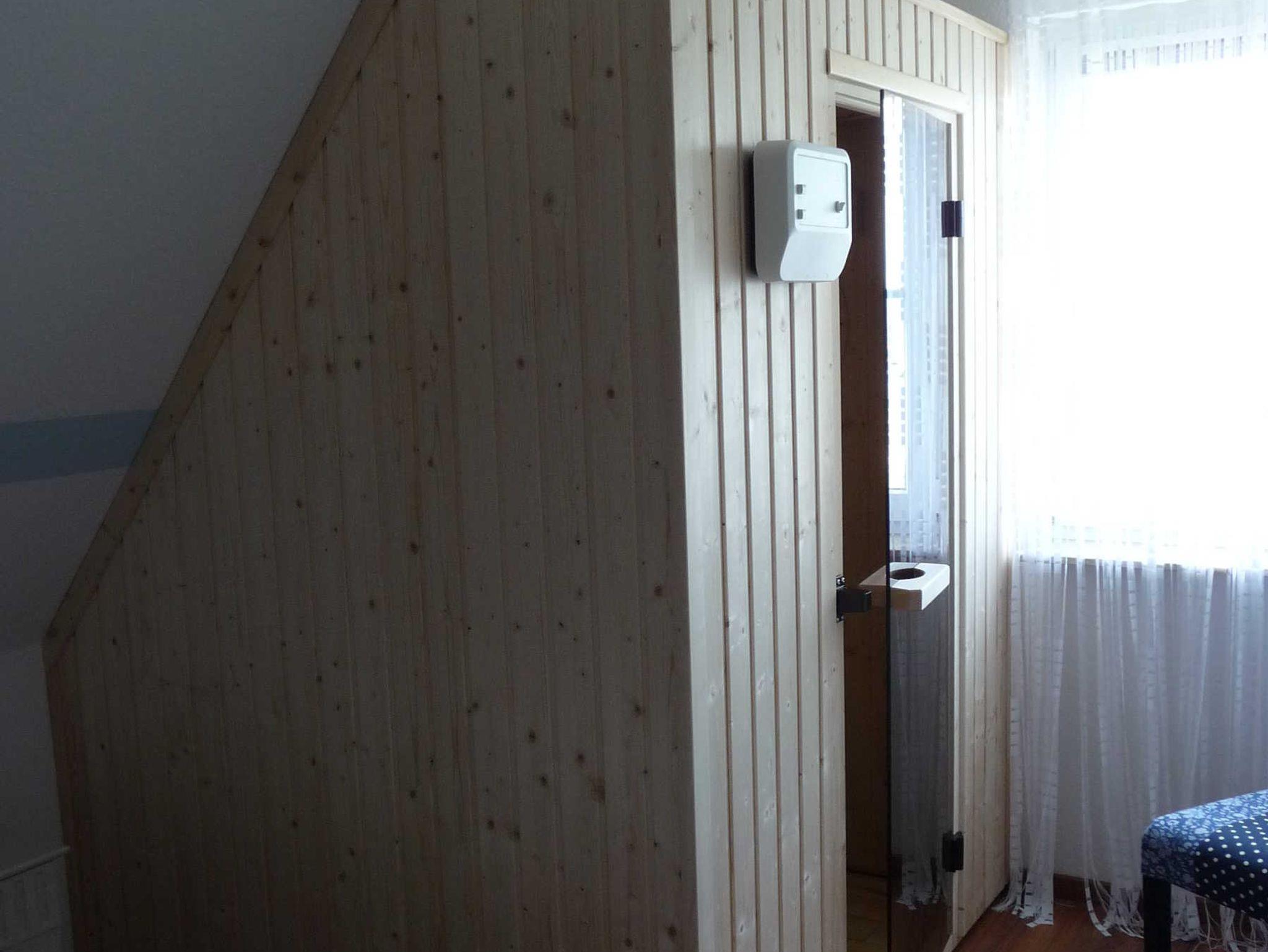 In der Haushälfte Kranich, rechts befindet sich die Sauna/Infrarotkabinenkombination im Masterschlafzimmer.