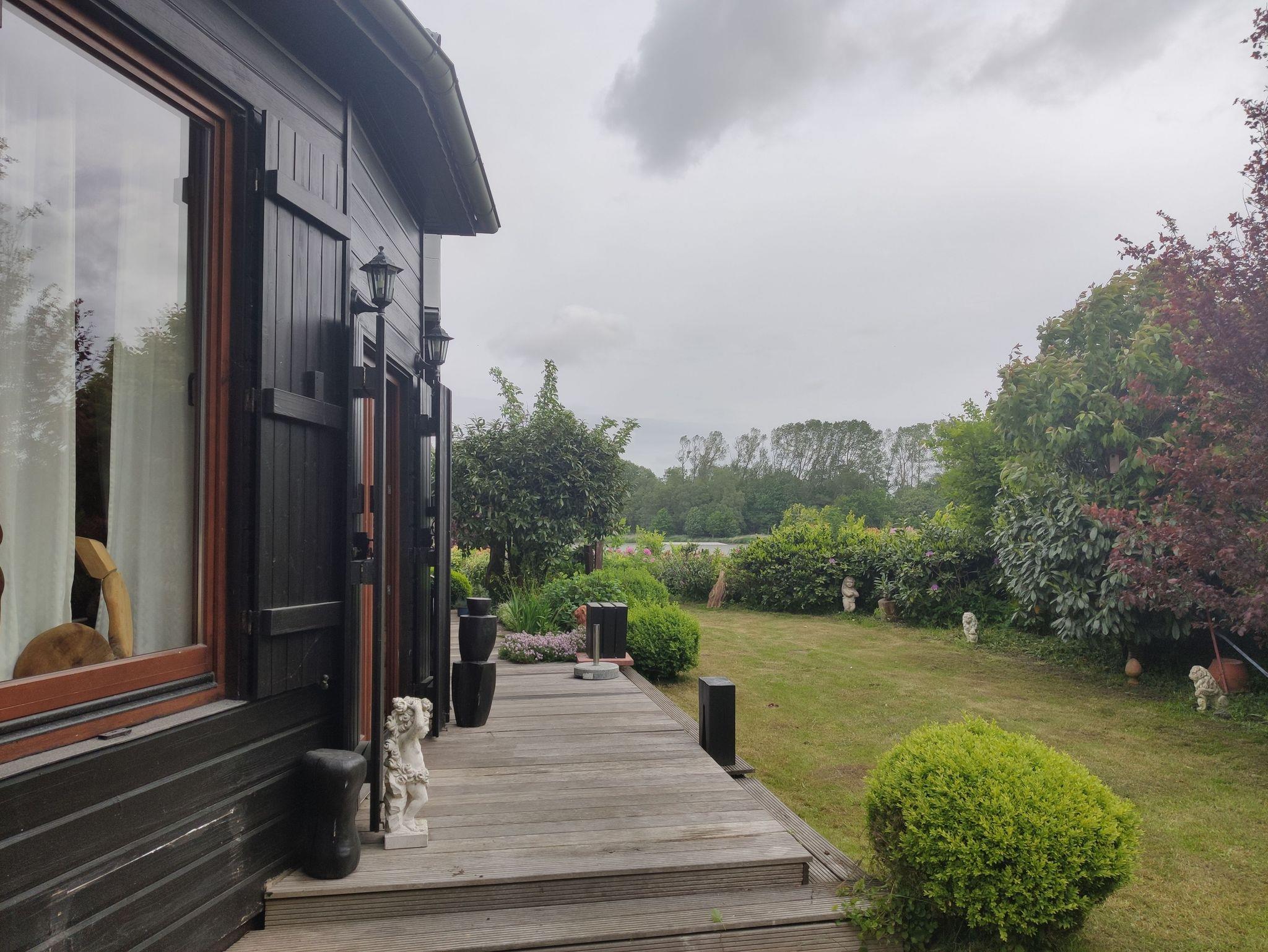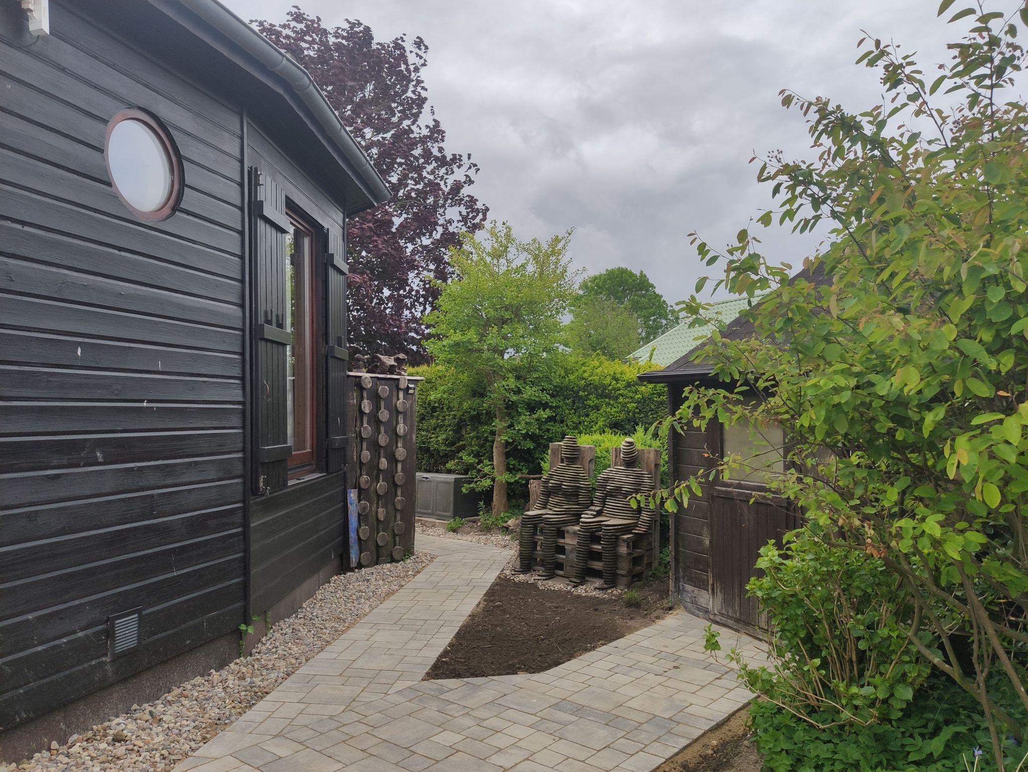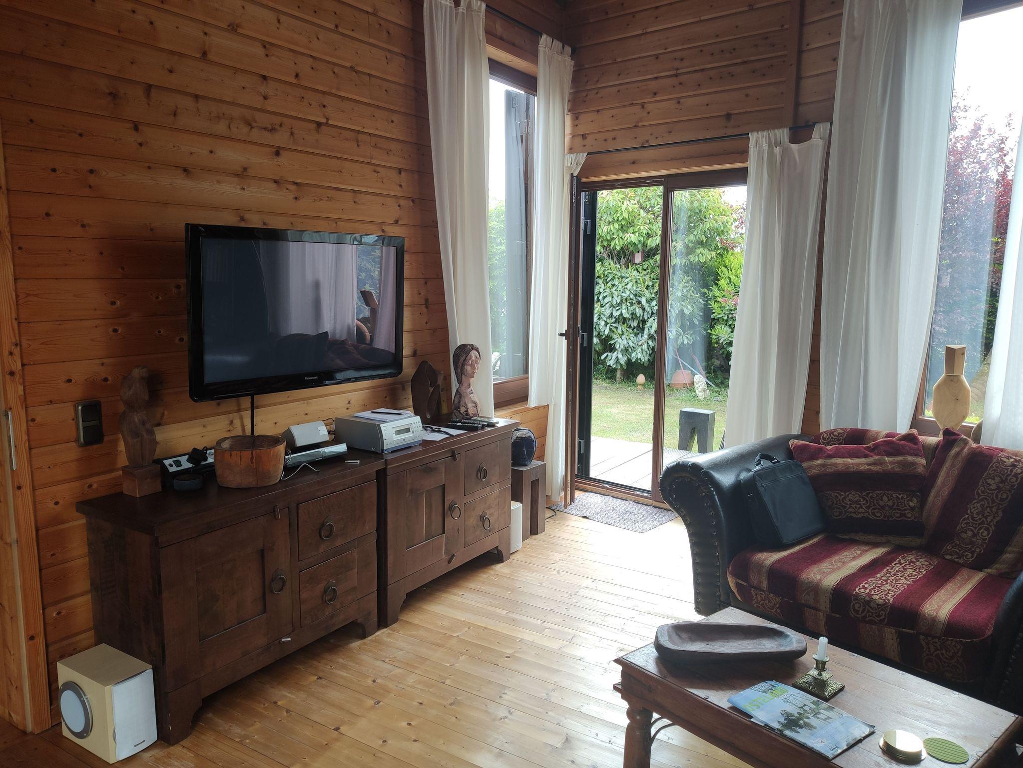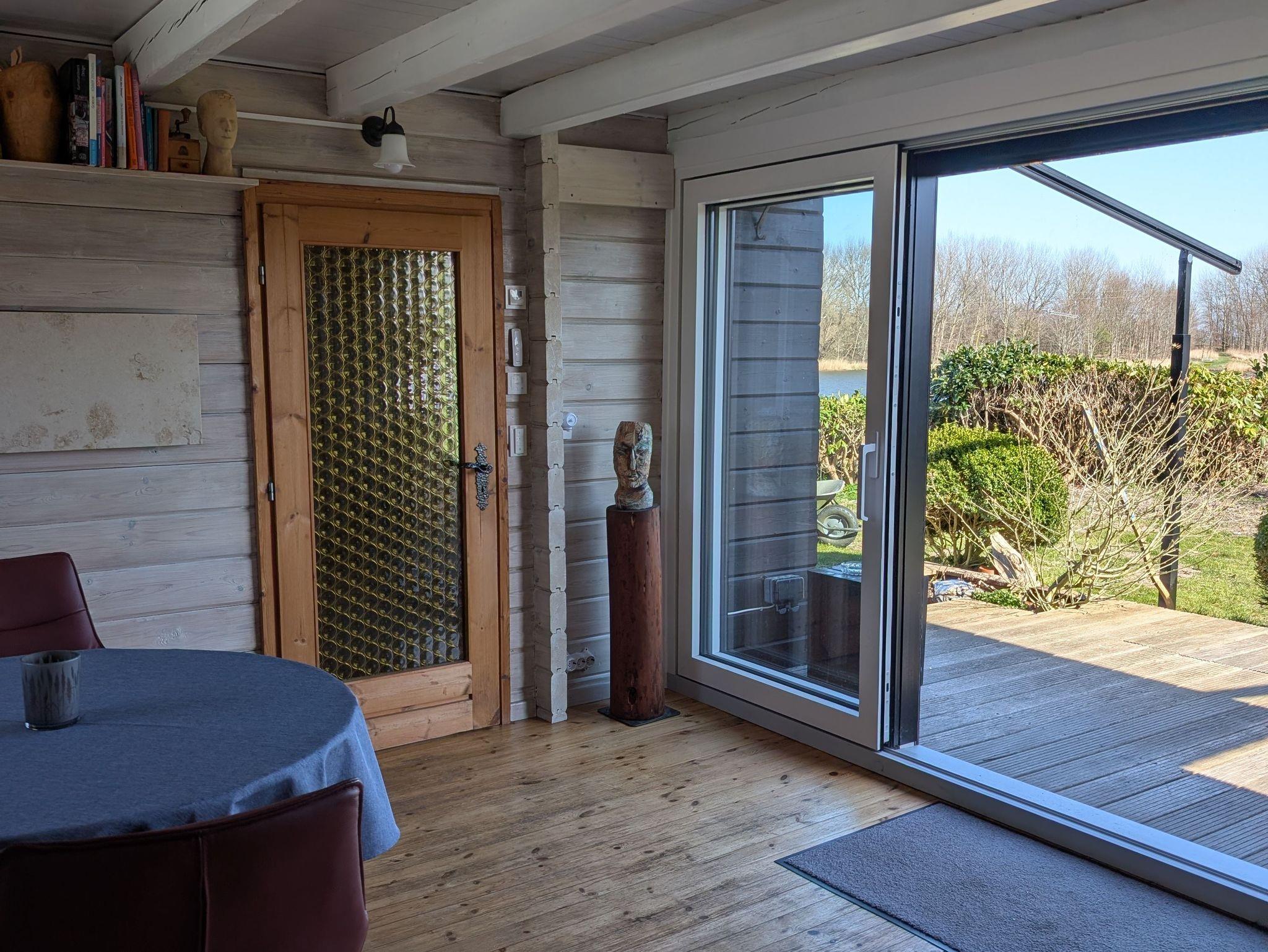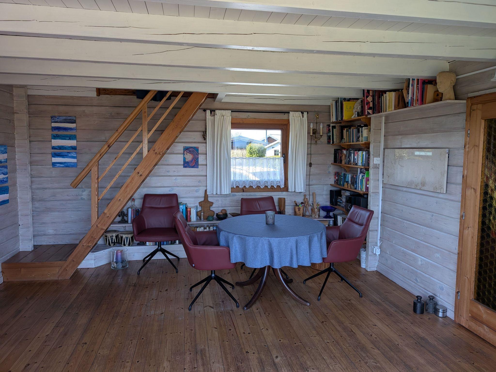 Das Ferienhaus verfügt über einen großen, gepflegten Garten. Büsche und alte Bäume begrenzen das Grundstück. Im Erdgeschoss befindet sich das Esszimmer. Dieses ist großflächig verglast und lässt so viel Licht in den Raum einströmen. Das Esszimmer verfügt über eine große Terrassentüre, die barrierefrei den Weg auf die Sonnenterrasse freigibt. Die Terrasse ist mit einer feststehenden Terrassenmarkise überdacht, die ausgefahren, auch an regnerischen Tagen einen Aufenthalt im Freien ermöglicht. Neben dem Esszimmer befindet sich die vollständig eingerichtete Küche. Von dort aus gelangen Sie in das Kaminzimmer des Haues. Dieses ist eine architektonische Besonderheit. In einer Höhe von anderthalb Geschossen spannt sich eine Holzbalkendecke über den Raum und vermittelt so den Eindruck, in einer Art Wohnturm zu sein. In einer Ecke des Raumes befindet sich ein großer, gekachelter Kamin, der dem Raum seinen Namen gibt. Aufgrund seiner Form und Höhe fällt er auf und gibt dem Raum seinen besonderen Charakter.