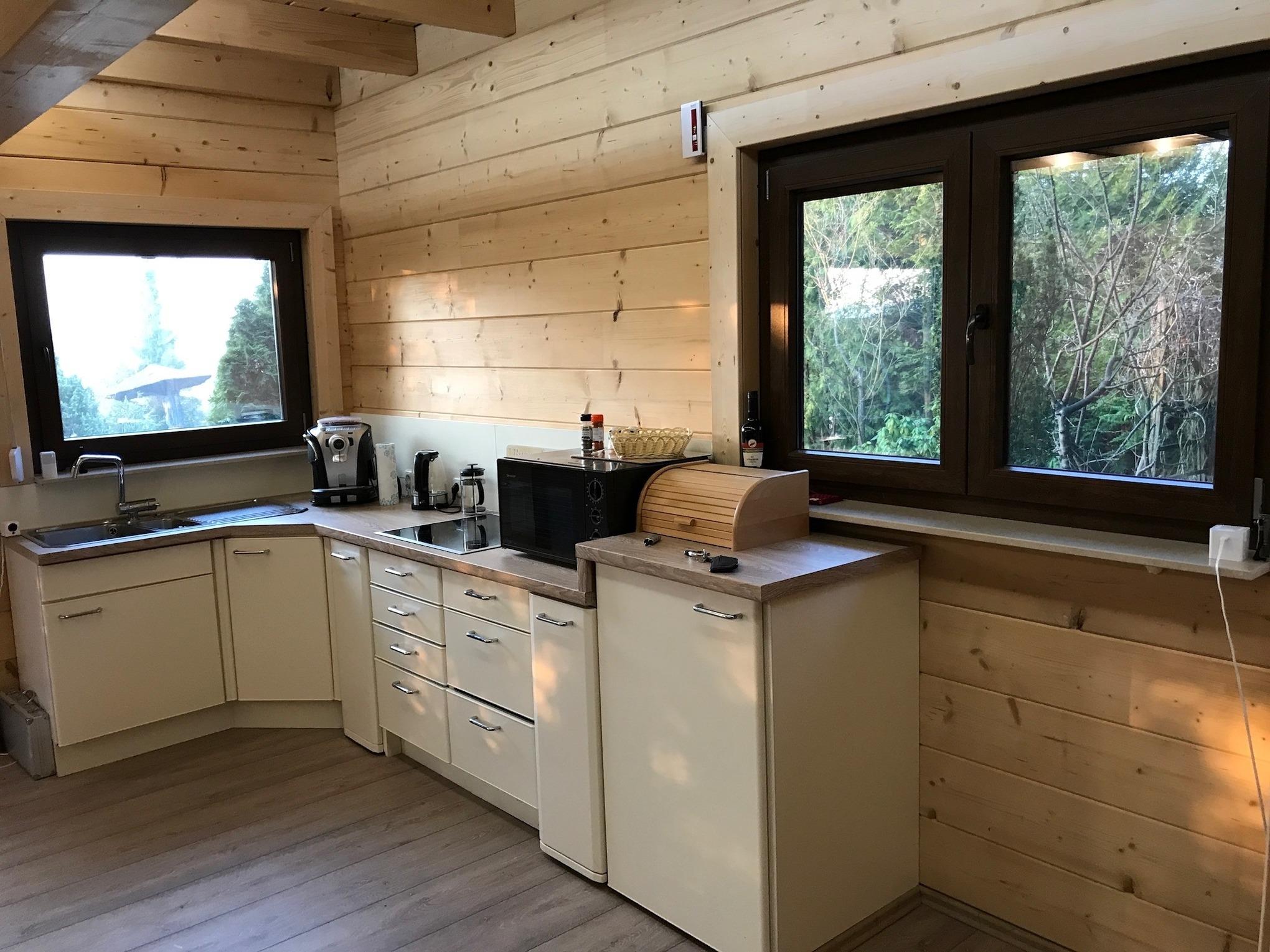 Zwei große helle ausgestattete Küchen mit Kühl- und Gefrierschrank, Mikrowelle