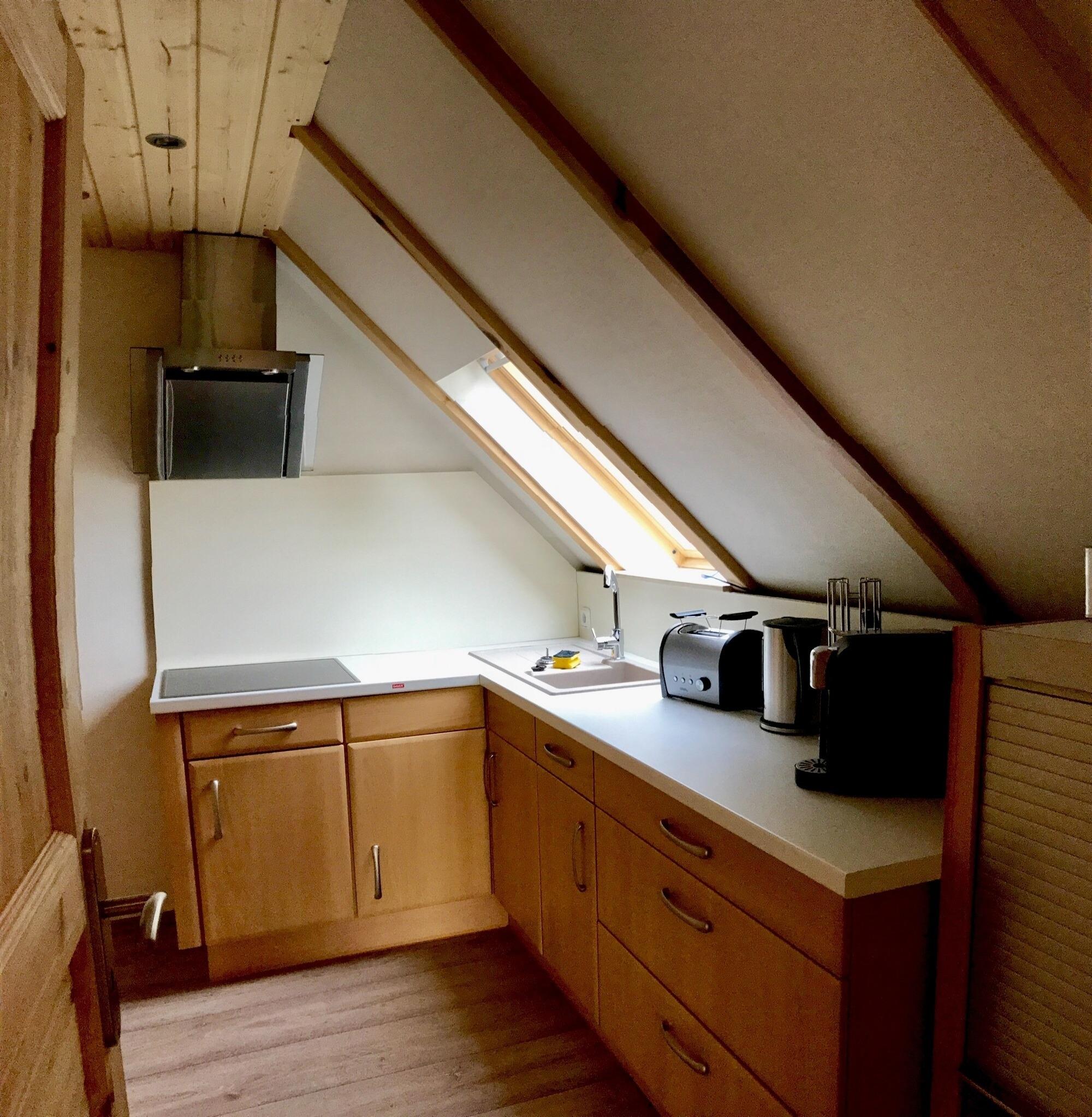 Zwei Etagen mit separater Küche, Wohn & Essbereich, Bett, Bad mit WC & Dusche.