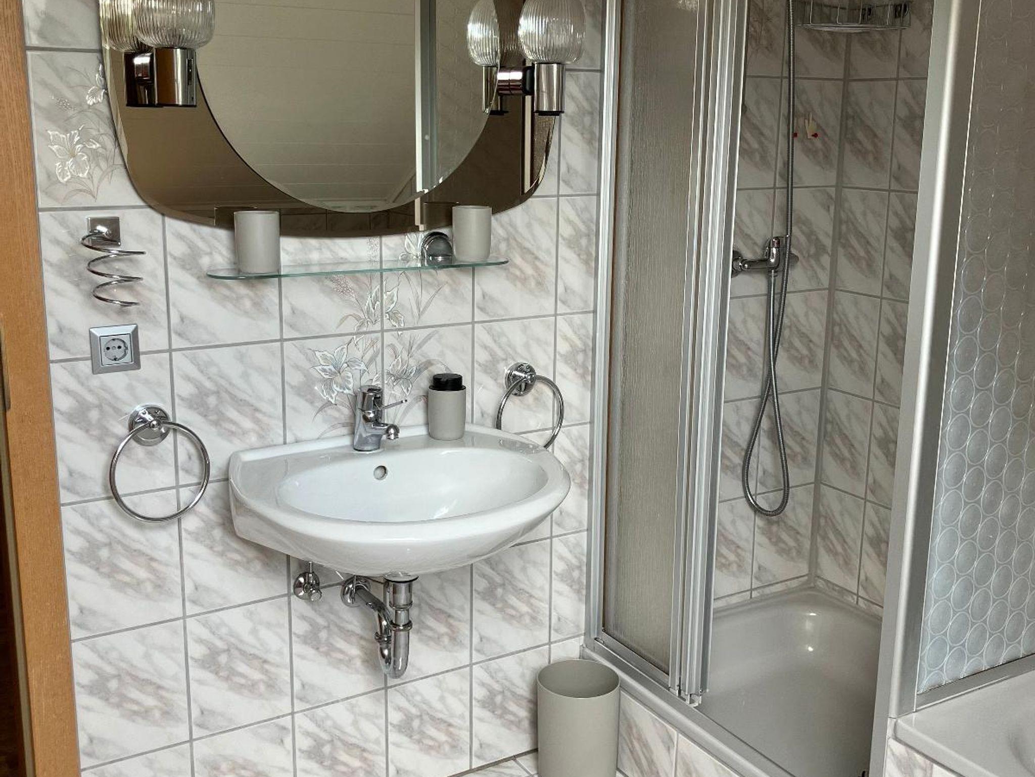 Das Badezimmer besteht aus einer Dusche, einer Badewanne, Waschbecken mit Spiegel, Badmöbel und einem separatem Handtuchhalter.