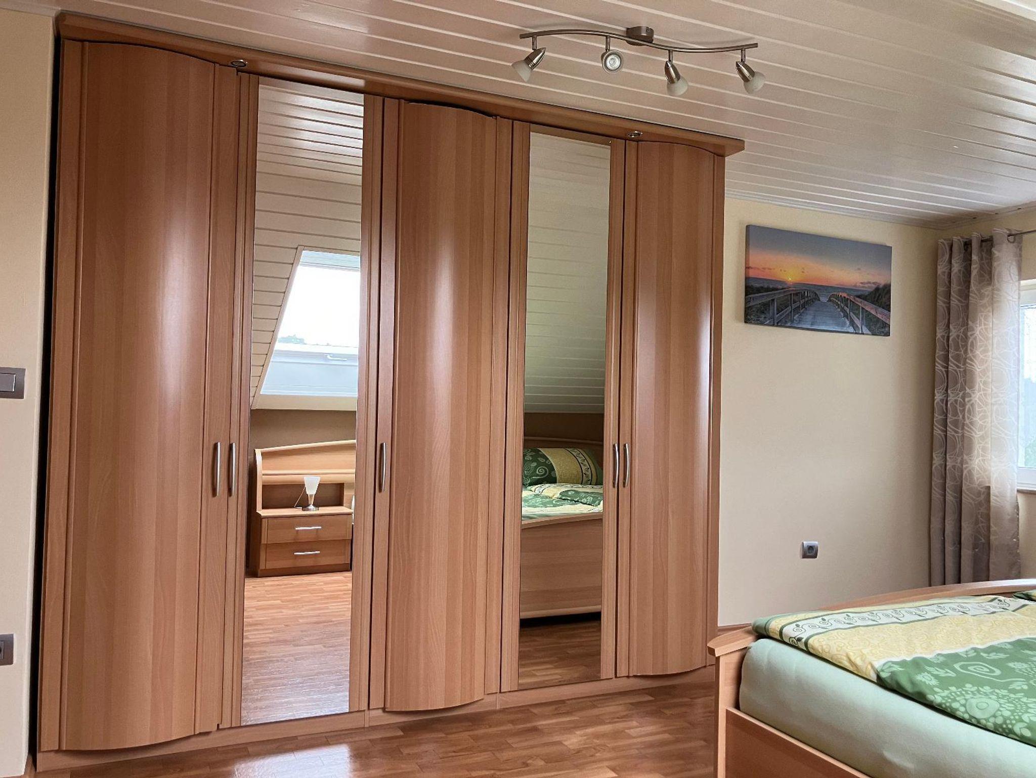 Im ersten Schlafzimmer ist ein Doppelbett mit großem Kleiderschrank vorhanden.