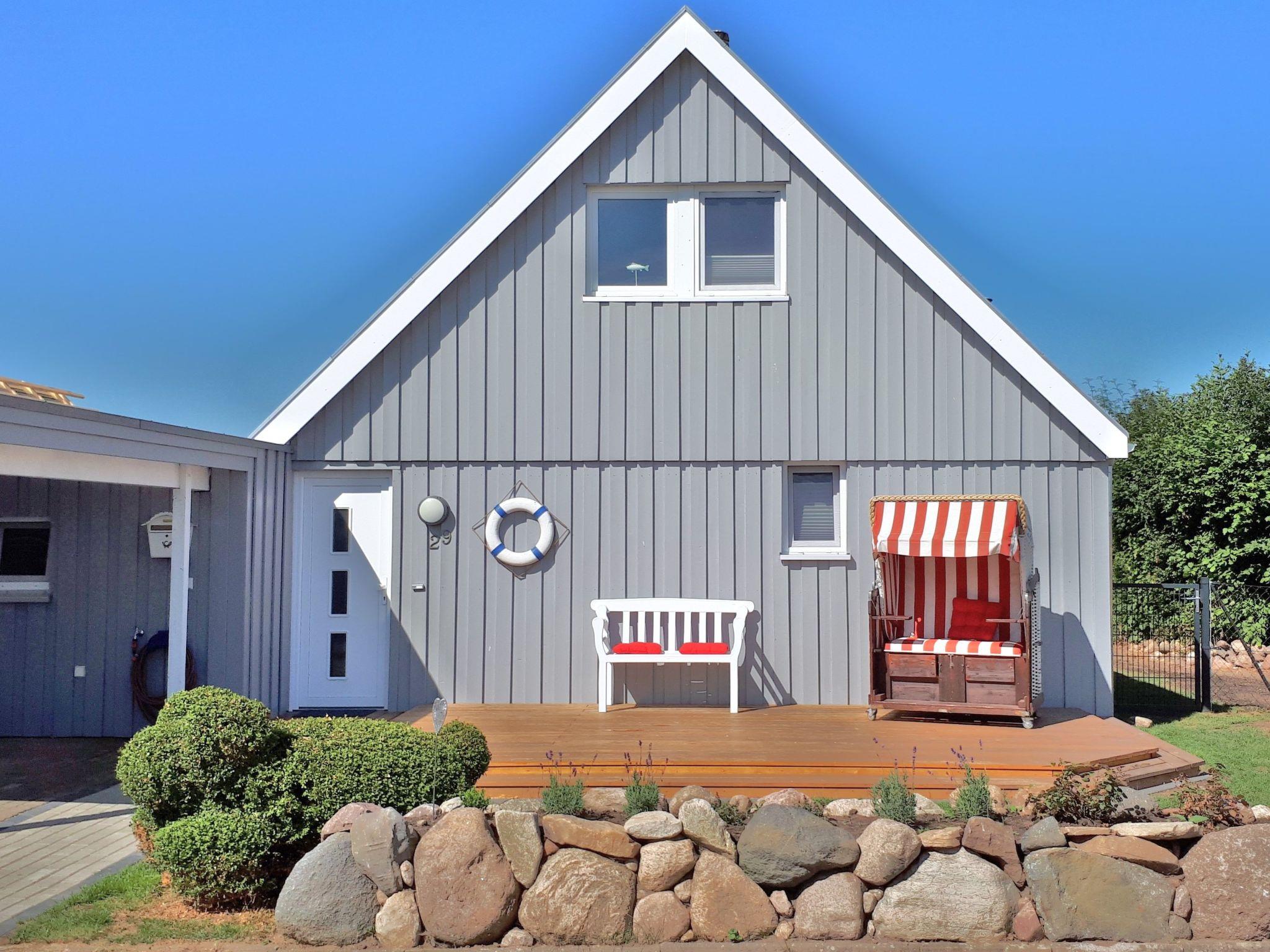 The two wooden terraces are equipped / in front of the house with a beach chair overlooking the Baltic Sea and a bench. Behind the house there are two loungers and 1 table set with parasol, as well as a small settee for chilling out. The terraces invite you to laze around. There is a barbecue area with a stainless steel grill. There is an unobstructed view of the fields and woods.