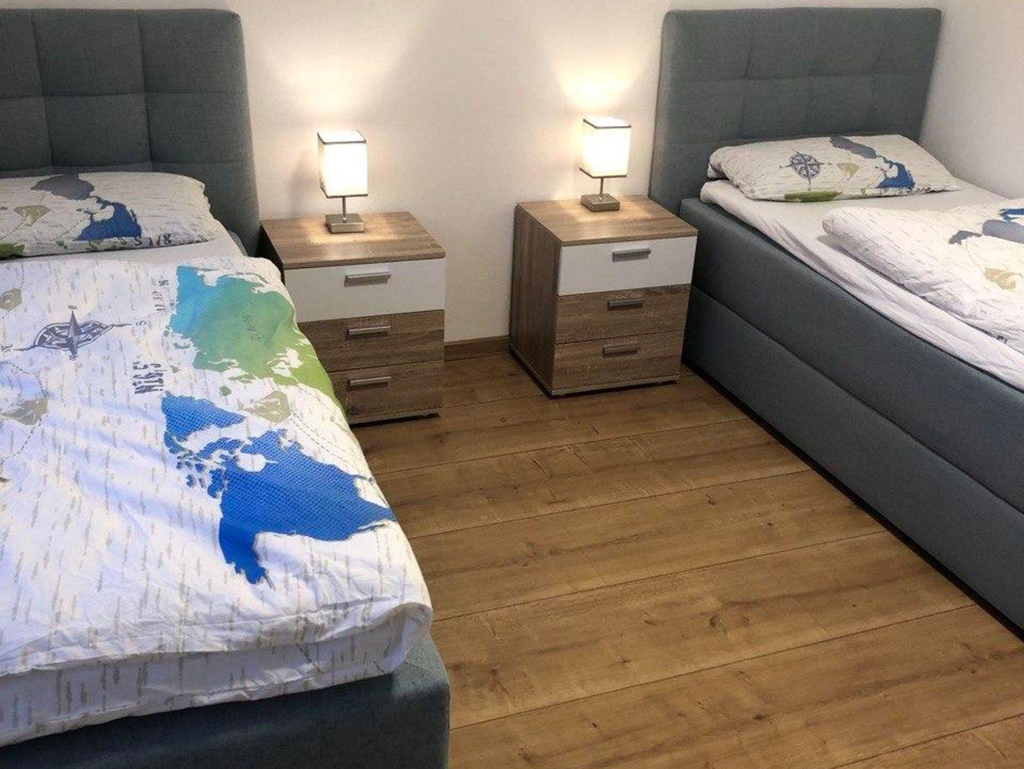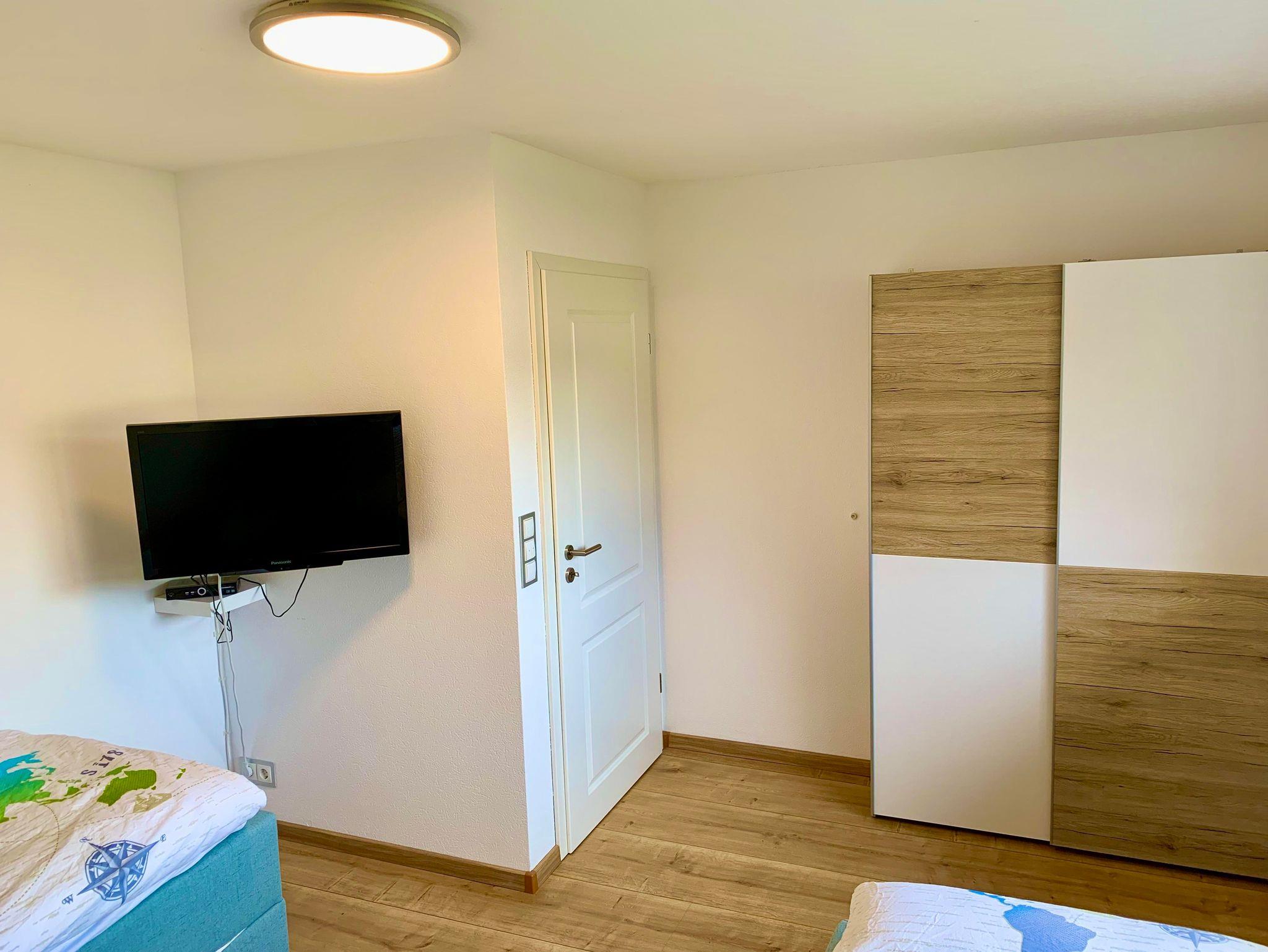 Im Wohnschlafzimmer befindet sich ein großer Flachbildfernseher, einen weiteren gibt es im Schlafzimmer mit den Einzelbetten. Jeweils zu den beiden Schlafzimmern gehört ein eigener Kleiderschrank. Im Duschbad ist ebenfalls genügend Platz für Kosmetikartikel, die man im Spiegelschrank unterbringen kann.
