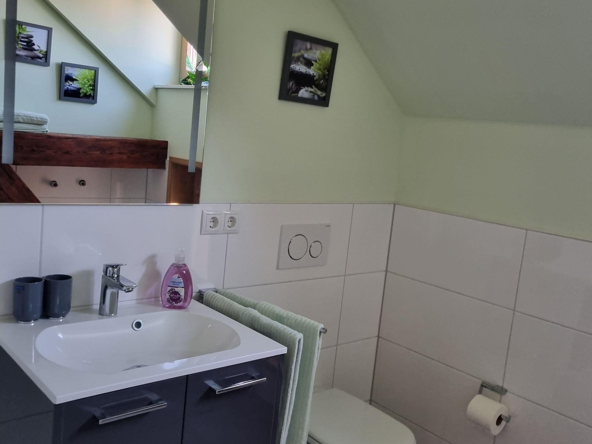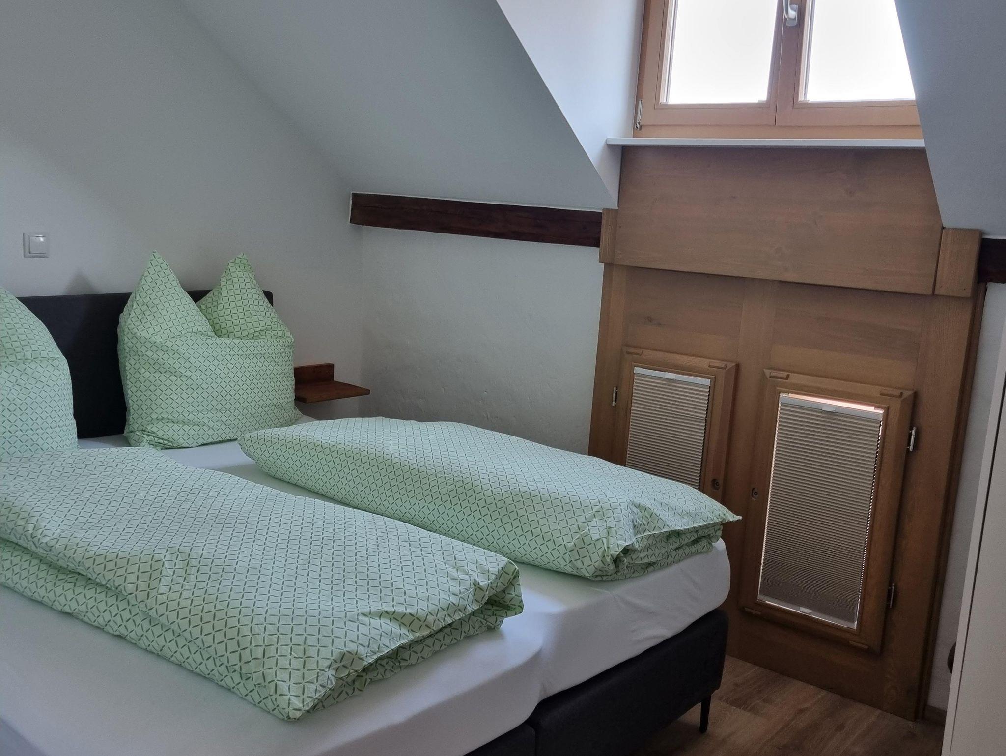 Unsere neu ausgebaute (2022) Fewo mit 2 SZ befindet sich im DG des Hauses. Die SZ sind mit Boxspringbetten ausgestattet (Betten sind bezogen).