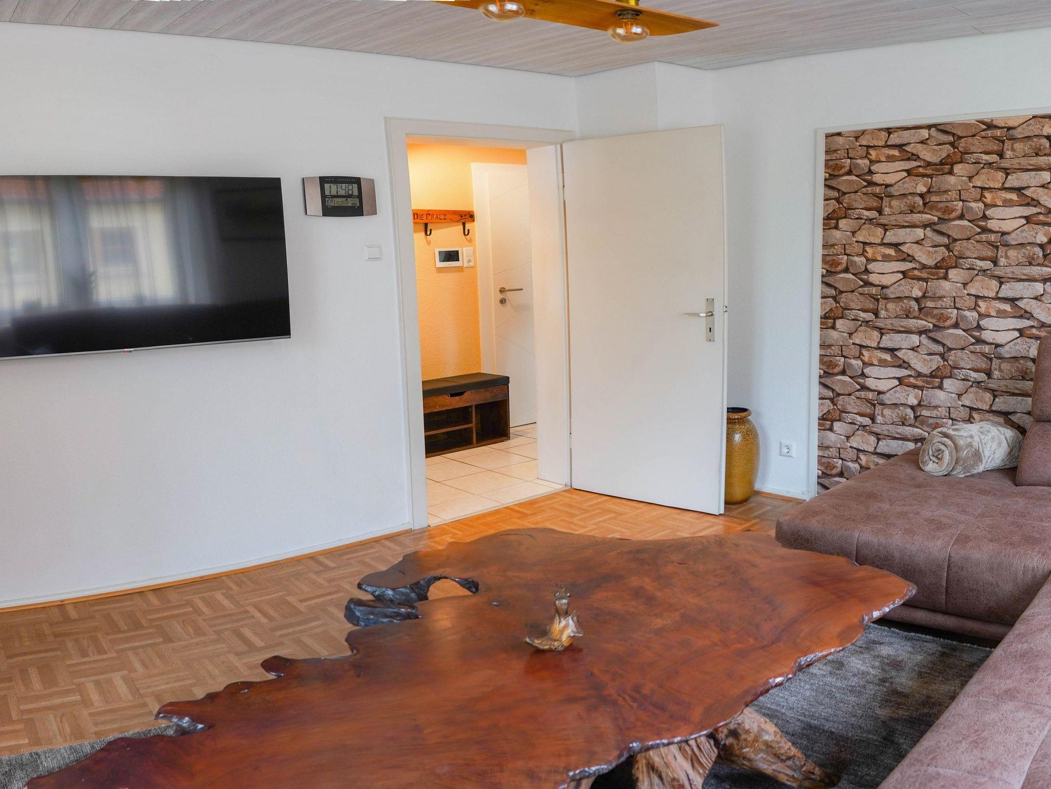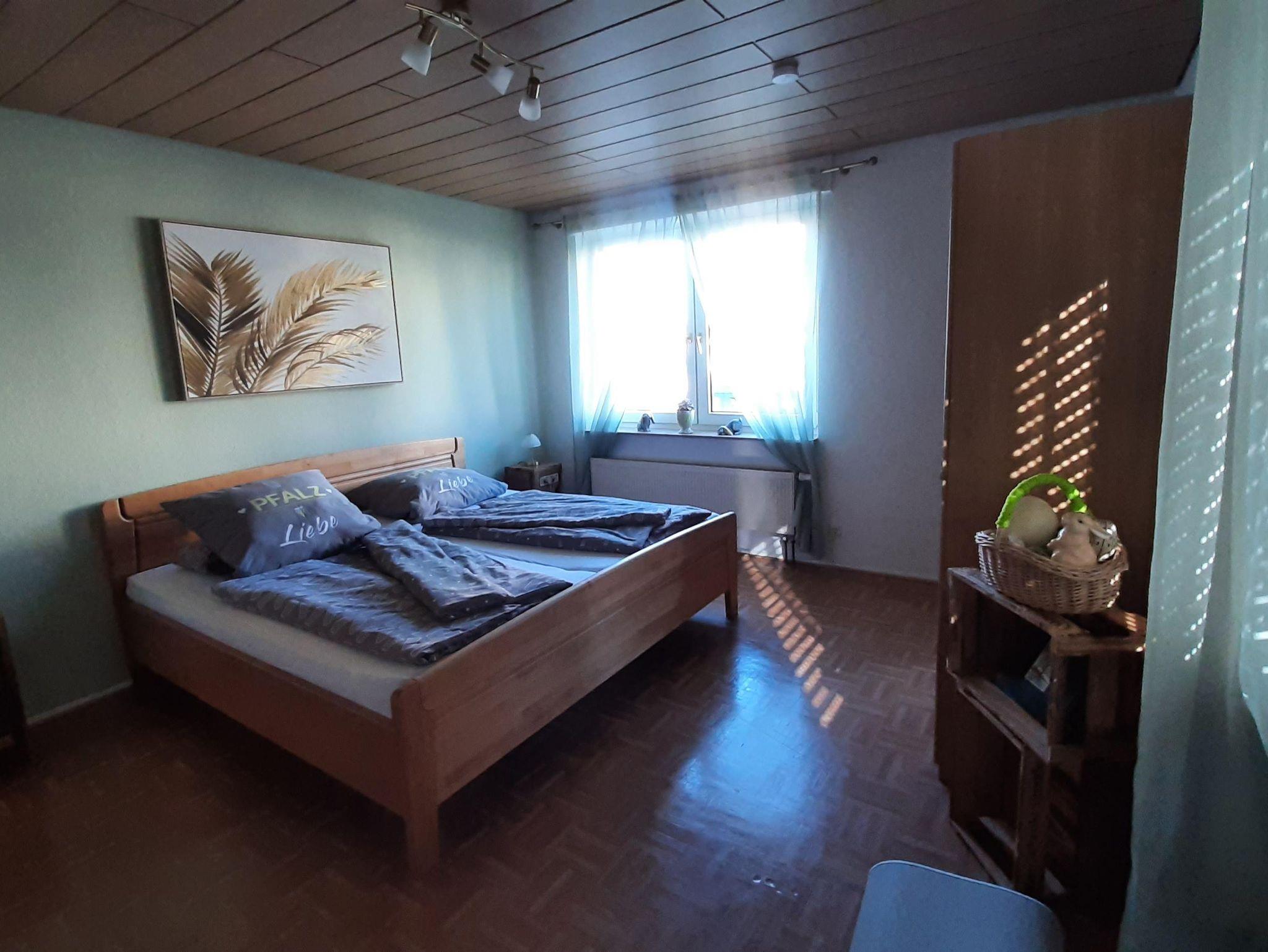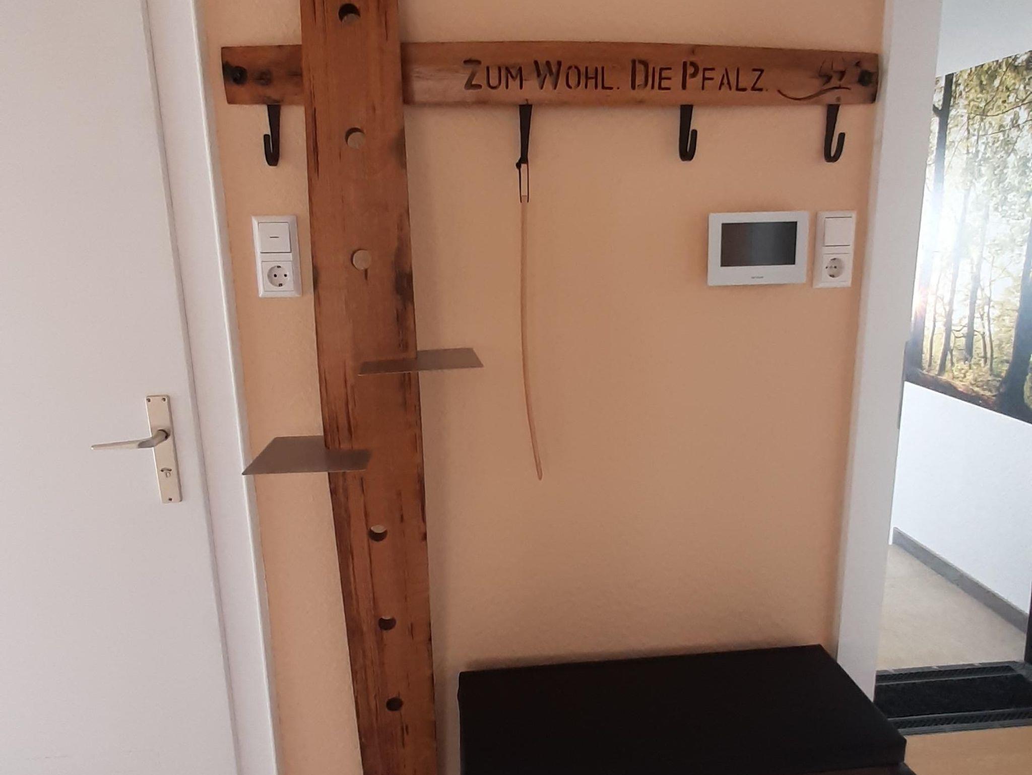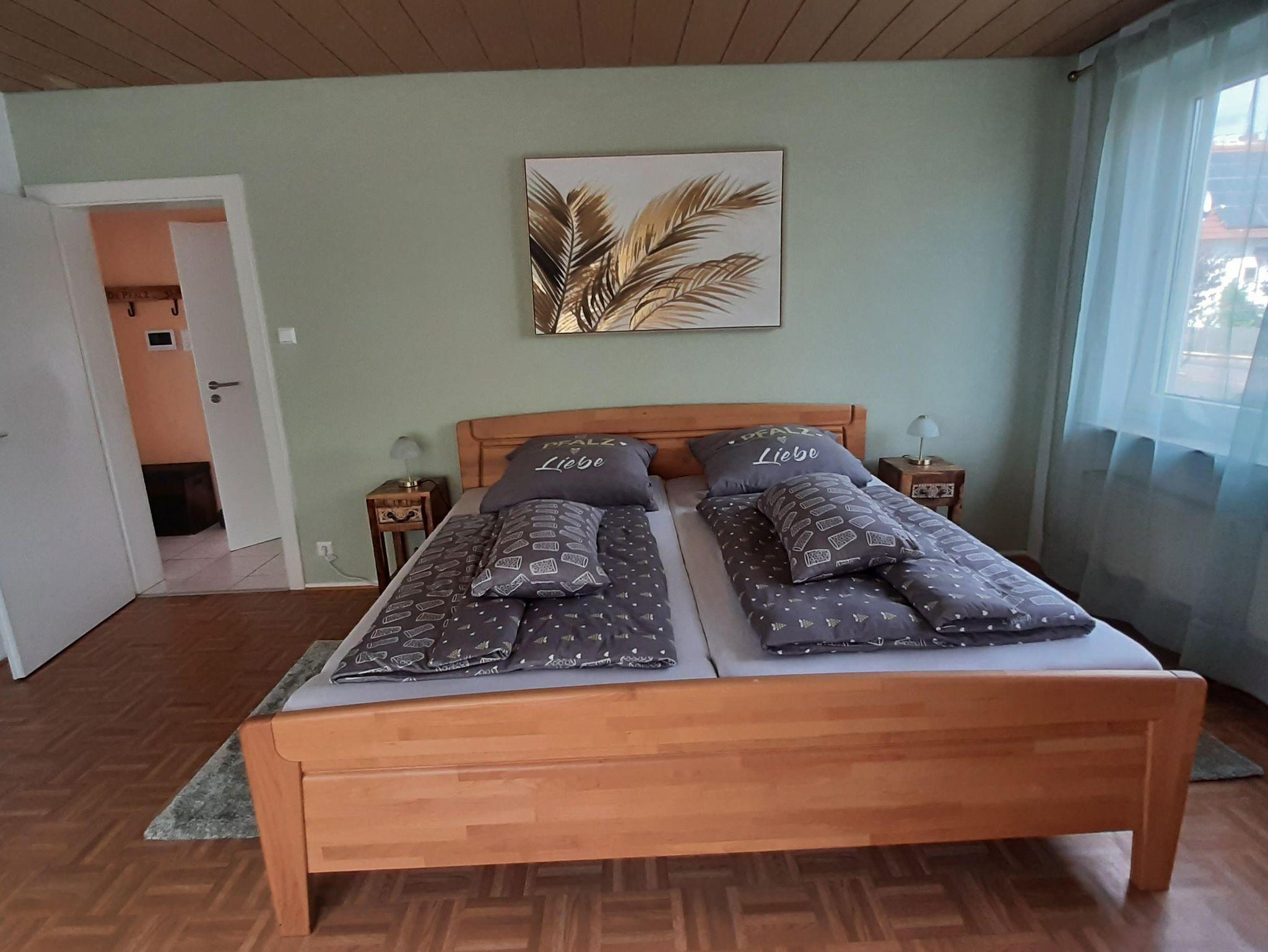 Die Wohnung bietet ihnen zwei schöne geräumige Schlafzimmer mit jeweils einem Doppelbett 2x2 Meter. Das Ambiente der gesamten Wohnung haben wir bewusst typisch pfälzisch ausgewählt, von der Bettwäsche bis zu den vielen Kleinigkeiten - sogar die Garderobe. Das Wohnzimmer verfügt über einen XXL-Fernseher mit Internet-Anschluss und eine Couch, auf der sie auch zu viert bequem Platz finden. Die Küche ist mit einer neuen Küchenzeile versehen inclusive Geschirrspüler, Kaffeemaschine, Toaster usw. Im Bad überrascht sie eine recht große Dusche. Auf dem der Straße abgewandeten Balkon können sie bei entsprechendem Wetter herrlich entspannen. Natürlich verfügt die Wohnung über kostenfreies WLAN.