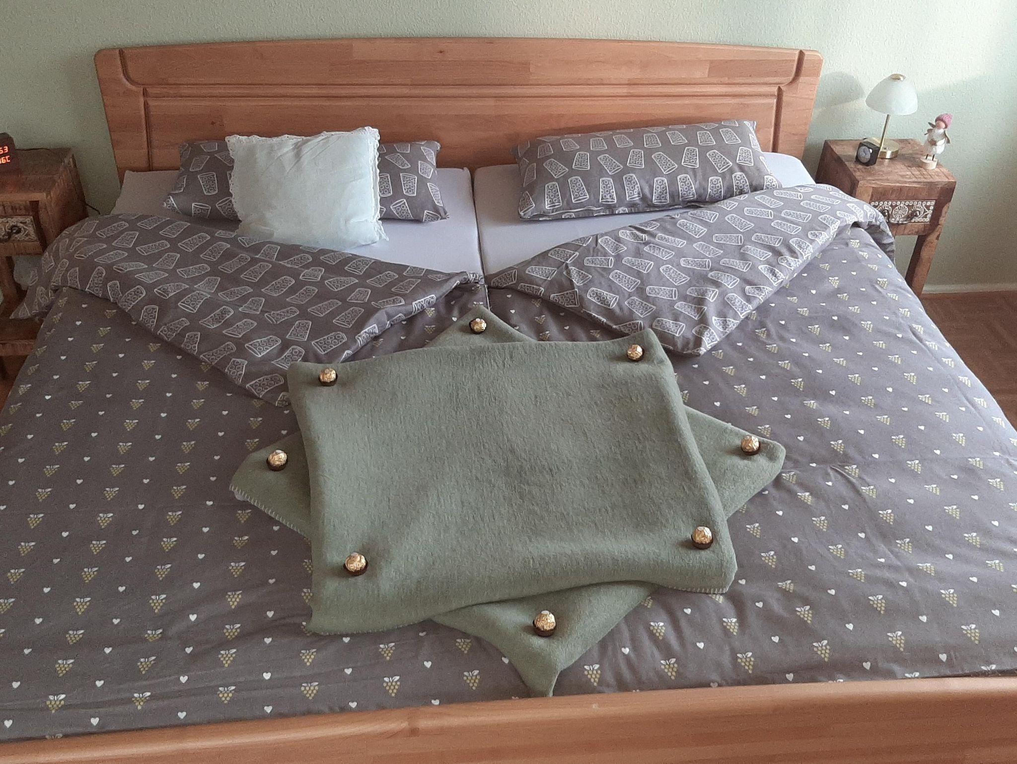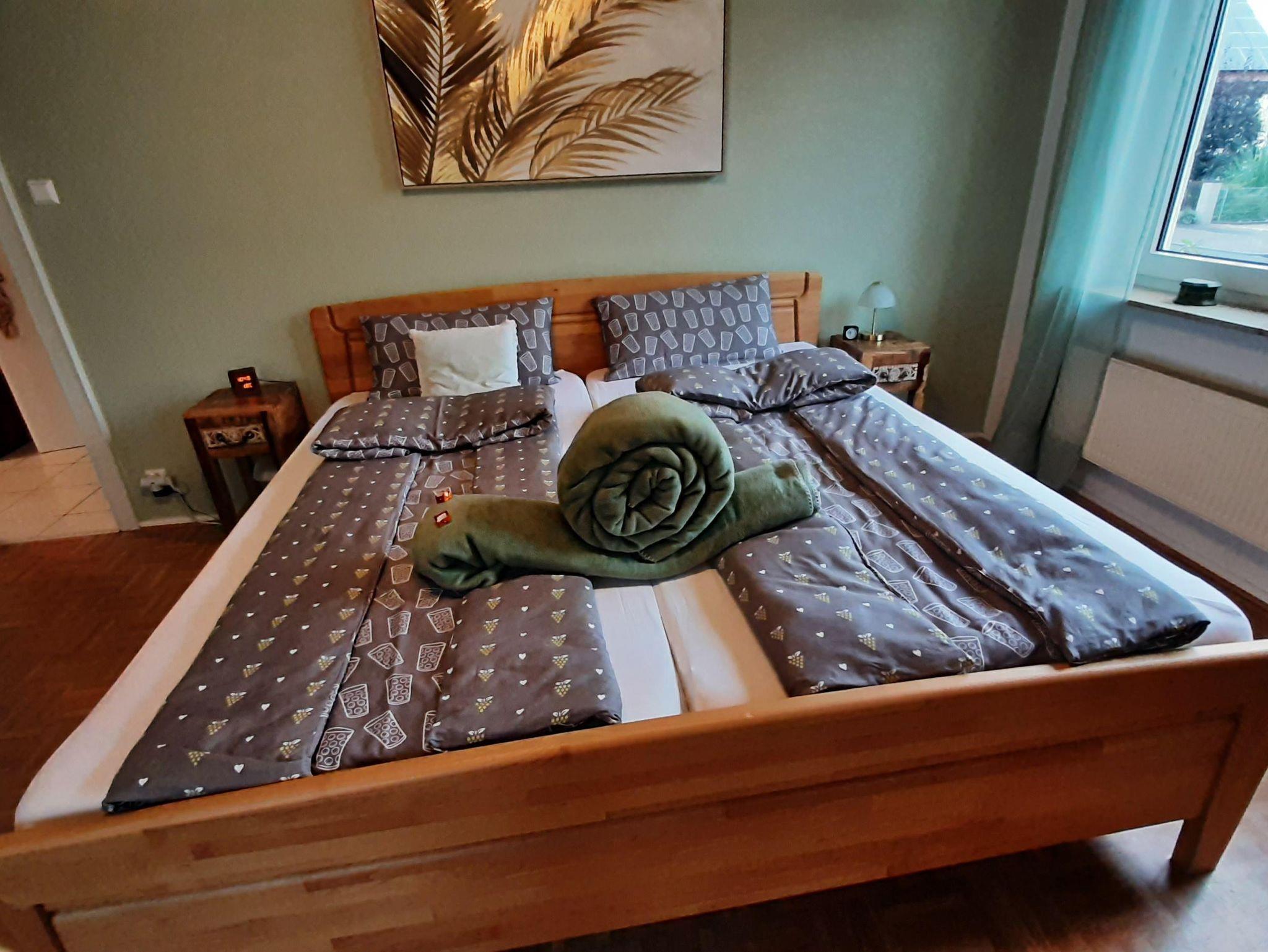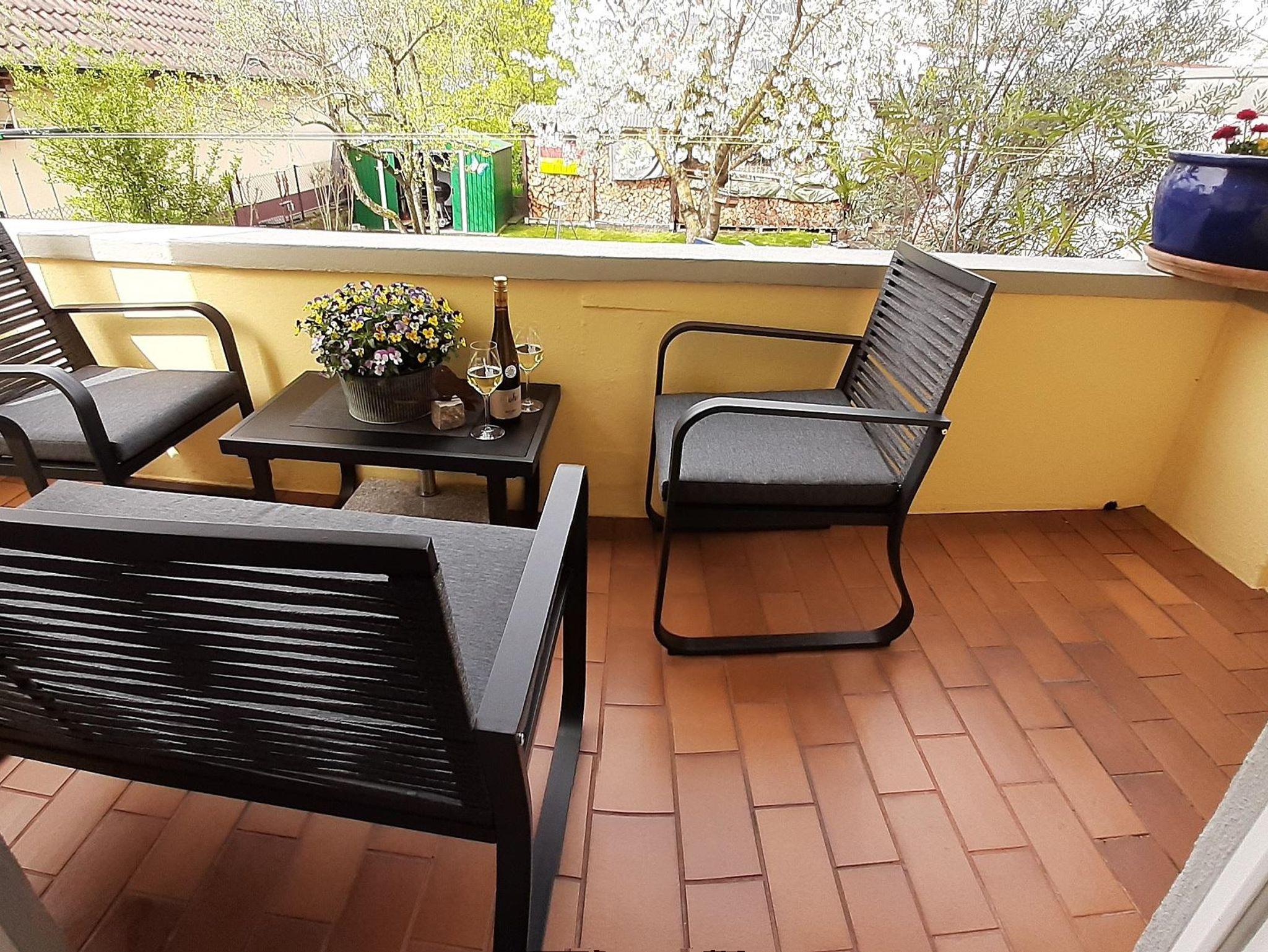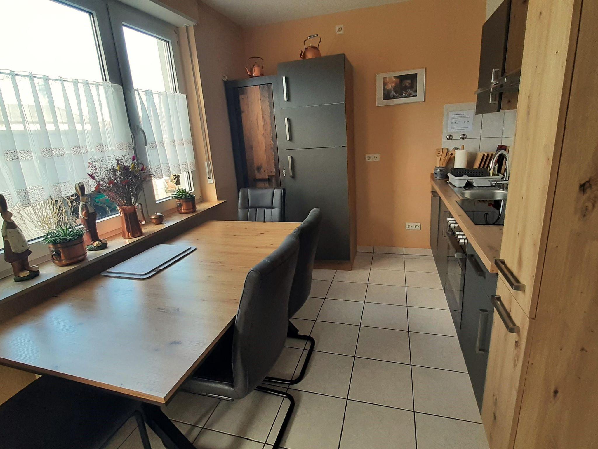 Die Wohnung bietet ihnen zwei schöne geräumige Schlafzimmer mit jeweils einem Doppelbett 2x2 Meter. Das Ambiente der gesamten Wohnung haben wir bewusst typisch pfälzisch ausgewählt, von der Bettwäsche bis zu den vielen Kleinigkeiten - sogar die Garderobe. Das Wohnzimmer verfügt über einen XXL-Fernseher mit Internet-Anschluss und eine Couch, auf der sie auch zu viert bequem Platz finden. Die Küche ist mit einer neuen Küchenzeile versehen inclusive Geschirrspüler, Kaffeemaschine, Toaster usw. Im Bad überrascht sie eine recht große Dusche. Auf dem der Straße abgewandeten Balkon können sie bei entsprechendem Wetter herrlich entspannen. Natürlich verfügt die Wohnung über kostenfreies WLAN.