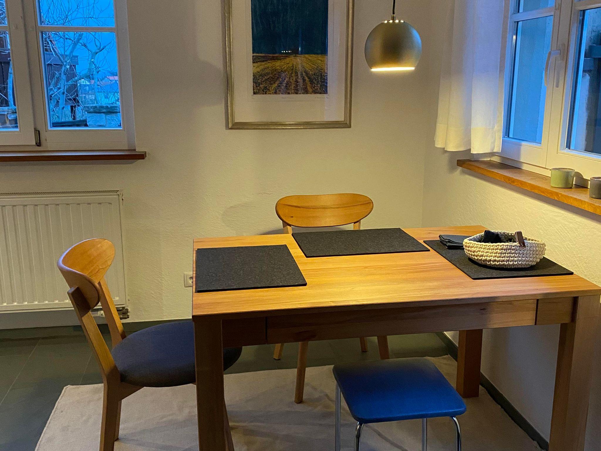 Unser ebenerdiges Ferienappartement verfügt über ein abgeteiltes, aber offenes Schlafzimmer, einen kleinen Wohnbereich und eine großzügige Wohnküche mit gemütlichem Essplatz. Sie Küche ist voll ausgestattet, jedoch ohne Geschirrspülmaschine.