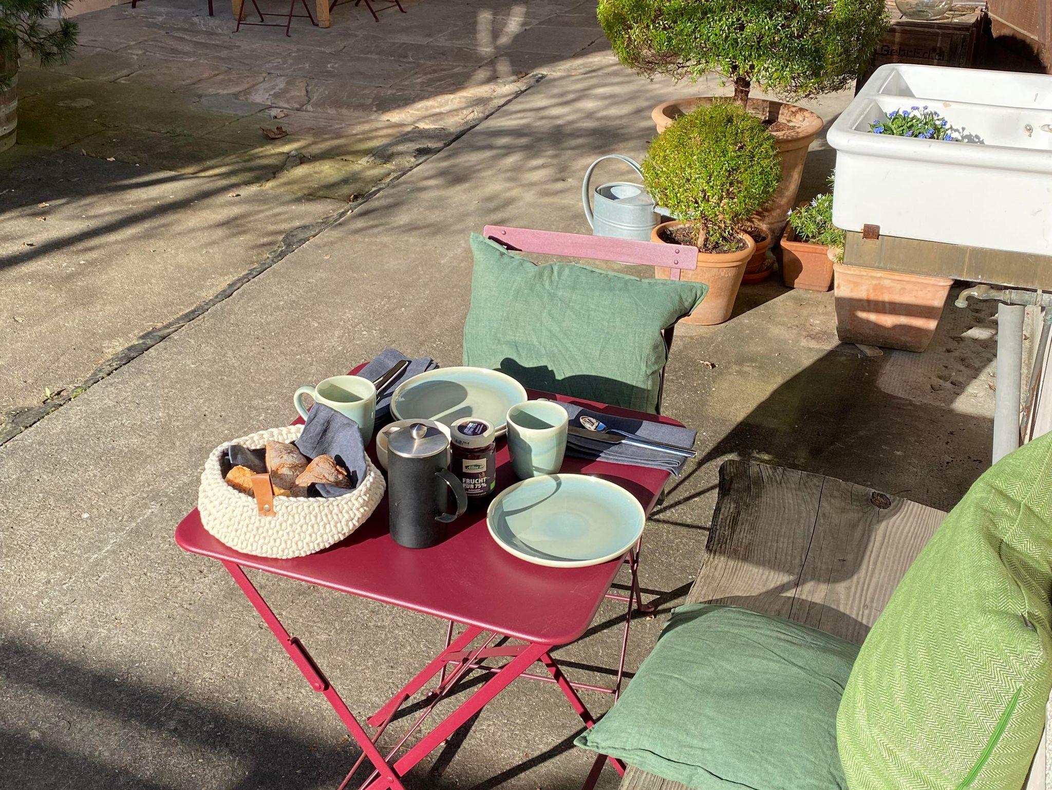 Bei schönem Wetter können Sie die Sitzplätze im Innenhof nutzen. Dort können Sie auch Ihre Räder überdacht abstellen.