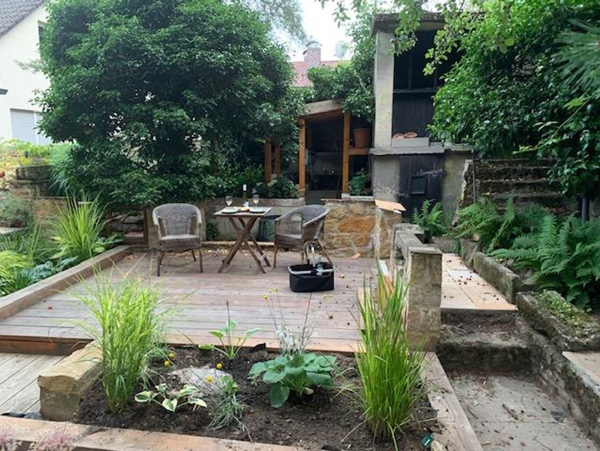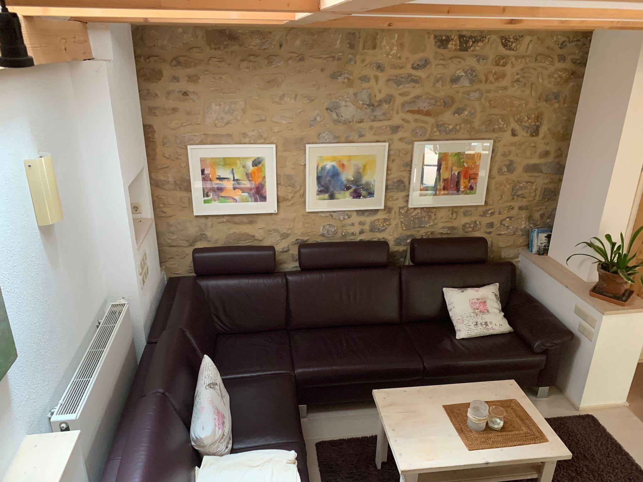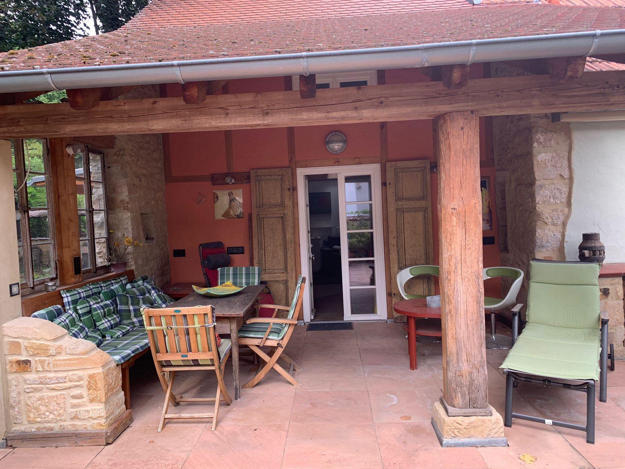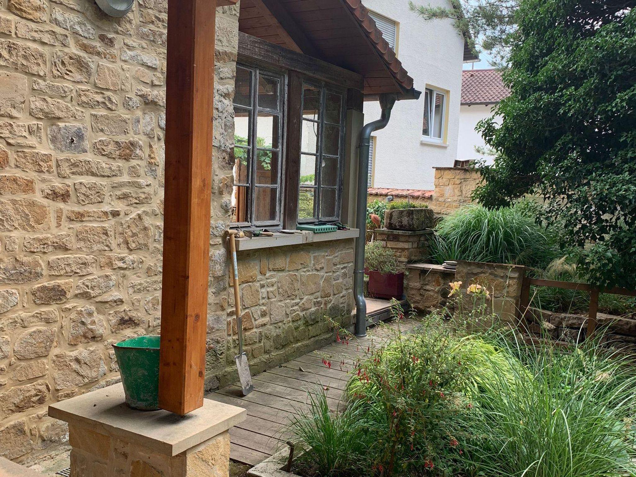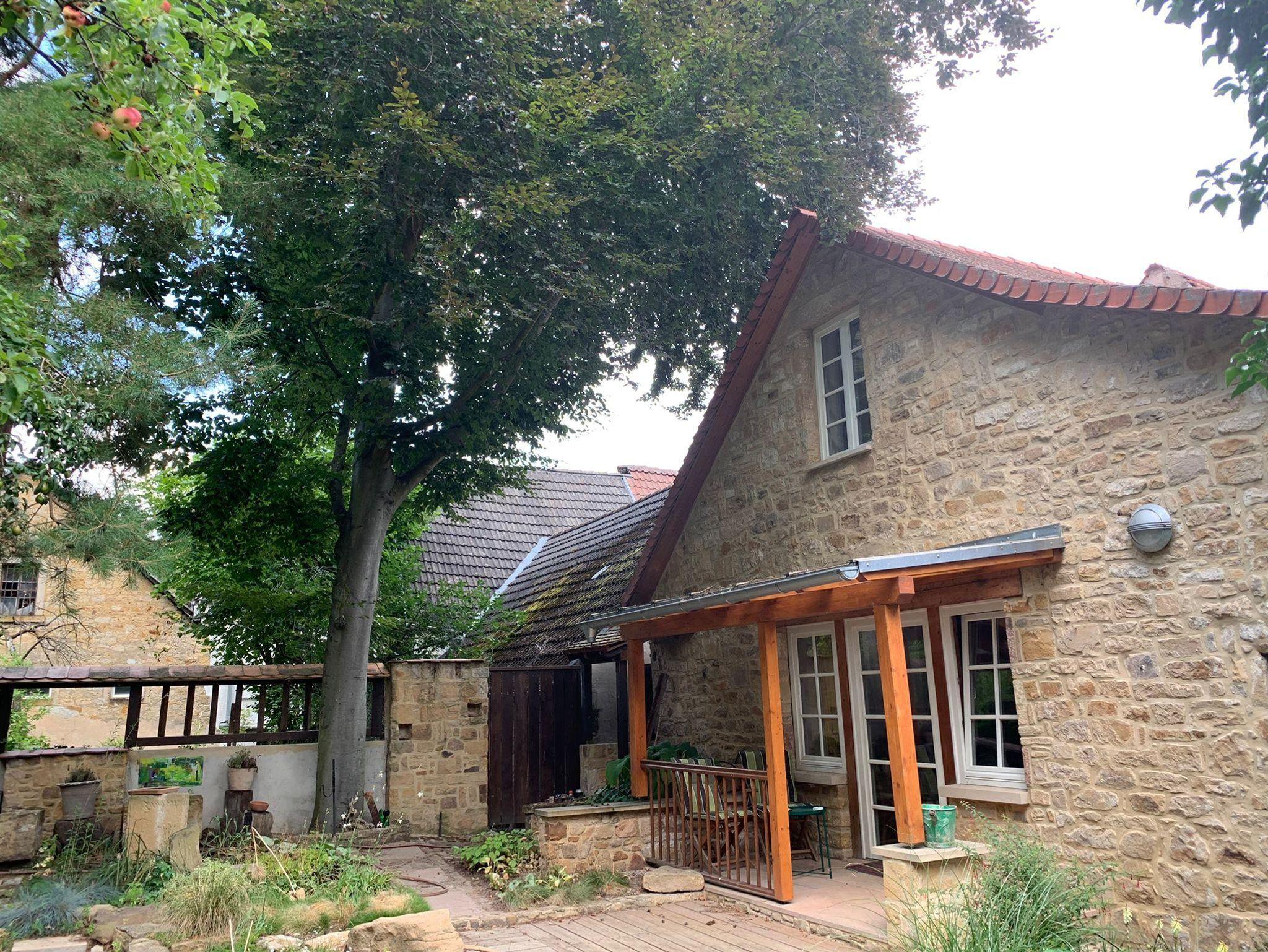 Willkommen in der Ferienwohnung Steinhauser im alten Winzerhaus. Begleiten Sie uns vom Hof (mit Parkmöglichkeit) nach oben auf die große, teilweise überdachte Terrasse, die einen tollen Blick auf den Übergang vom Garten zum Wald bietet. Genießen Sie hier einen entspannten Abend bei einem schönen Glas Pfälzer Wein. Von der Terrasse gelangen Sie in das großzügige Wohnzimmer, gestaltet in einer Kombination aus Alt und Neu, ein Konzept, das sich mehrfach wiederholt. Die großzügige Eckcouch lädt zum entspannten Beieinandersitzen oder auch zum Fernsehen ein. Vom Wohnzimmer mit Ausgang zu der zweiten, kleineren, überdachten Terrasse an der Westseite, mit Blick über den Garten in den sich daran anschließenden Wald, gelangen Sie über die geschwungene Treppe in das Schlafzimmer mit Doppelbett (auch getrennt stellbar, offene Fussteile) im Obergeschoss. Hier haben Sie aus 2 Fenstern einen schönen Ausblick auf den Pfälzerwald. Wieder zurück im Wohnzimmer, geht es weiter in die Wohnküche. Hier finden Sie neben der üblichen Küchenzeile einen Esstisch für 4 Personen und eine bequeme Couch zum gemütlichen Fernsehen. Dann geht es weiter in das Tageslichtbad mit Badewanne, Waschbecken und WC. Daneben befindet sich das 2. Schlafzimmer mit 2 Betten (auch hier offene Fussteile) und großem Einbauschrank. Bei einem kleinen Rundgang können Sie vom auf verschiedenen Ebenen angelegten Garten weite Ausblicke über die schöne Pfalz genießen.
