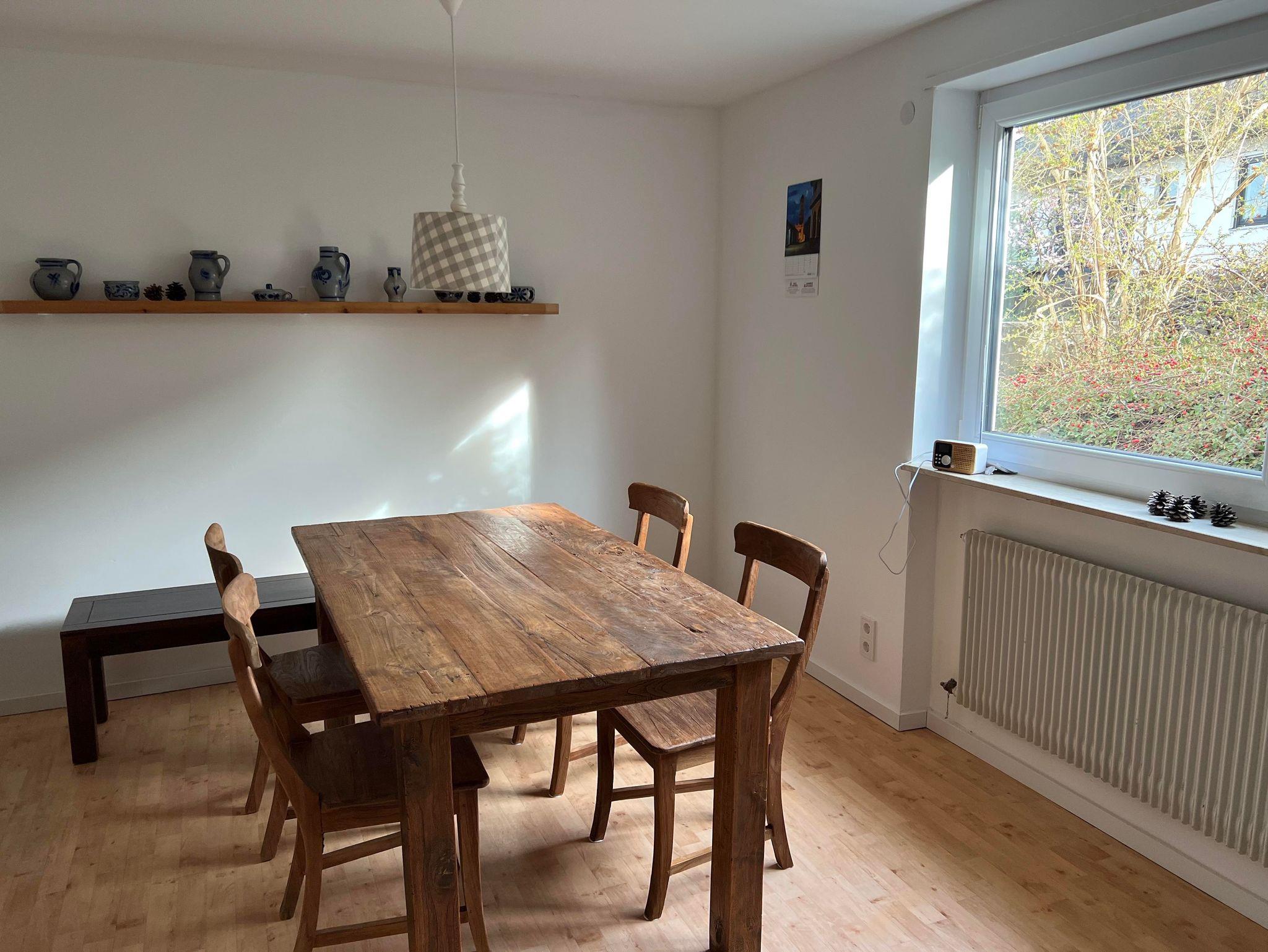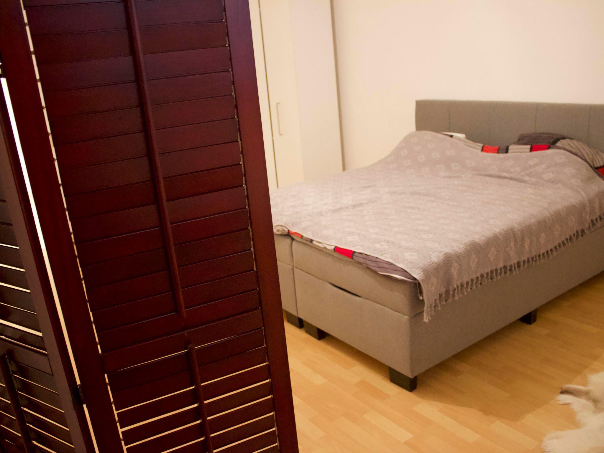 Die bestehenden 3 Zimmer gliedern sich auf in Wohnzimmer, Bad (innenliegend mit Dusche und Badewanne), Küche (mit Esstisch, Einbauküche, Mikrowelle, Nespresso-Maschine, Kühlschrank), Schlafzimmer und Flur. Es gibt ein Doppel-Boxspringbett, einen Schrank und eine klappbare Schlafcouch, die von einer weiteren Person genutzt werden kann.