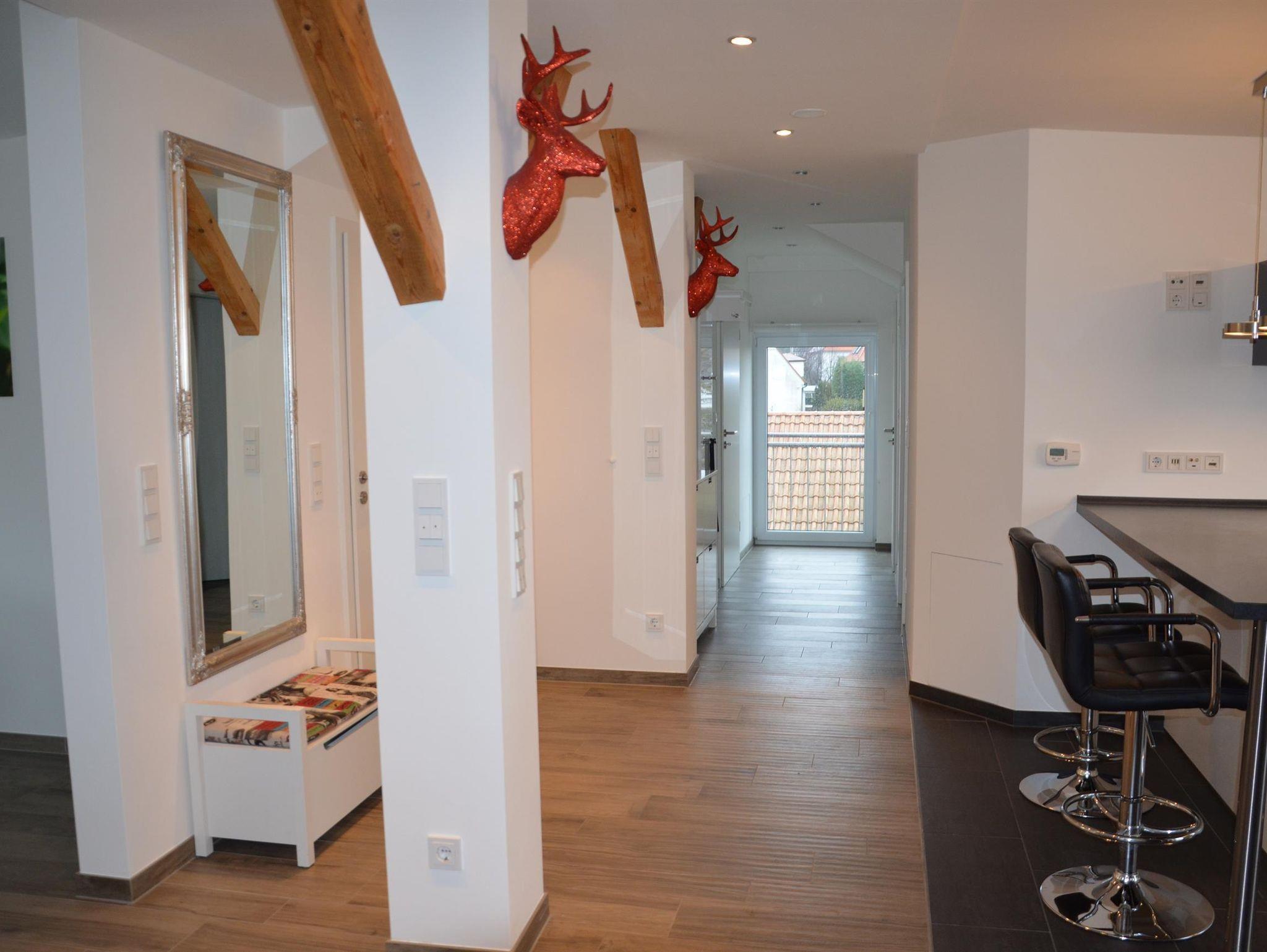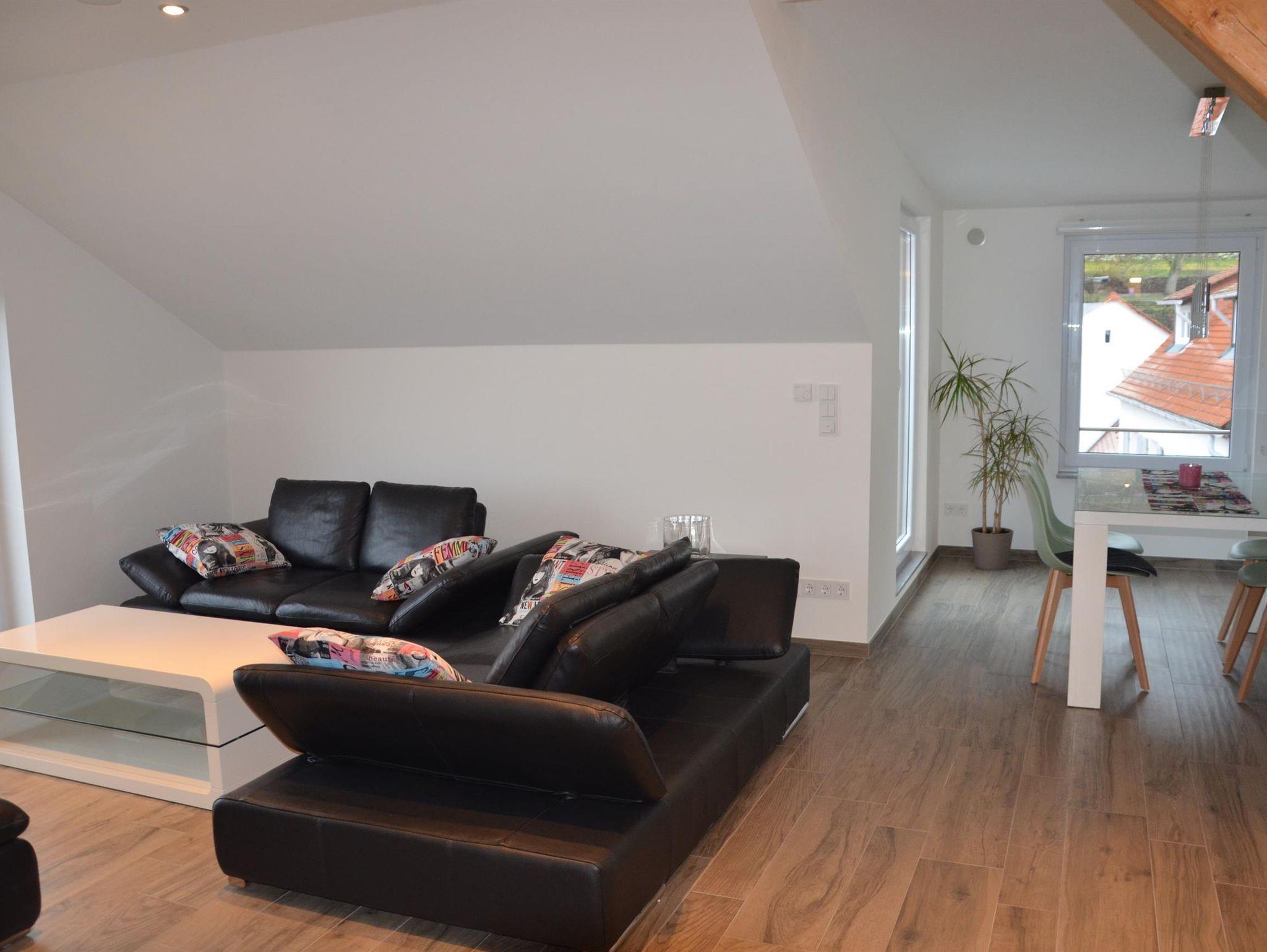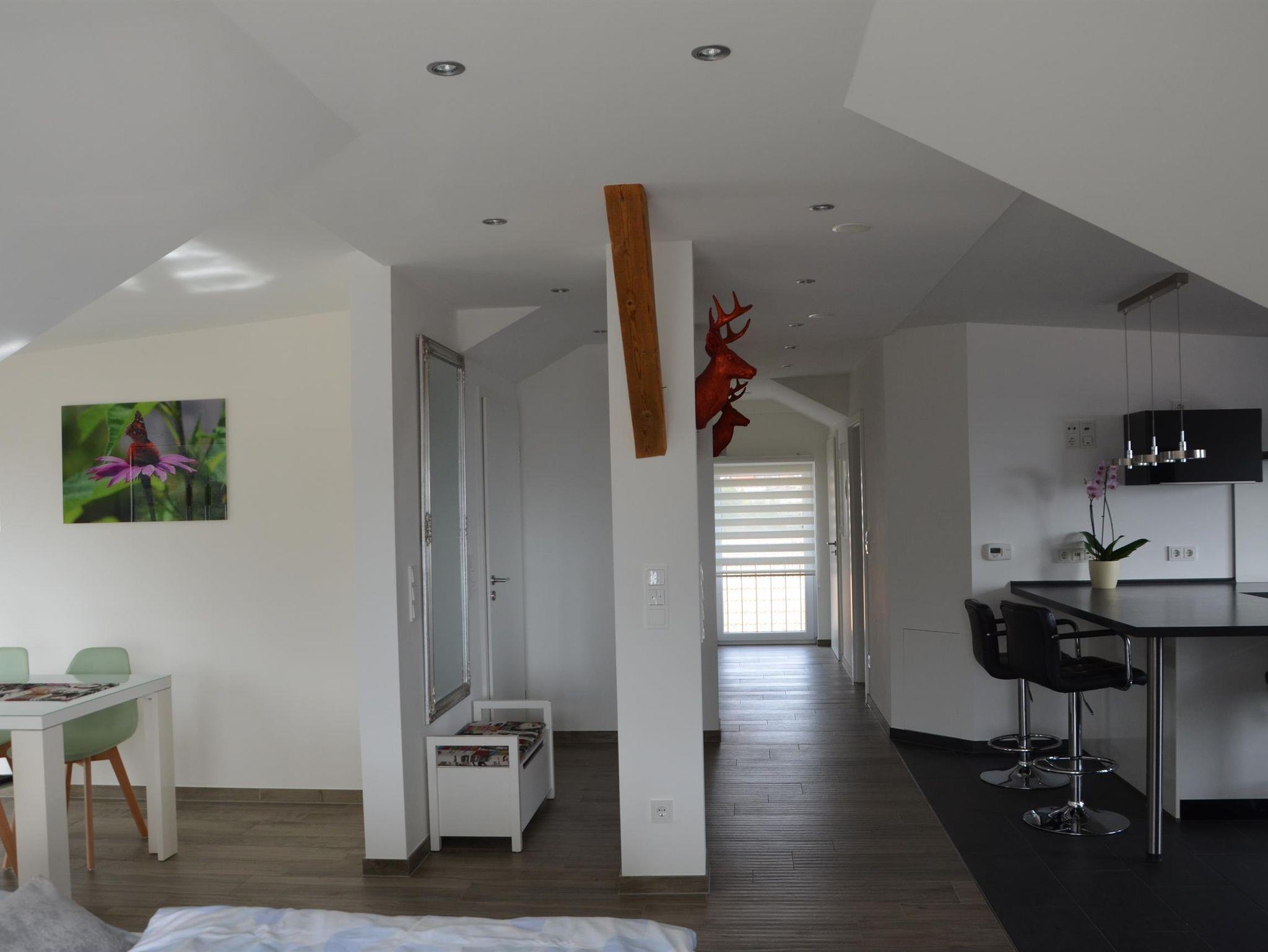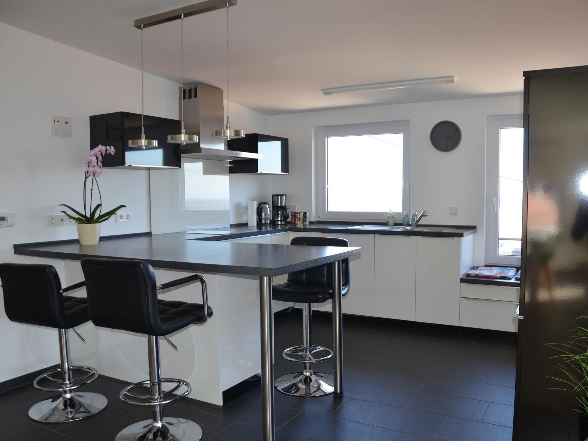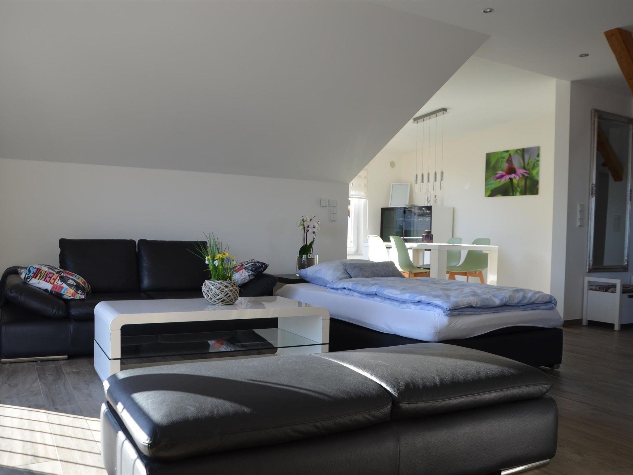 Die modern eingerichtete 78m² große Ferienwohnung bietet Platz für 1-3 Personen. Der offen gestaltete Wohn-, Ess- und Küchenbereich mit komplett ausgestatteter Einbauküche (Geschirrspülmaschine, Kühl-/Gefrierkombination, Backofen, Cerankochfeld, Kaffeemaschinen etc.) und einer gemütlichen Sitzecke mit Sofa und einem Schlafsofa lädt Sie zum Entspannen ein.