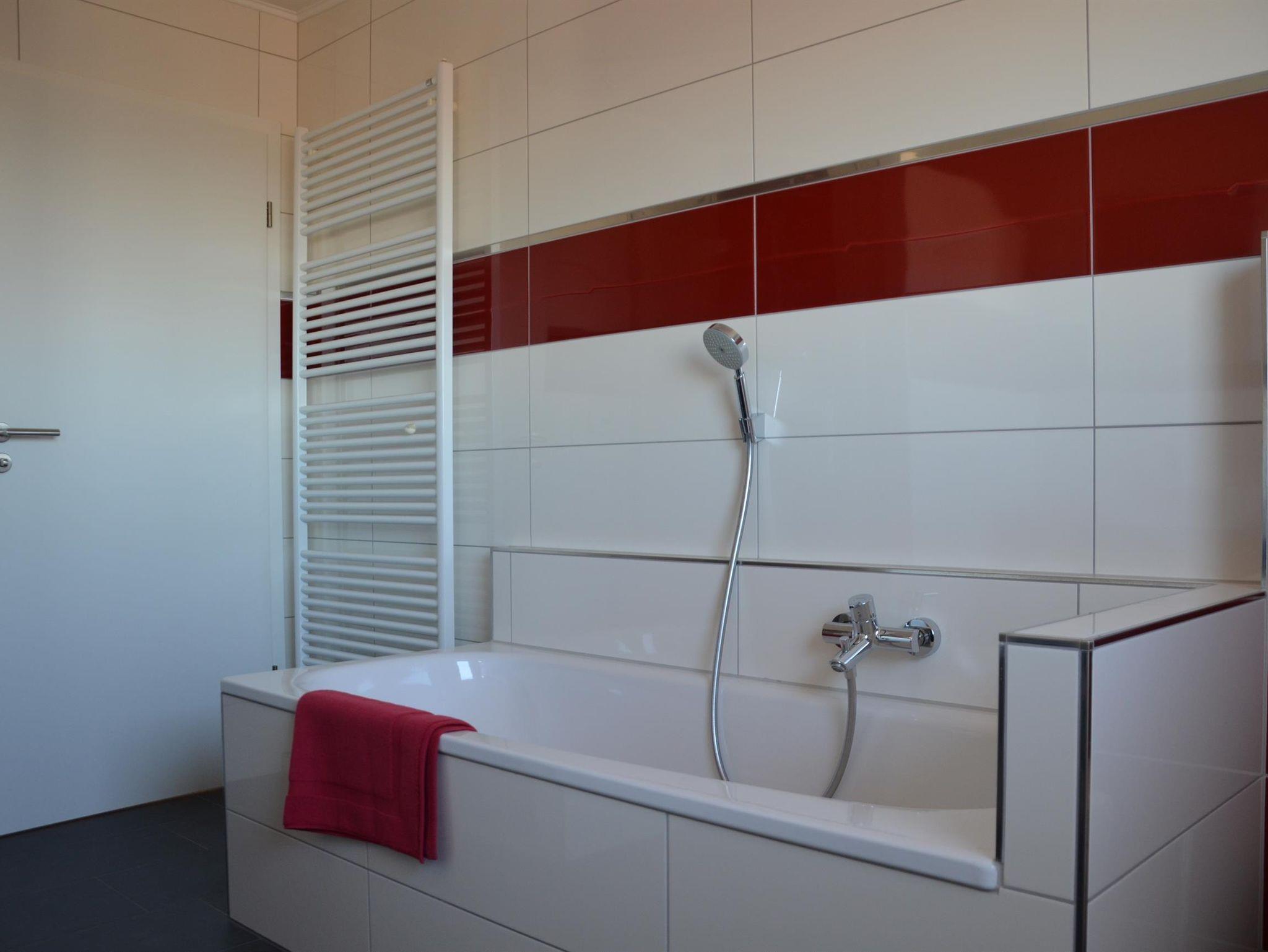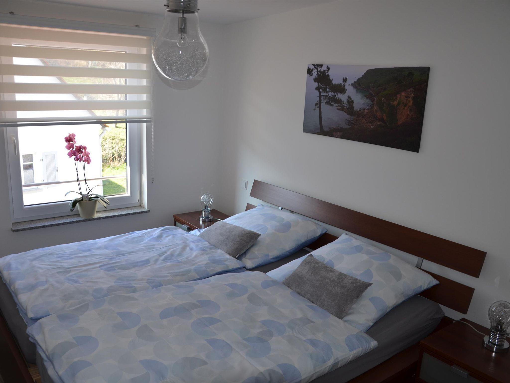 Ein Schlafzimmer mit Doppelbett, ein ein Badezimmer mit großer Dusche, Badewanne, WC, zwei Waschbecken und eine Loggia mit Tisch und Stühlen/Liegestühlen komplementieren die Ferienwohnung. Fußbodenheizung, Kabel-TV und kostenloser Internetanschluss (LAN-Netzwerk/Wlan in allen Räumen) runden den Komfort ab.