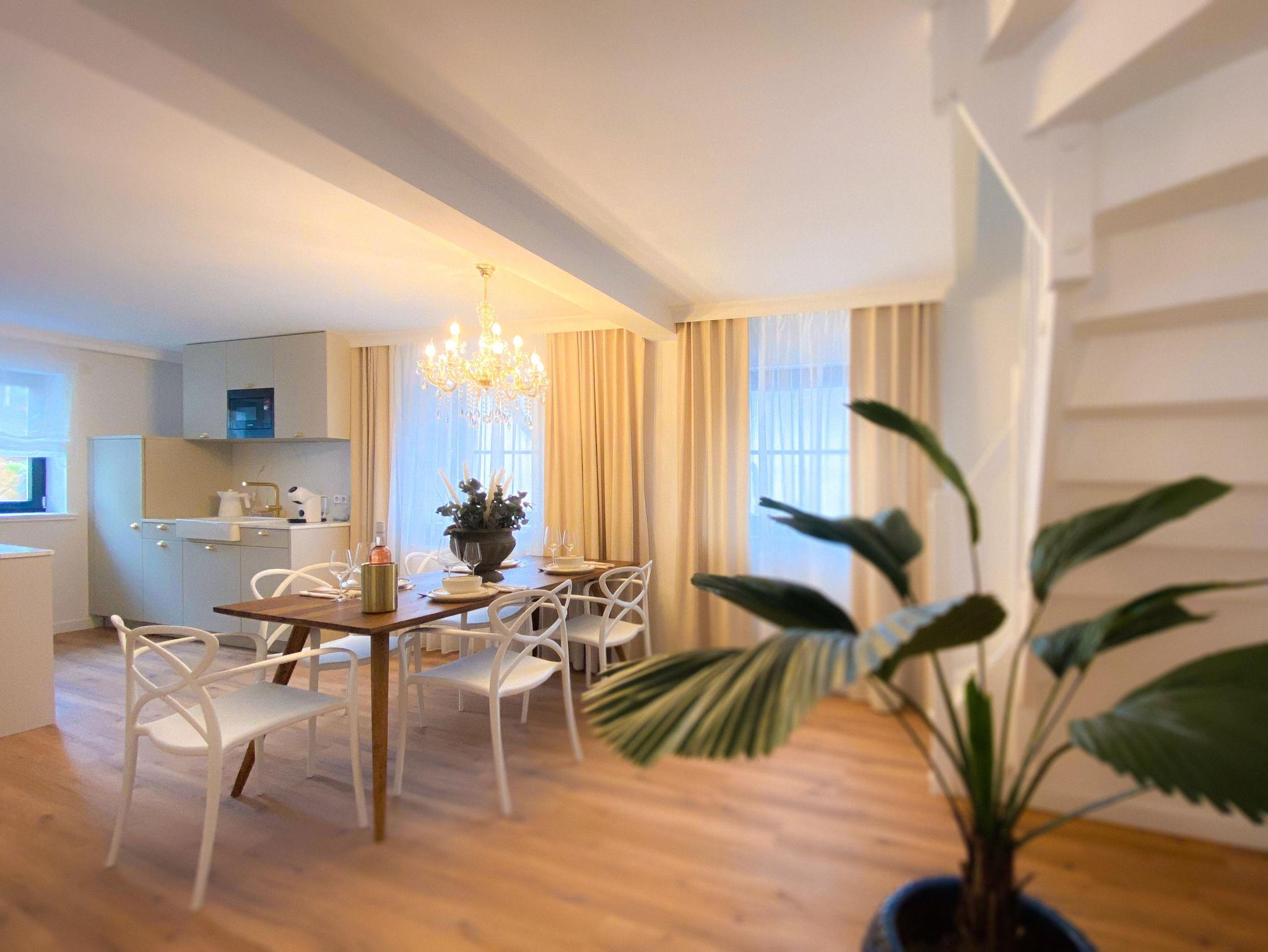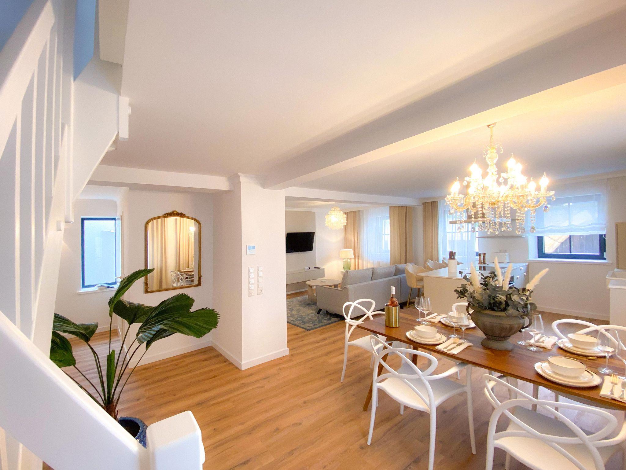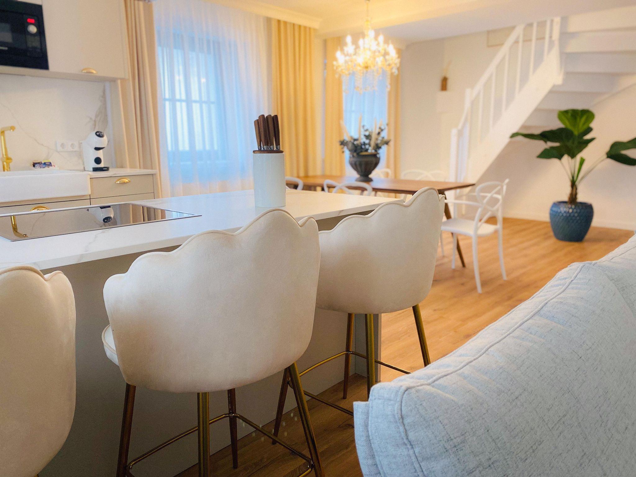 Mediterraner Wohn(t)raum auf zwei Etagen In unserer Maisonette-Wohnung dürfen Sie sich auf 2 Etagen wohlfühlen. Der Wohn-/ Essbereich befindet sich in der ersten Etage der Wohnung: Erleben Sie gemütliche Abende zu dritt oder mit Freunden nach einer herrlichen Weintour durch die Pfälzer Weinberge und lassen Sie den Tag bei einem vollmundigen Wein vor dem großen TV, klassisch am Esstisch oder locker an der Kochinsel ausklingen und planen Sie entspannt den nächsten aufregenden Tag. Eine Flasche Wein vom Weingut Schäfer steht für Sie übrigens als Gruß unseres Hauses gekühlt bei Bezug bereit.