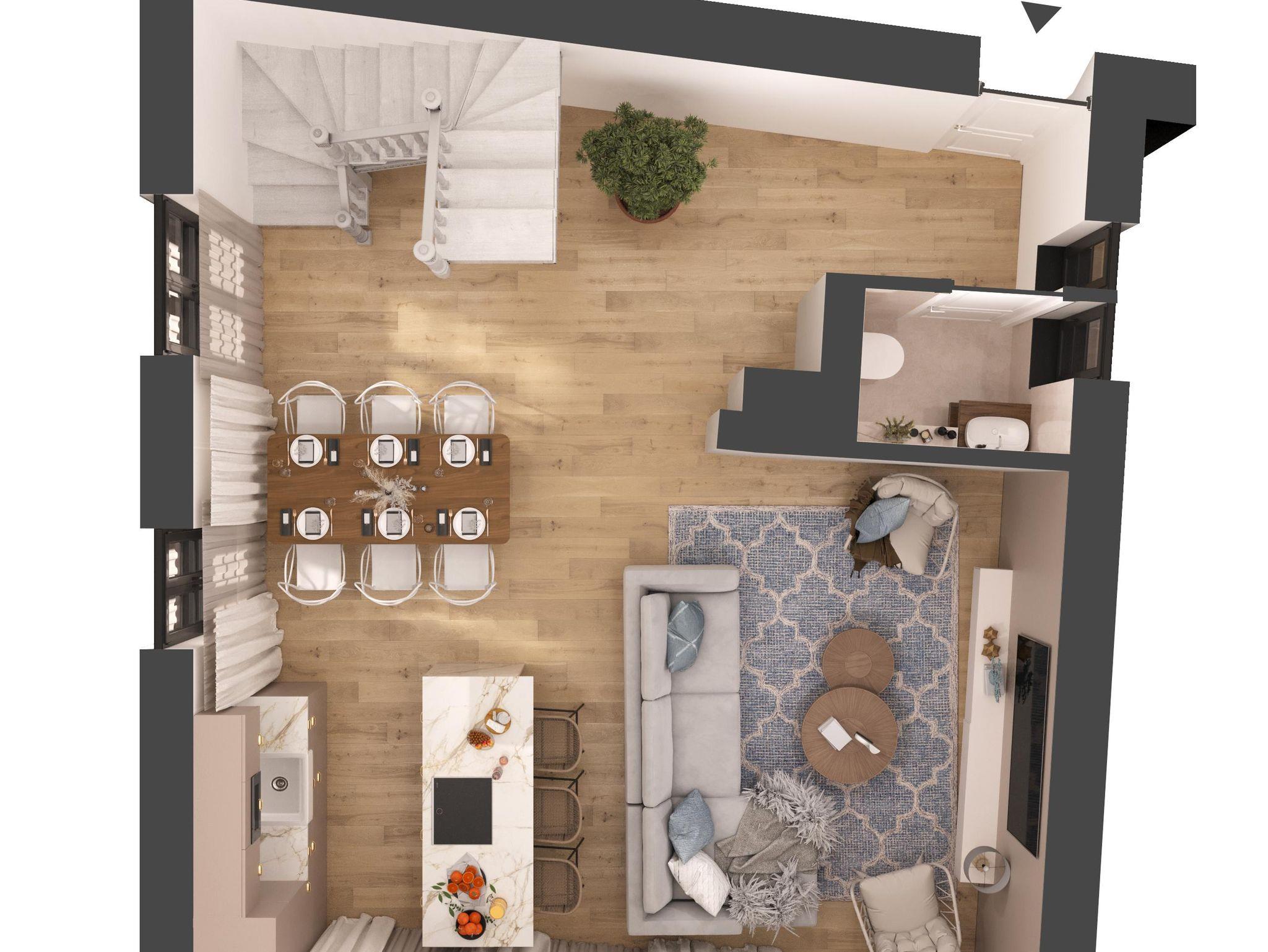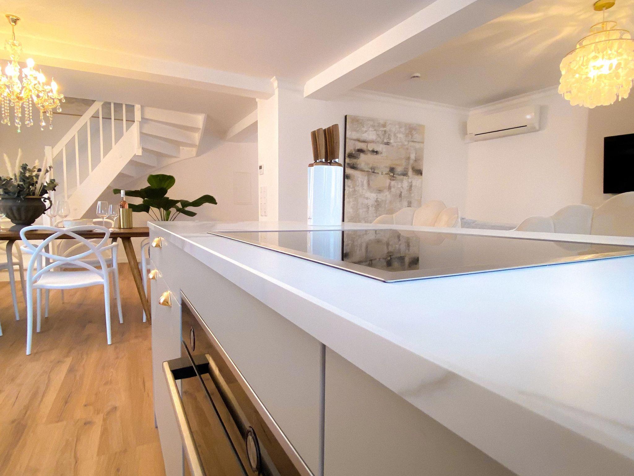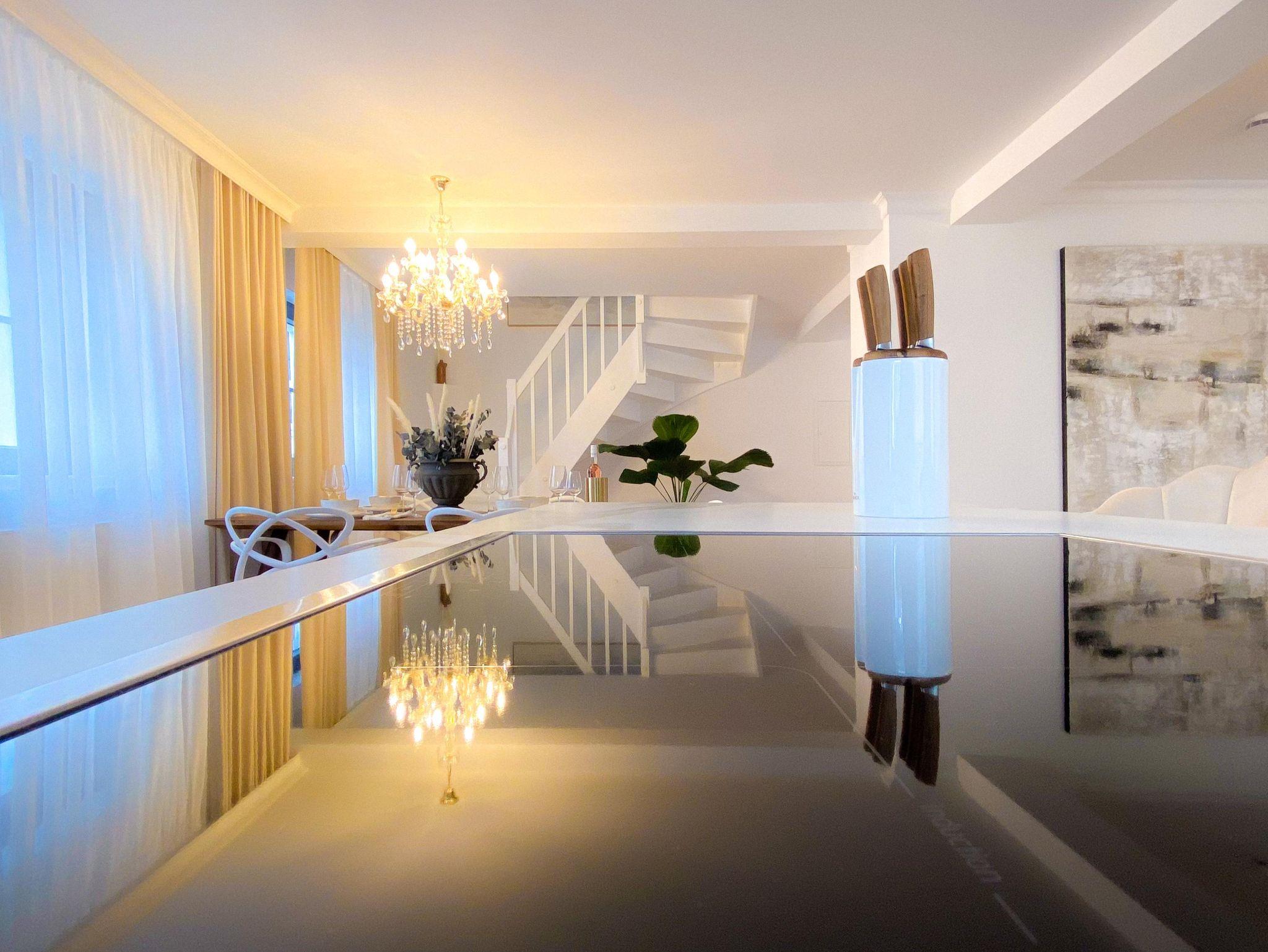 Mediterraner Wohn(t)raum auf zwei Etagen In unserer Maisonette-Wohnung dürfen Sie sich auf 2 Etagen wohlfühlen. Der Wohn-/ Essbereich befindet sich in der ersten Etage der Wohnung: Erleben Sie gemütliche Abende zu dritt oder mit Freunden nach einer herrlichen Weintour durch die Pfälzer Weinberge und lassen Sie den Tag bei einem vollmundigen Wein vor dem großen TV, klassisch am Esstisch oder locker an der Kochinsel ausklingen und planen Sie entspannt den nächsten aufregenden Tag. Eine Flasche Wein vom Weingut Schäfer steht für Sie übrigens als Gruß unseres Hauses gekühlt bei Bezug bereit.