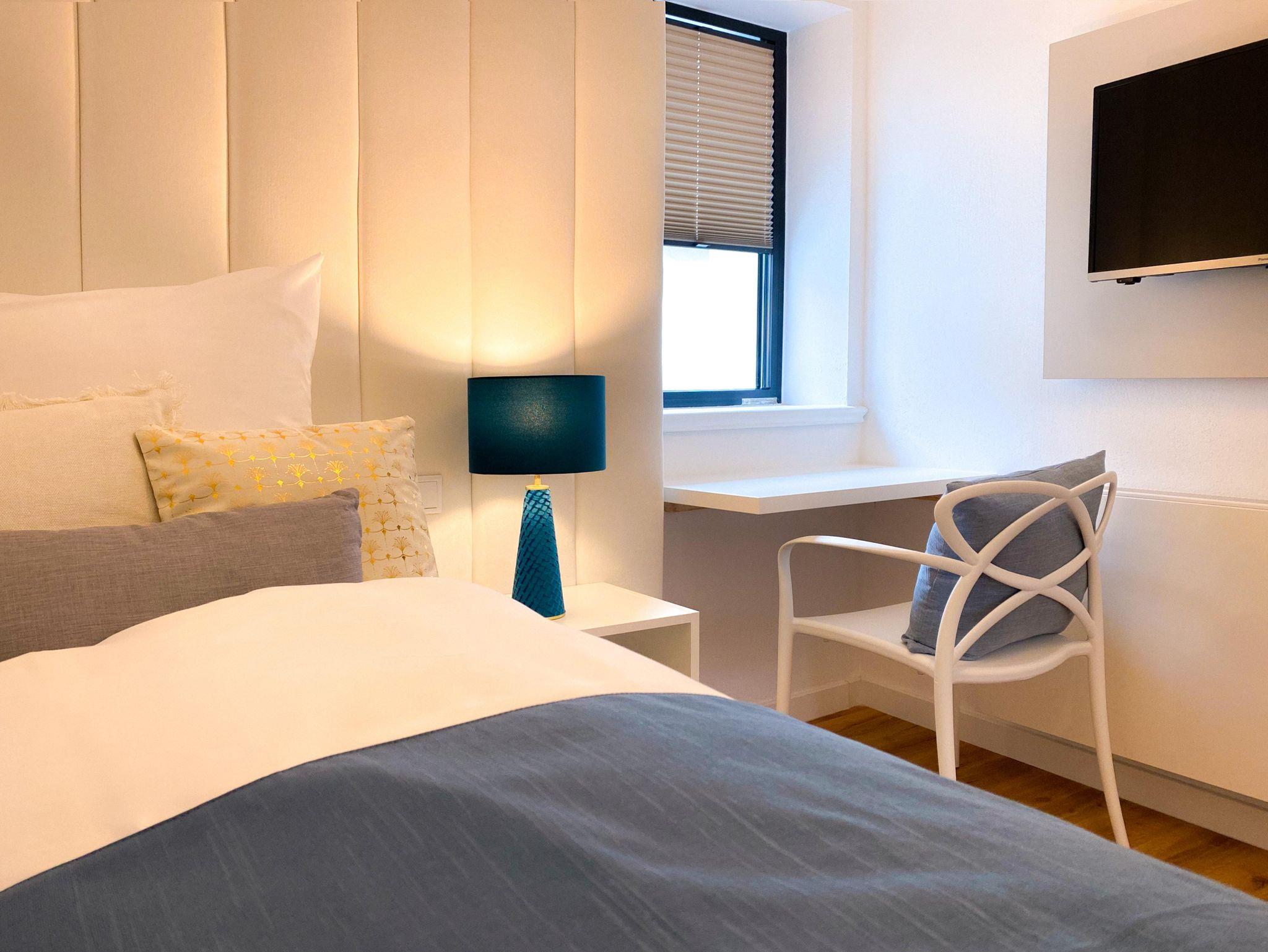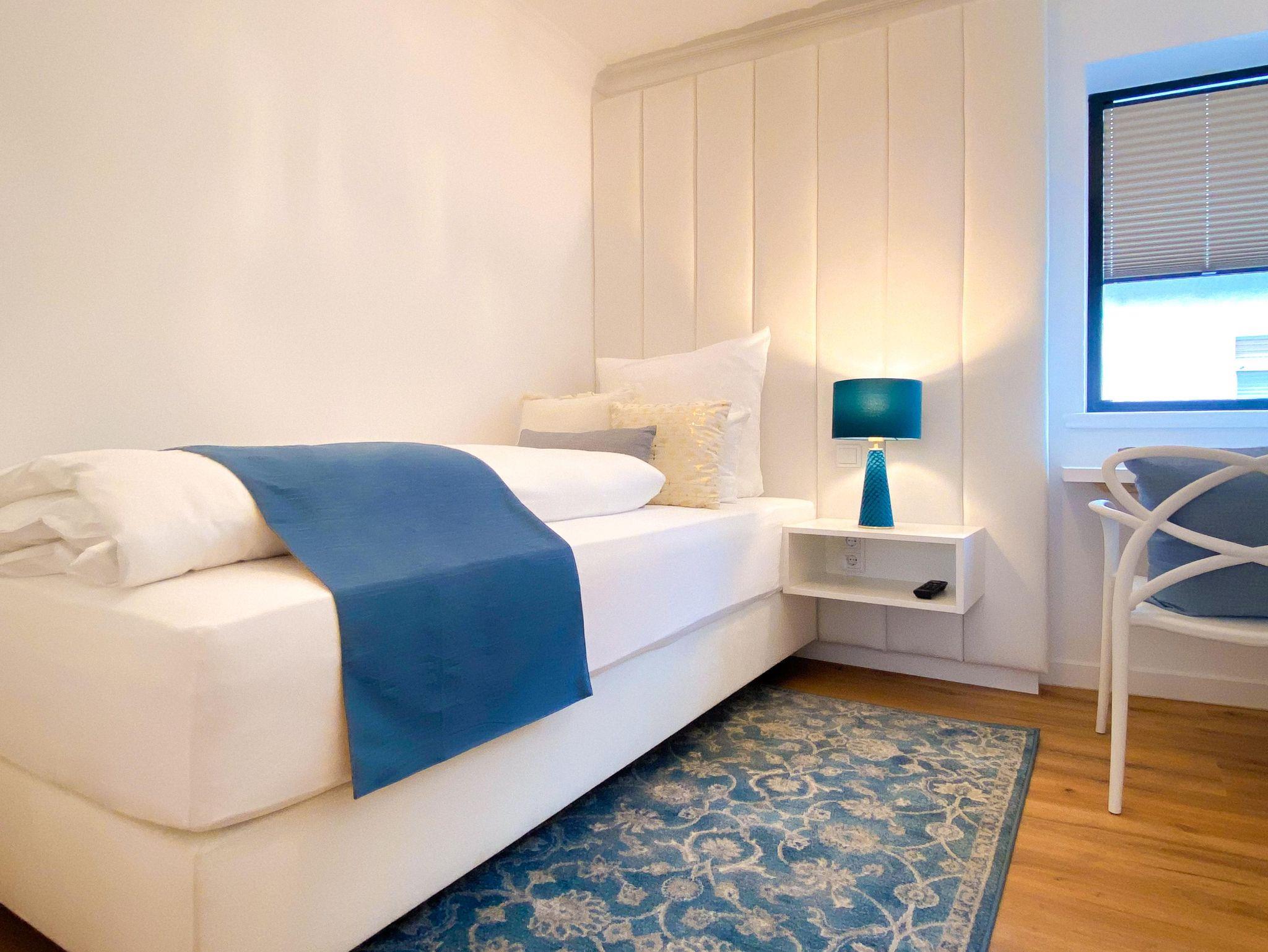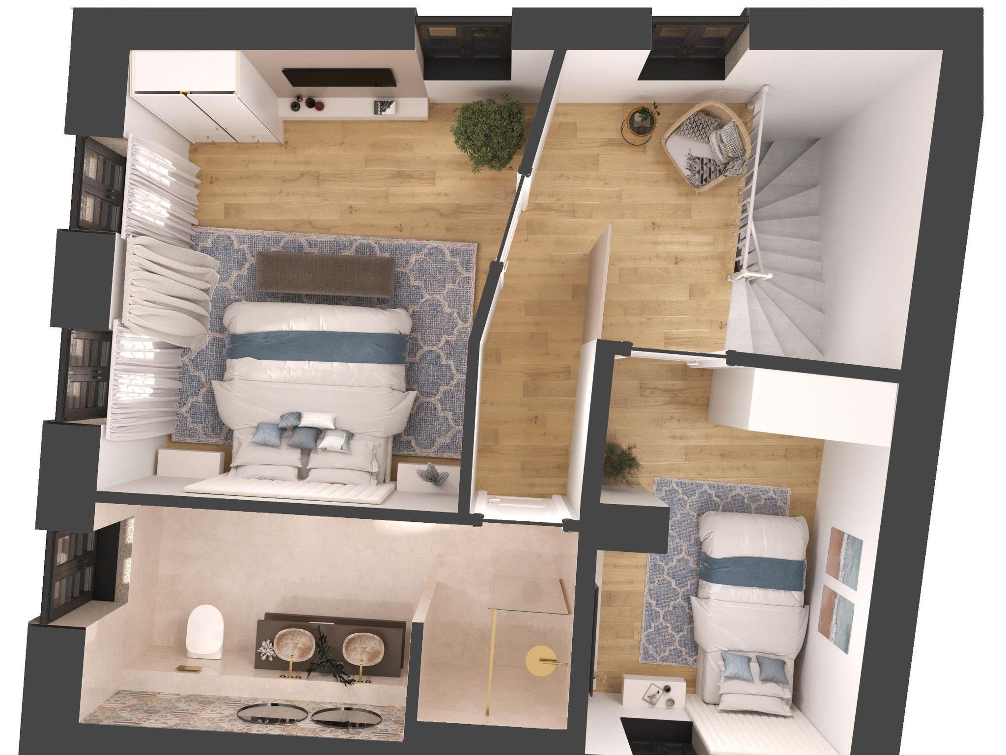 Die Treppe führt zu den Schlafbereichen und dem großen Badezimmer (ein zweites WC finden Sie in der ersten Etage). Auch hier findet sich in jedem Schlafzimmer ein hochwertiges Boxspringbett (1 Doppelbett, 1 Einzelbett) und TV-Screens.