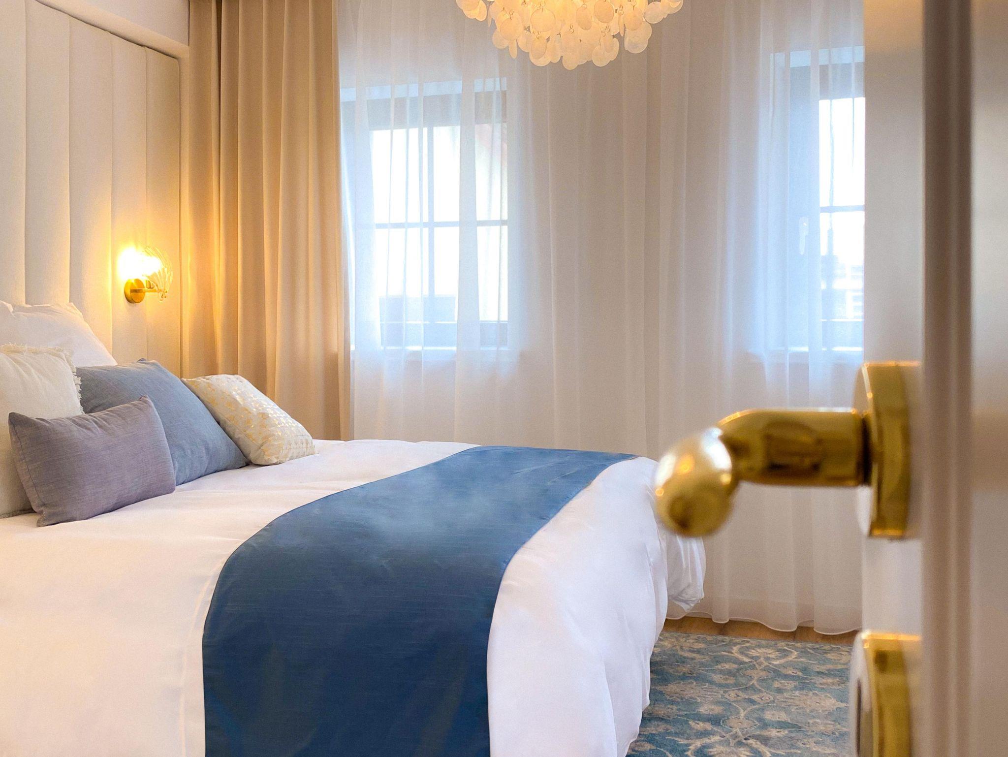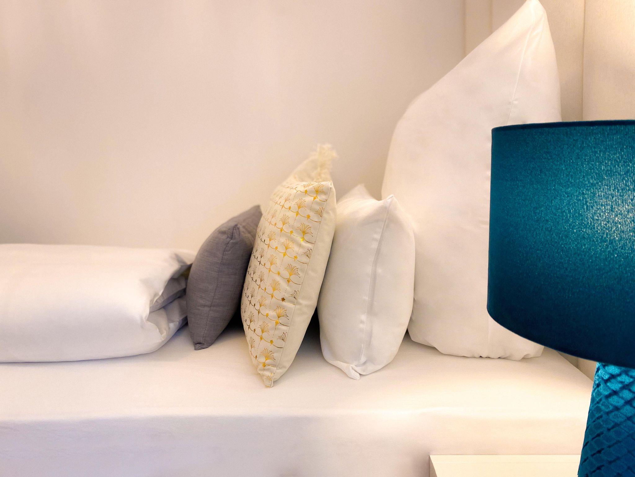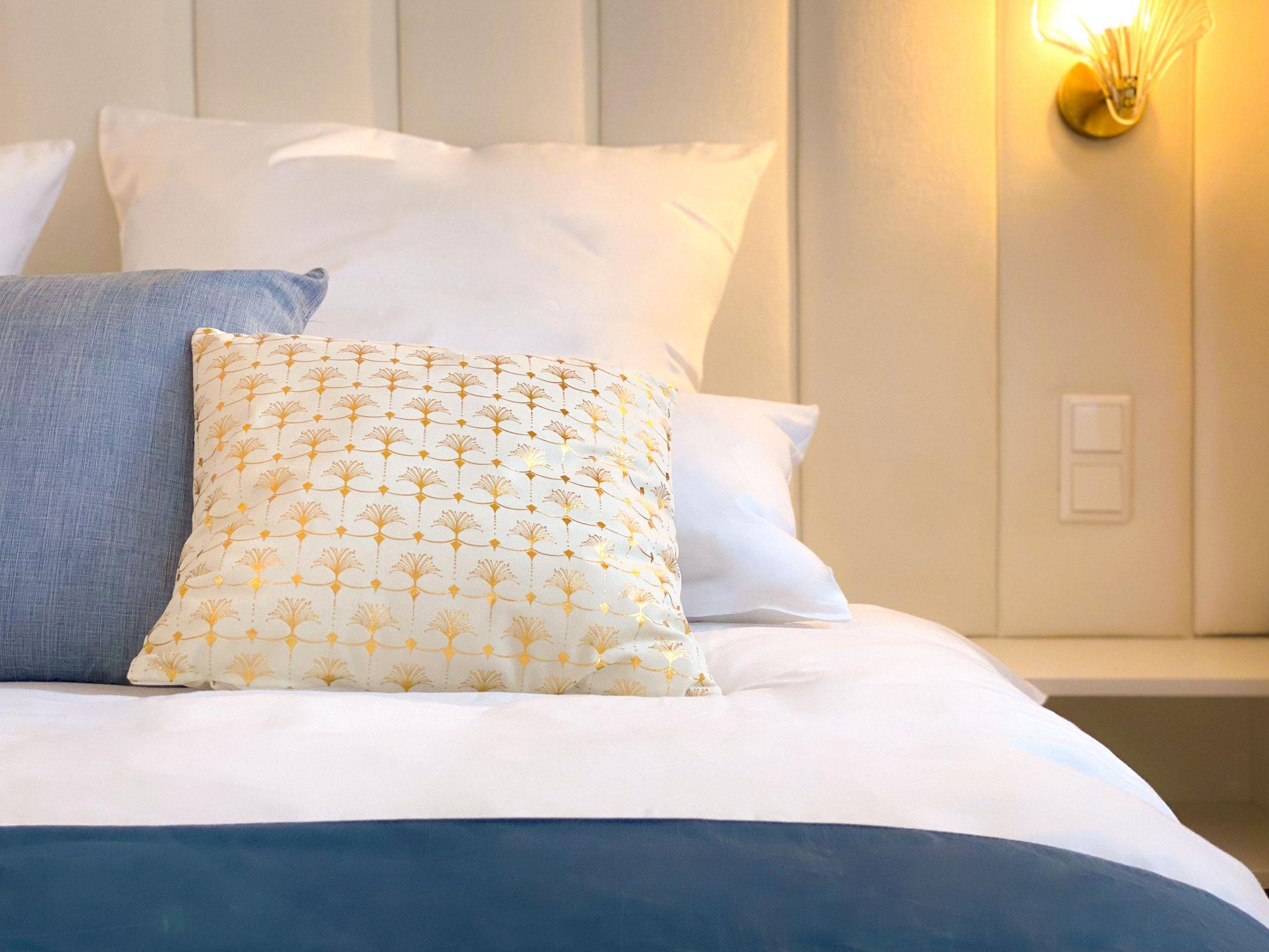 Die Treppe führt zu den Schlafbereichen und dem großen Badezimmer (ein zweites WC finden Sie in der ersten Etage). Auch hier findet sich in jedem Schlafzimmer ein hochwertiges Boxspringbett (1 Doppelbett, 1 Einzelbett) und TV-Screens.