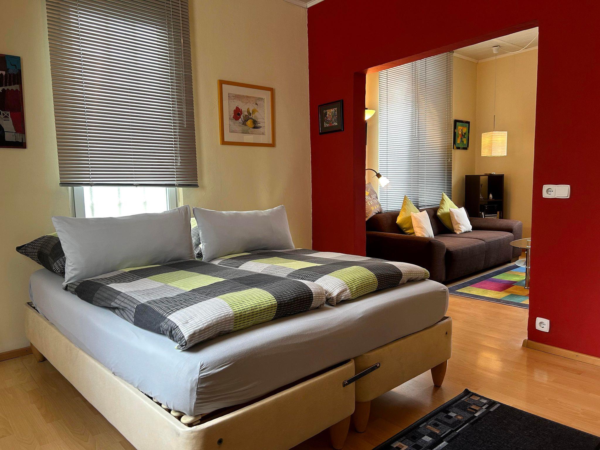 einer zentral gelegenen charmanten Nichtraucher Wohnung mit kombinierten Wohn-Schlafbereich, ohne Straßenlärm da im Hinterhaus eines historischen Gebäudekomplexes liegend und über die originale, restaurierte Treppe im 2.OG erreichbar Kein Aufzug! Eigener Eingang