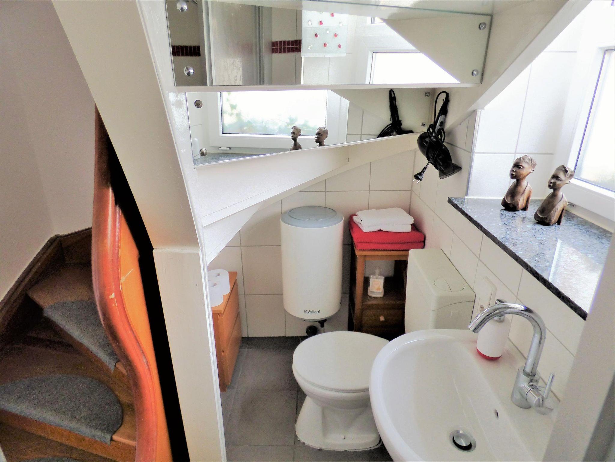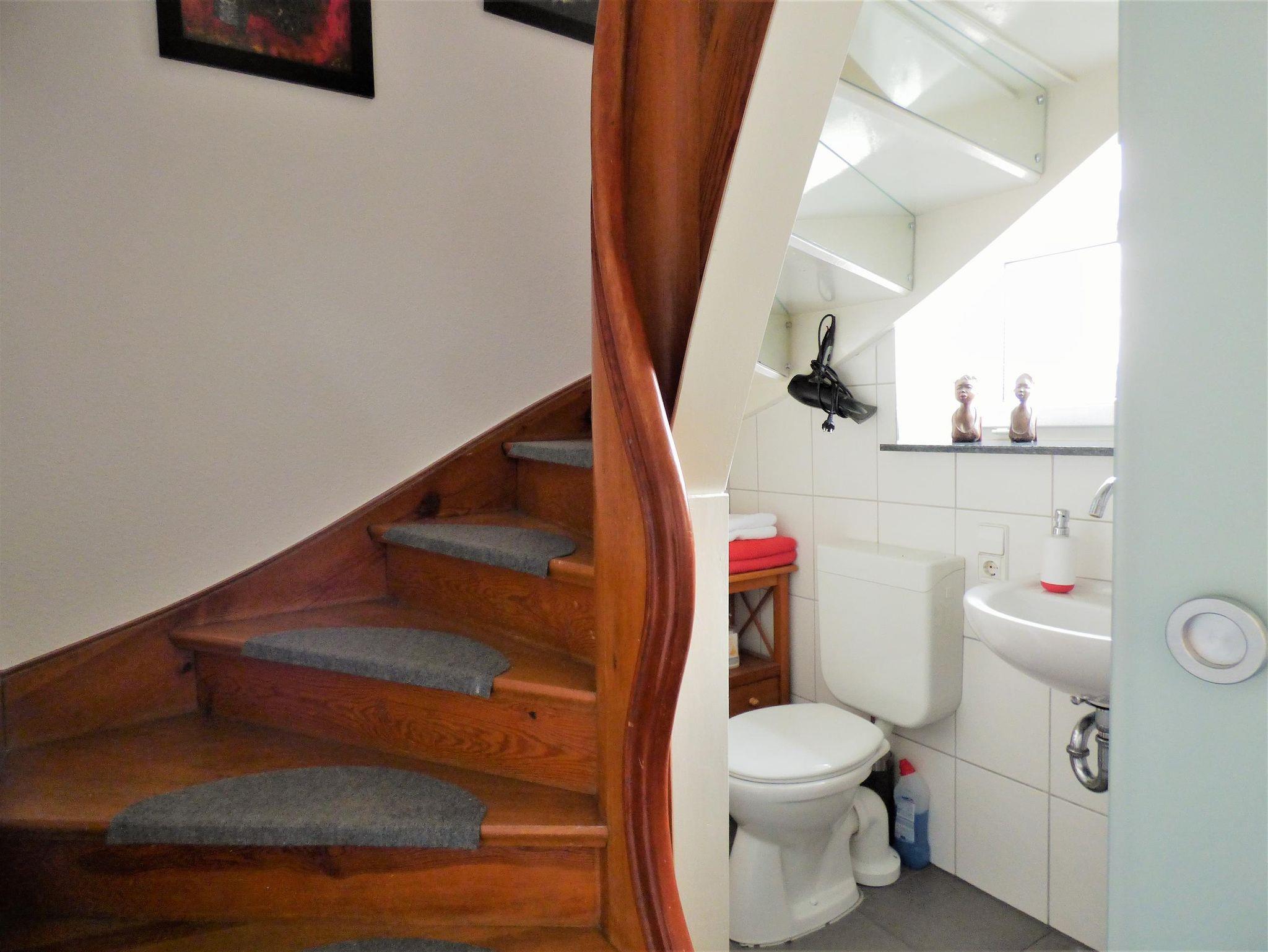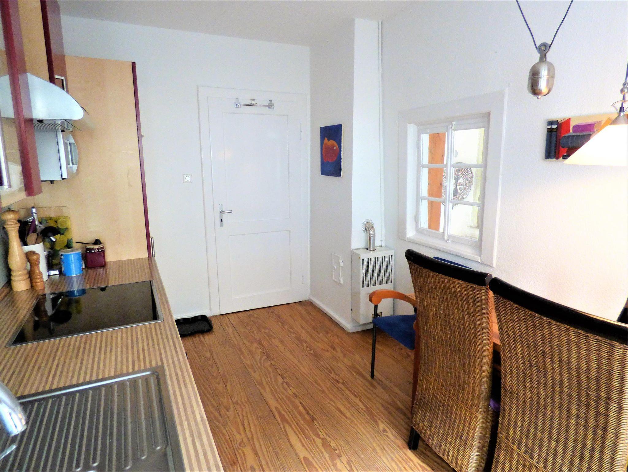 Die Ferienwohnung Goldberg erstreckt sich über zwei Stockwerke. Im Untergeschoss befindet sich eine kleine gemütliche und großzügig ausgestattete Wohnküche mit Blick auf das Leben in der Dorfstrasse. Ebenso im Grundgeschoss, unter dem Treppenaufgang, befindet sich das Bad. Dementsprechend ist es sehr klein und ganz sicher ein Raumwunder - mit moderer Ausstattung! Über eine geschwungene Holztreppe gelangt man in das Obergeschoss. Hier liegt das ruhige Schlafzimmer mit Ausgang zu einem kleinen Balkon mit Blick auf den Hof. Durch eine Schiebetür betritt man ein geschmackvoll eingerichtetes Wohnzimmer mit CD-Sammlung. In allen Zimmern liegen teils die alten, teils neue Holzdielen. Auf Wunsch steht in dieser Wohnung ein extra Raum zur Nutzung zur Verfügung.