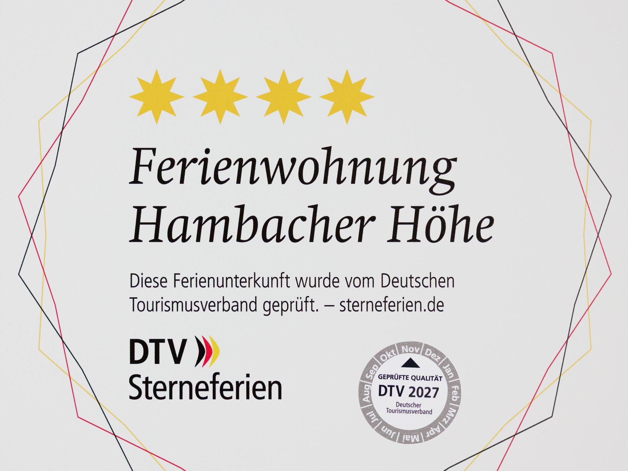 Erdgeschosswohnung, Abstellmöglichkeit für PKW und Fahrräder vorhanden; Pfalzcard, TV und WLAN. Die Ferienwohnung Hambacher Höhe ist nach den Qualitätskriterien der DTV-Klassifizierung mit 4 Sternen ausgezeichnet und bietet eine höherwertigere Gesamtausstattung mit gehobenem Komfort.