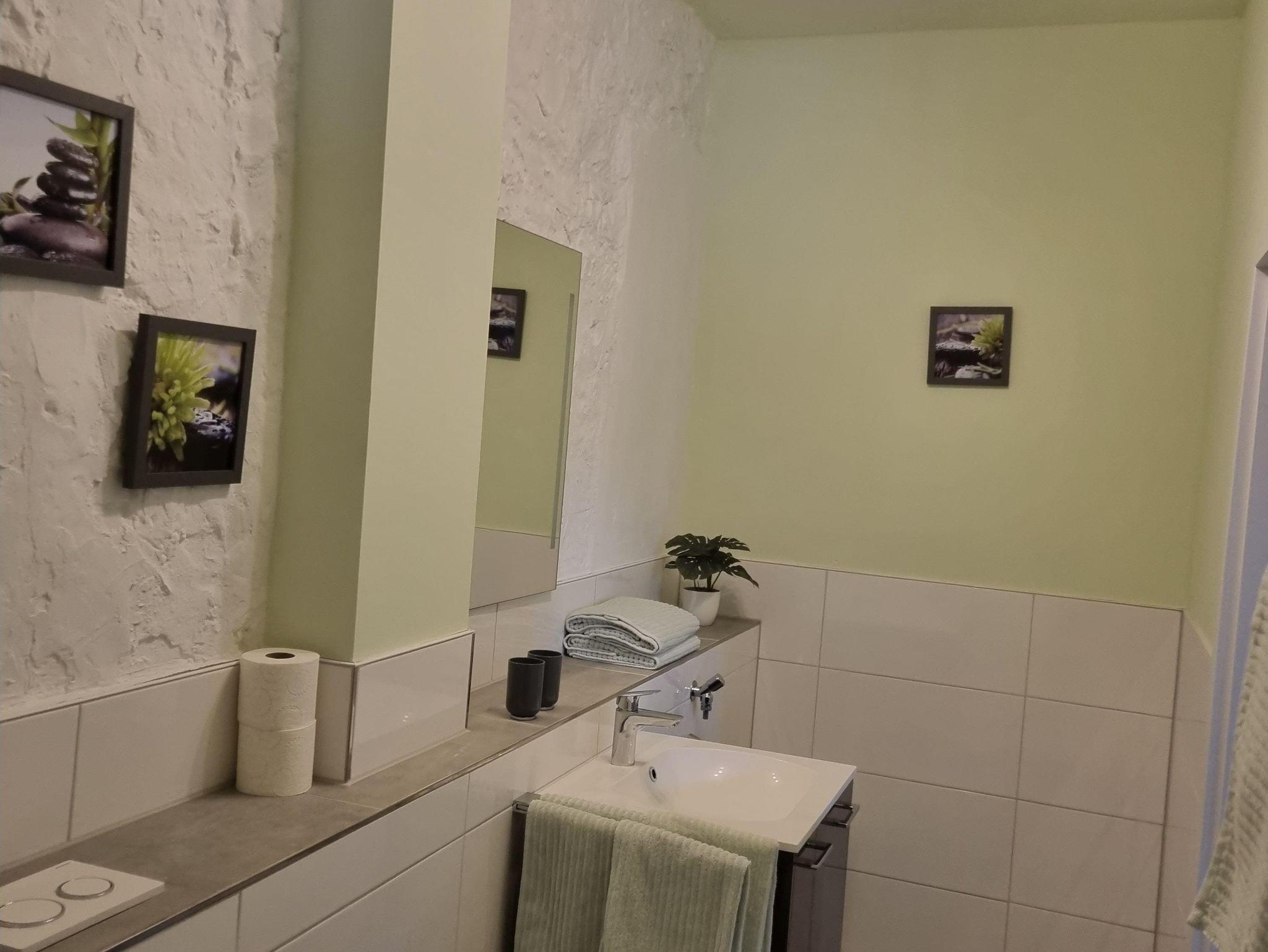 Küchentücher, Hand- u. Duschtücher sind vorhanden. Modernes Badezimmer mit großzügiger Dusche u. Handtuchtrockner.